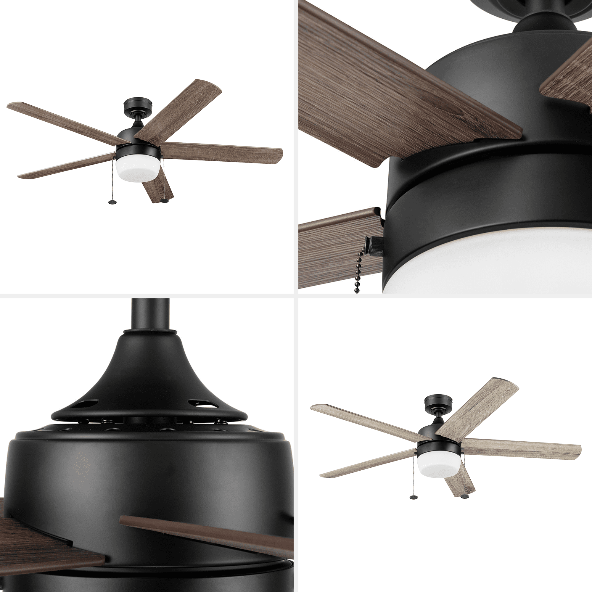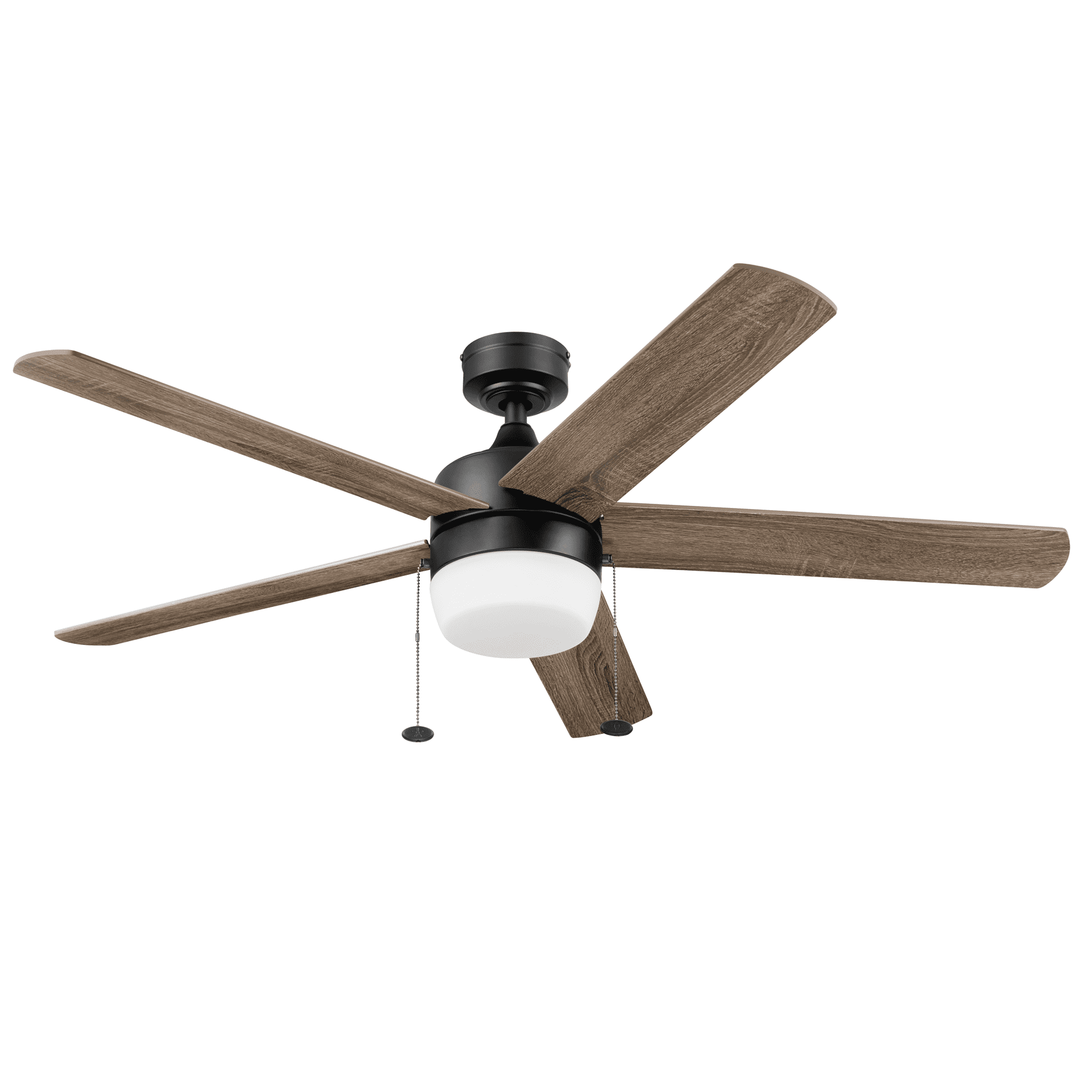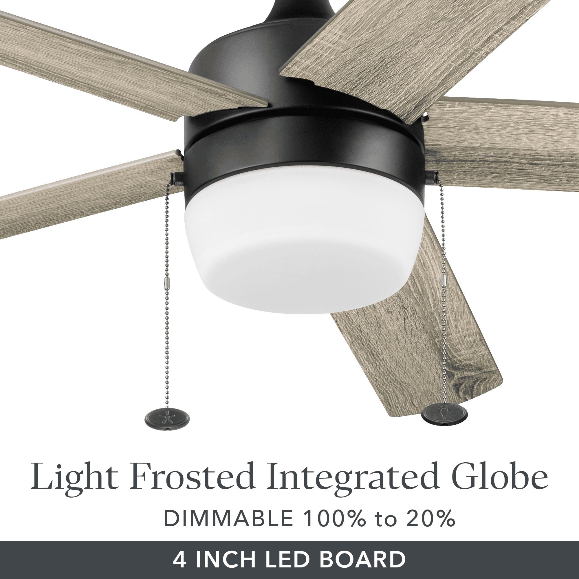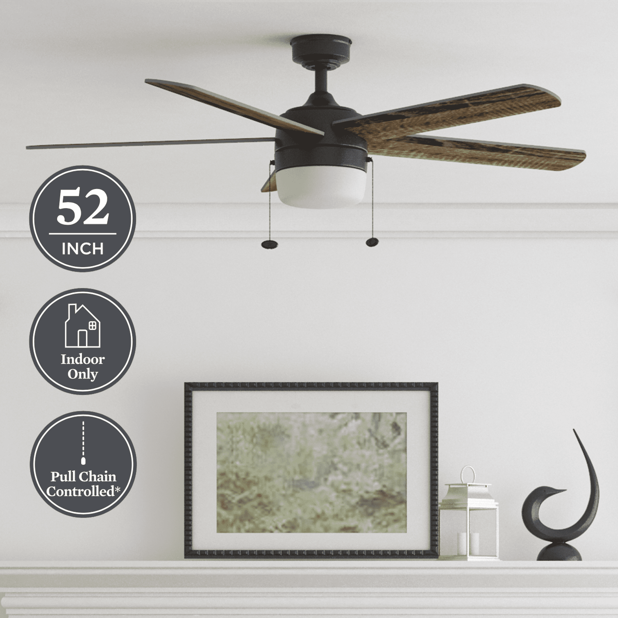 Keep Cool With The Correct Ceiling Fan Size: This 52 inch indoor ceiling fan is ideal for large areas up to 400 sq. ft. such as bedrooms and living rooms. Two Hanging Options: Standard mount option uses the 4 inch downrod that is included; Angled mount option allows for hanging on vaulted ceilings with a longer downrod (sold separately) Ceiling Fan With Light: Includes a frosted integrated glass globe Integrated LED light kit features 5 color temperatures: Cool Daylight (6500K), Daylight (5000K), Cool White(4000K), Warm White (3000K) or Soft White (2700K) Reversible Blades: Choose between Rough Pine and Burnt Coffee finishes to best complement your space Pull Chain Control: Easy-to-use pull chains are included for quick adjustments to the light and speed settings Crafted With High-Quality Material: The high-capacity motor delivers powerful airflow and quiet performance for years to come; This durable and modern ceiling fan is designed for long lasting comfort; ETL listed