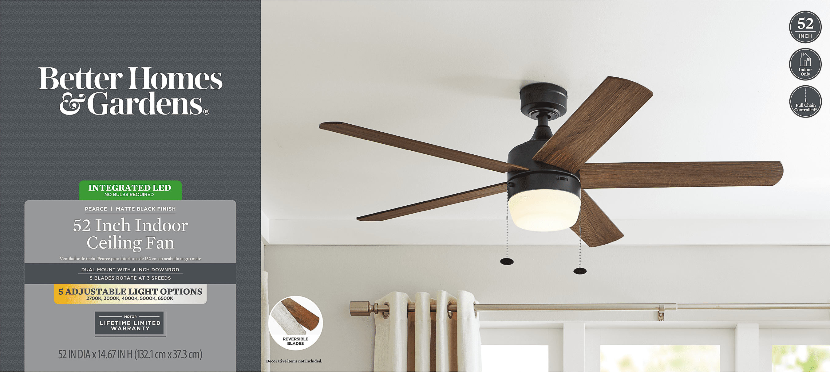 Better Homes & Gardens 52″ Pearce Modern Black Indoor Ceiling Fan with Light, Adjustable Color Temperature & Reverse Airflow