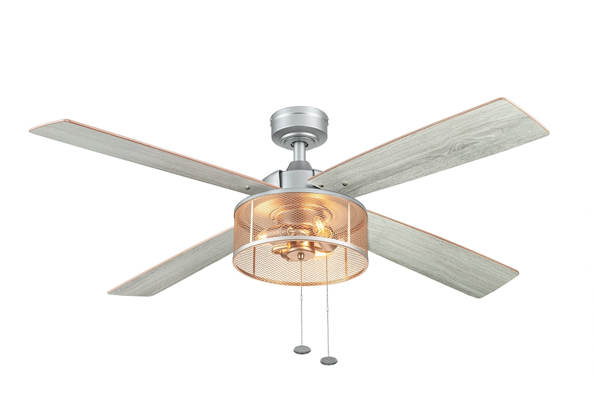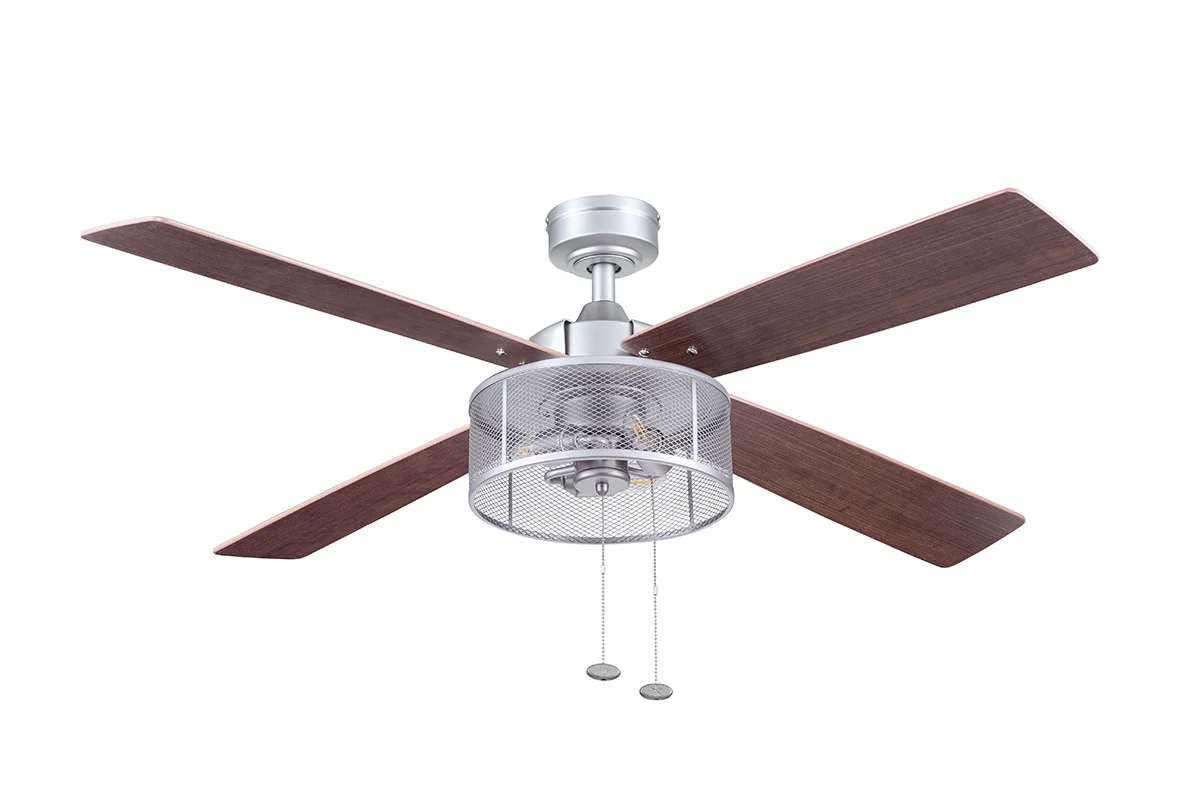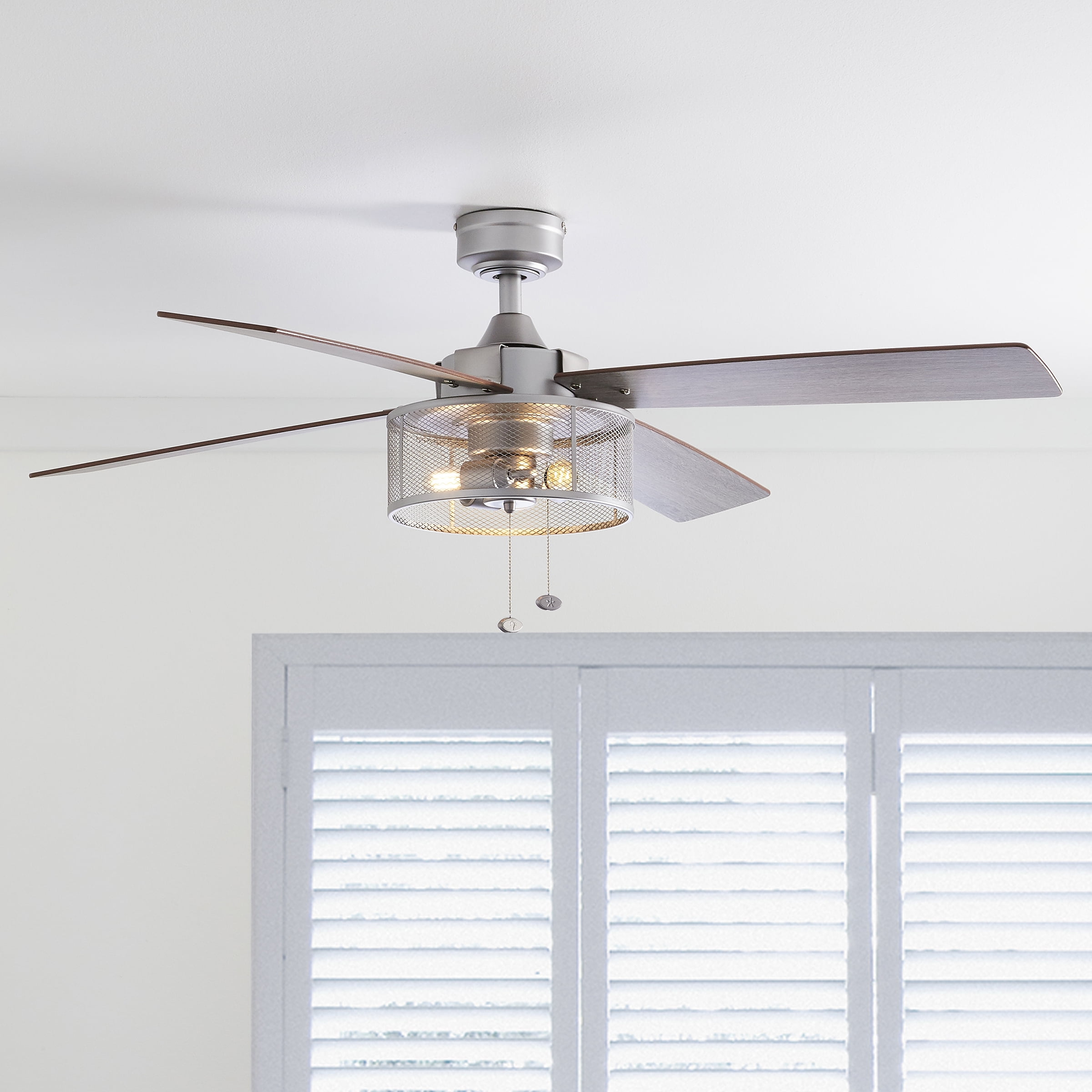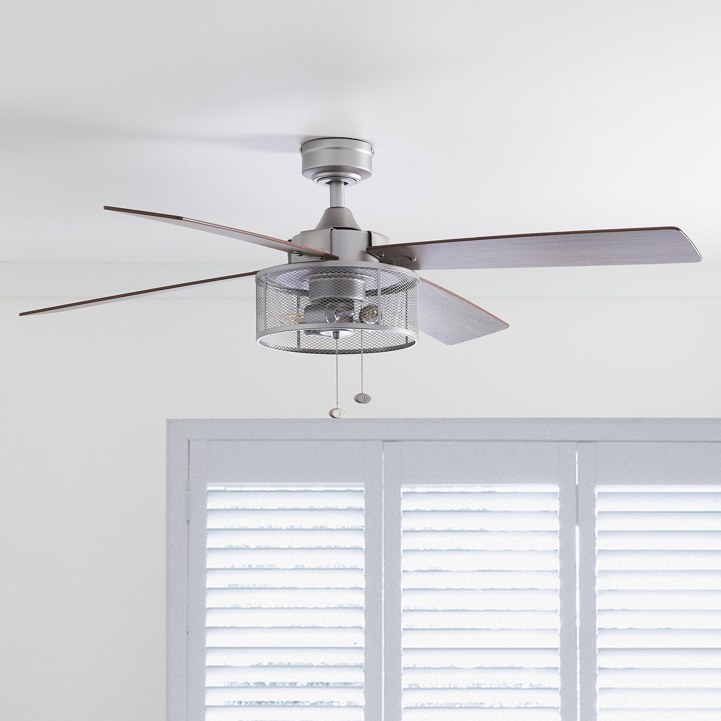 Keep Cool With The Correct Ceiling Fan Size: For ultimate performance, choose the best ceiling fan size for your room; This 52 inch ceiling fan is ideal for medium to large rooms up to 400 sq. ft. such as bedrooms, dens, dining rooms, and more Modern Blades to Suit Your Home: This contemporary 4 blade fan provides ultimate airflow; These fan blades deliver maximum circulation at high speed; Blades have modern lines and contemporary style Dual-Mount Hanging Options: A multi-position fan with 2 hanging options; Standard option offers a 4 inch downrod (included); Angle option allows for hanging on vaulted ceilings with a longer downrod (sold separately) Crafted With High-Quality Material: The high-capacity motor delivers powerful airflow and quiet performance for years to come; This durable and modern ceiling fan is designed for long lasting comfort; ETL listed Reversible Fan For All Seasons: Improves air circulation in winter and summer; During summer, this ceiling fan optimizes airflow to enhance comfort; During winter, change the direction to evenly distribute warm air on low speed A Ceiling Fan For Indoor Rooms: This room fan is perfect for your living room, kitchen, bedrooms, or dens where increased airflow can make a room more comfortable Pull Chain Control: Control your Better Homes & Gardens ceiling fan with the 2 pull chains; 1 chain operates the fan’s 3 speeds while the other turns the light kit on and off Ceiling Fan With Light: Easily control your fan light with the convenient pull chain; 2 E26/ B11 LED bulbs (included) are energy-efficient and longer lasting Dual-Finish Blades: This fan comes with a different finish on each side of the blades; Choose between Gray Oak and Light Oak; Pick the finish that best fits your space