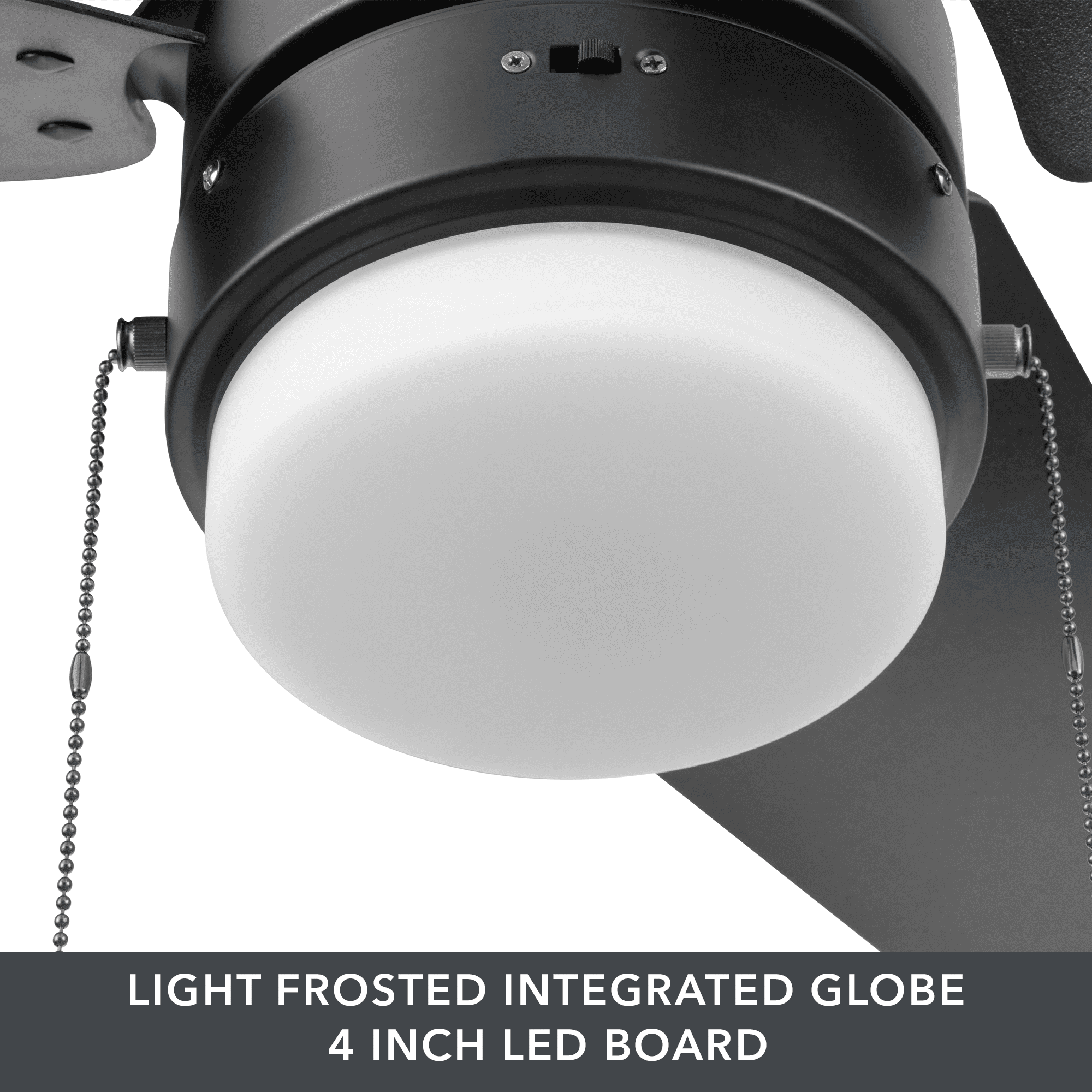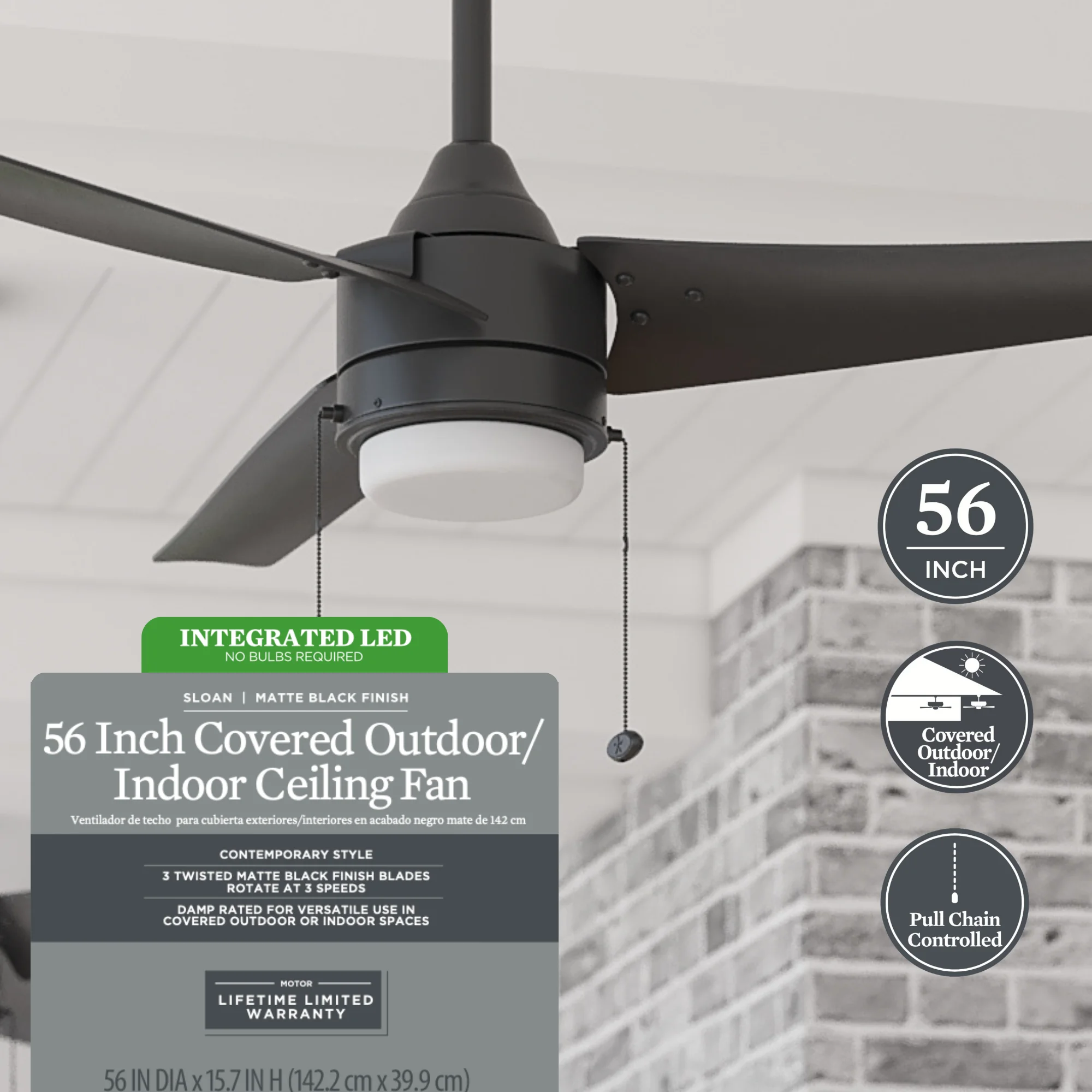 Damp rated for covered outdoor spaces such as porches and garages; can also be hung indoors Modern matte black finish, 3 twisted plastic blades Frosted globe light kit houses dimmable integrated LED board (2000 lumens, 21 watts) Can be hung from standard or angled ceilings using the 6-in downrod that is included Easy-to-use pull chains are included for quick adjustments to the speed settings and light output Quiet, reversible motor circulates cool air in the summer and warm air in the winter, cutting down on energy costs 56 IN L x 56 IN W x15.7 IN H