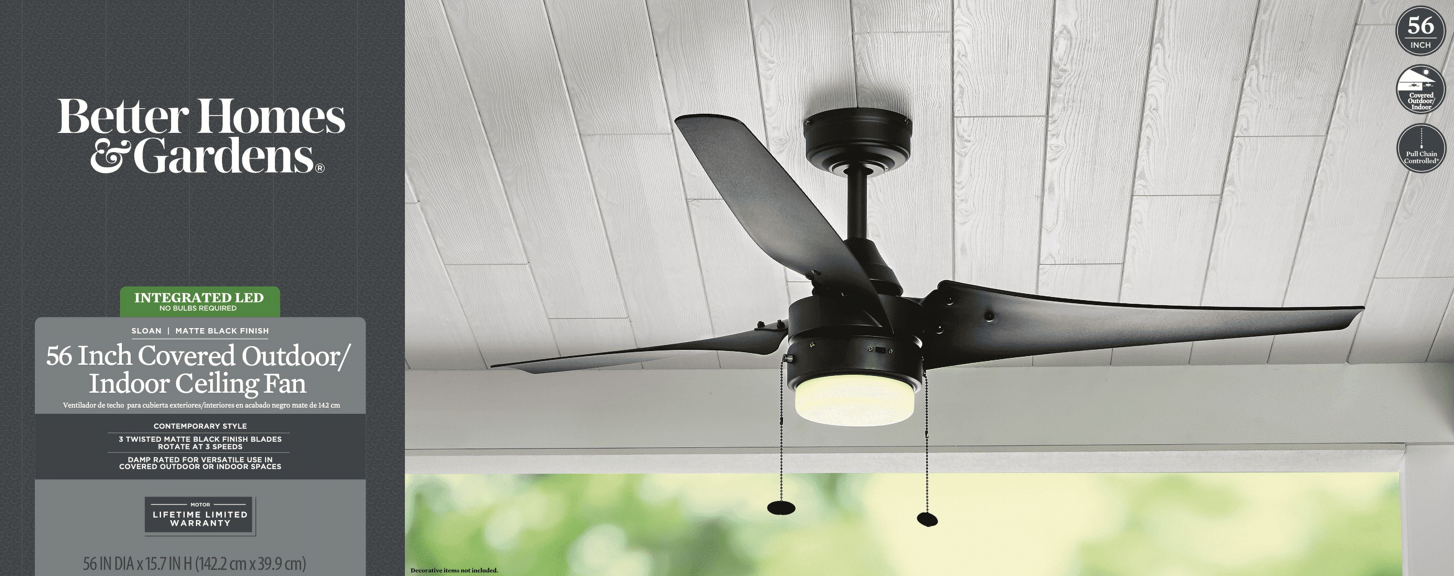 Better Homes & Gardens 56” Black Indoor/Outdoor Ceiling Fan with 3 Blades, Light Kit, Pull Chains & Reverse Airflow
