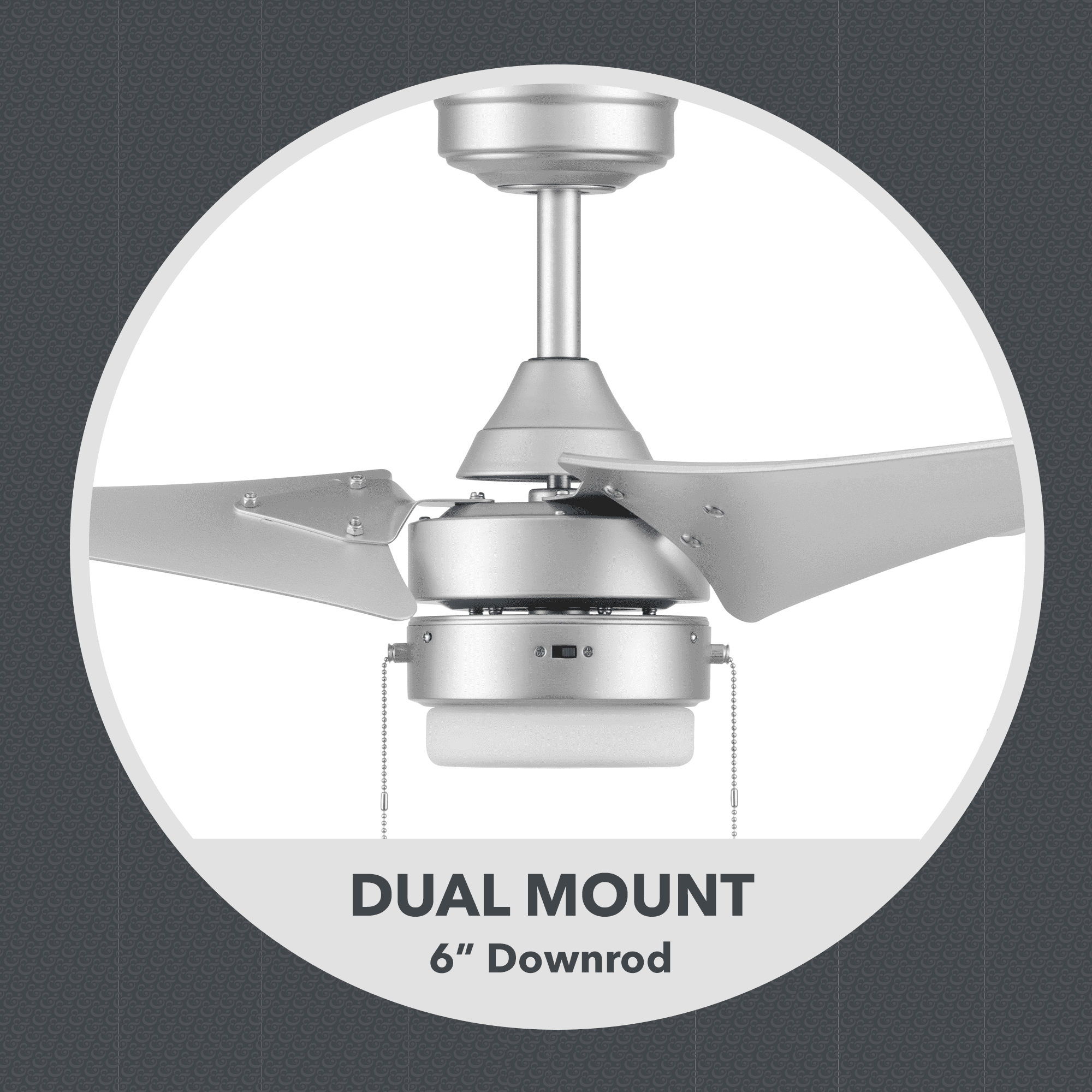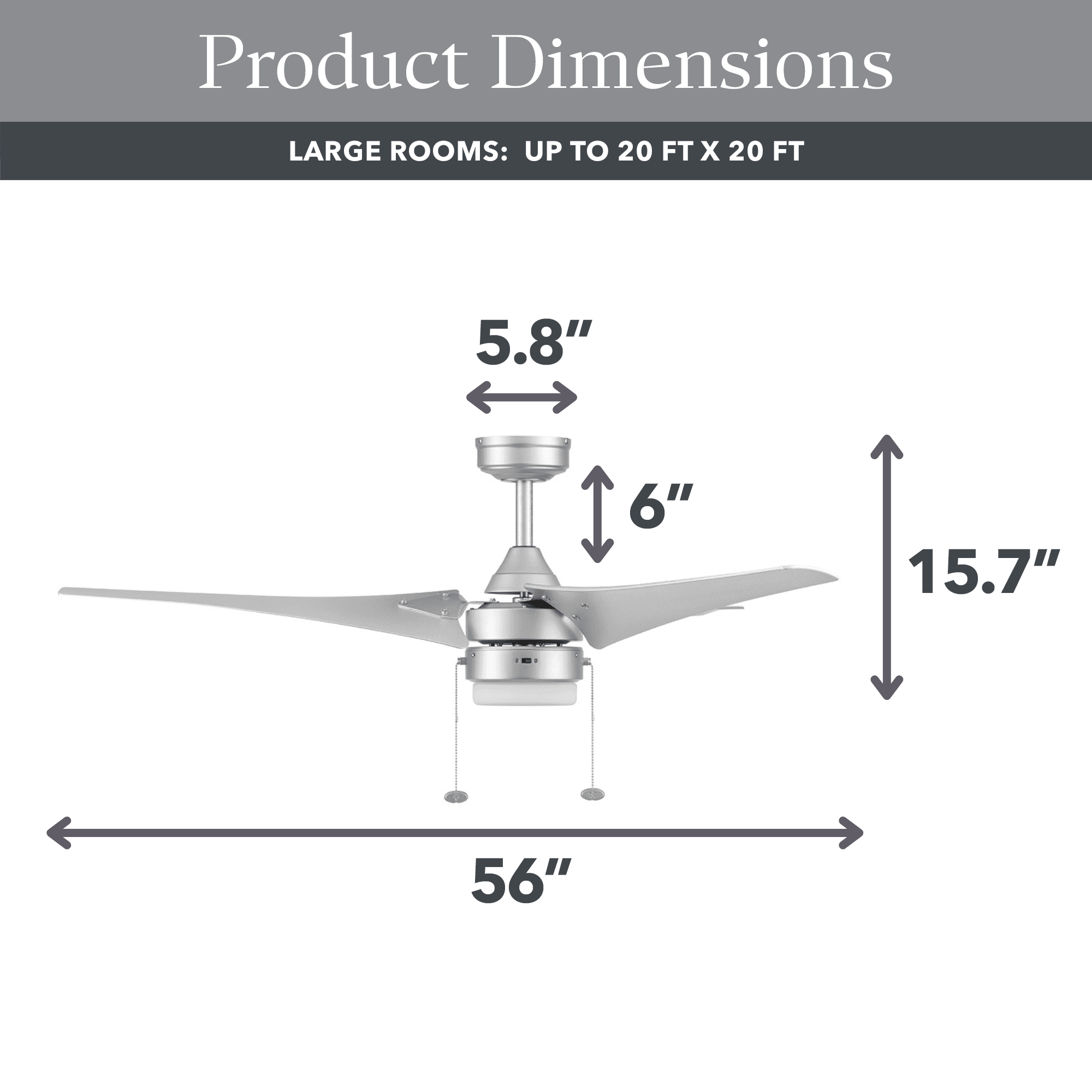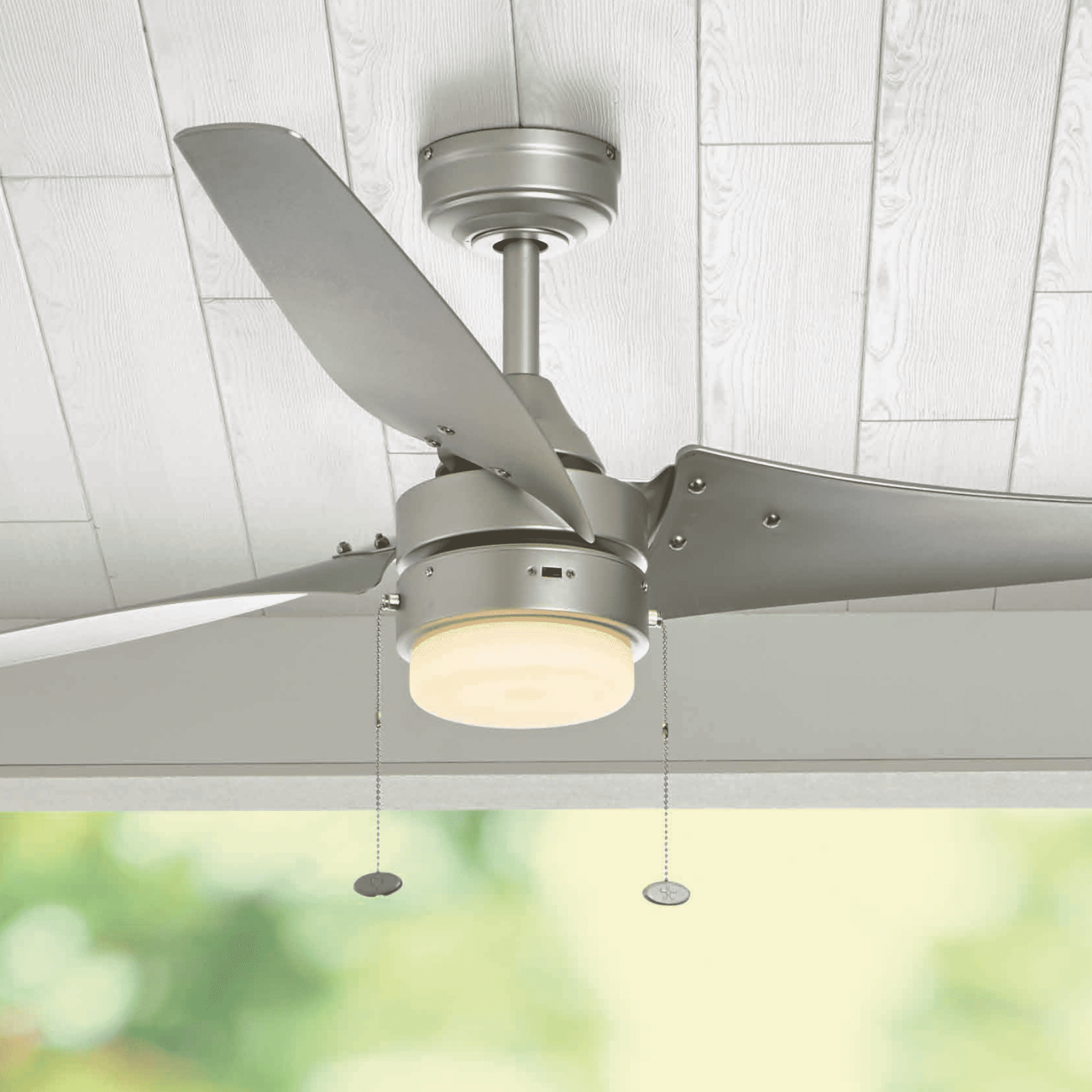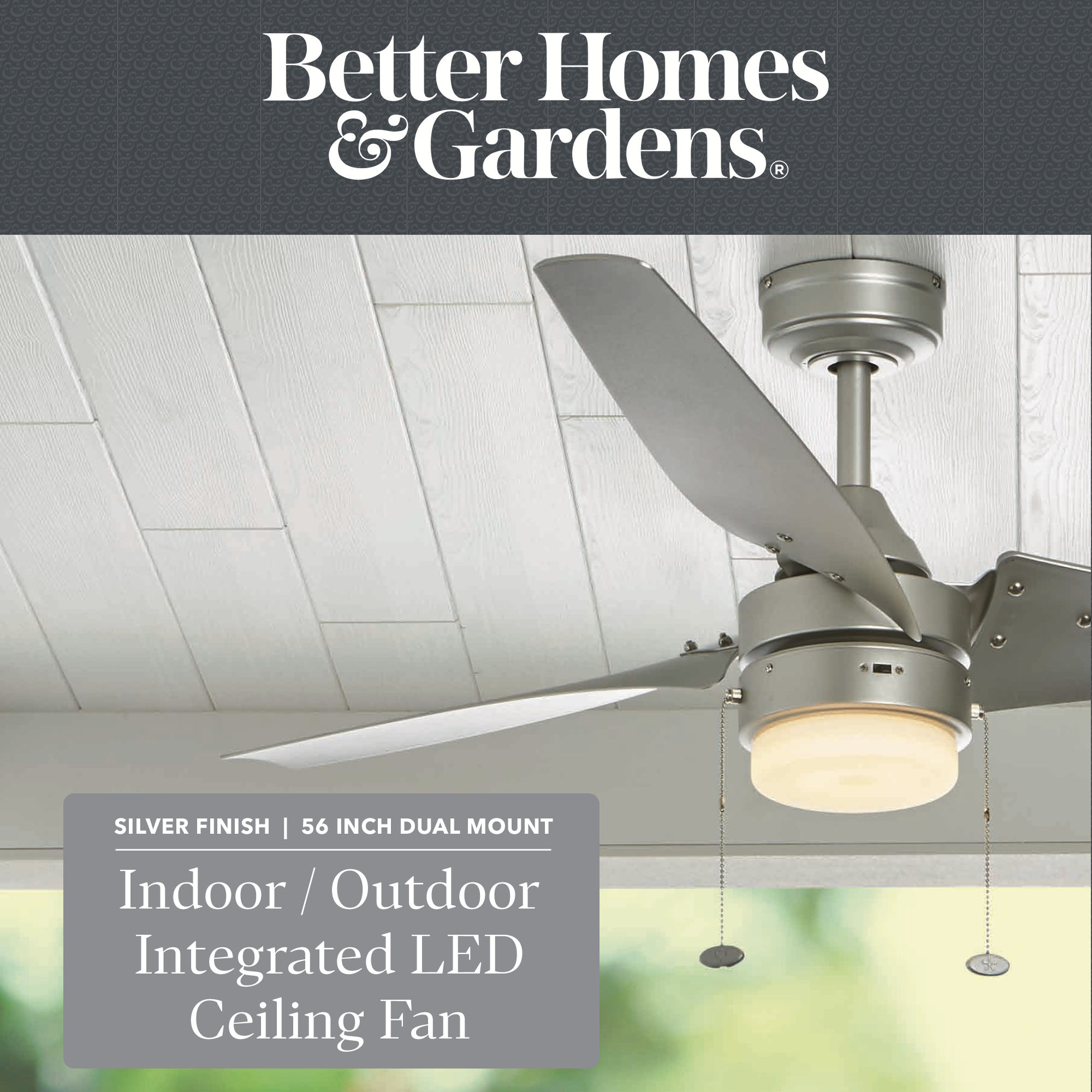 Better Homes & Gardens 56″ Silver Indoor/Outdoor Ceiling Fan with Integrated LED Light Kit: Damp rated for covered outdoor spaces such as porches and garages; can also be hung indoors Silver finish, 3 twisted plastic blades Frosted globe light kit houses dimmable integrated LED board (2000 lumens, 21 watts) Can be hung from standard or angled ceilings using the 6-in downrod that is included Easy-to-use pull chains are included for quick adjustments to the speed settings and light output Quiet, reversible motor circulates cool air in the summer and warm air in the winter, cutting down on energy costs 56 IN L x 56 IN W x15.7 IN H