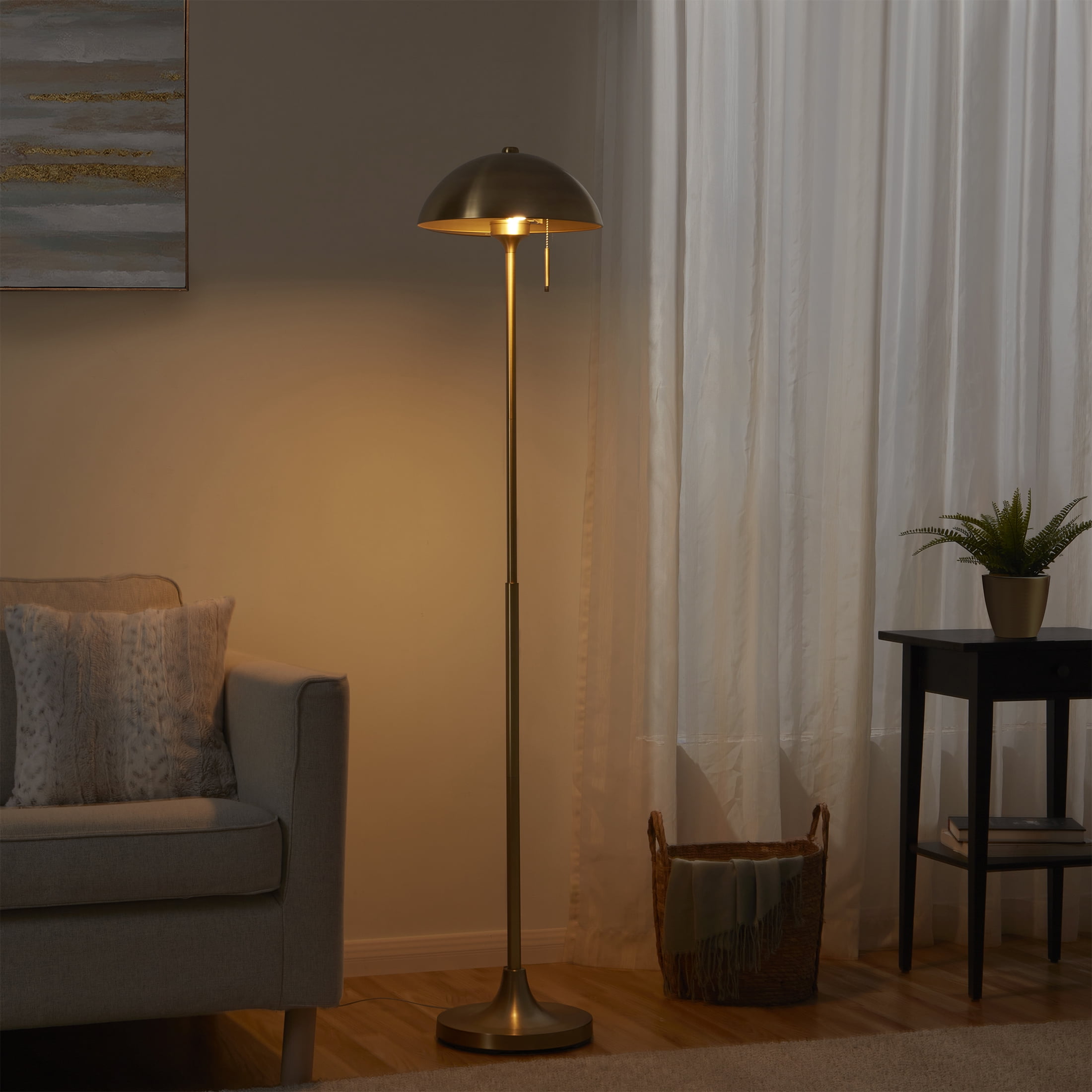 Better Homes & Gardens 62″ Modern Pull-chain Brass Floor Lamp with Brass Dome Brass standing floor lamp with a sleek, modern design Dome-shaped shade paired with a tulip-shaped base for a stylish look Available in elegant brass or classic black finishes Sturdy round base ensures stability Overall lamp height of 62 inches, perfect for various spaces