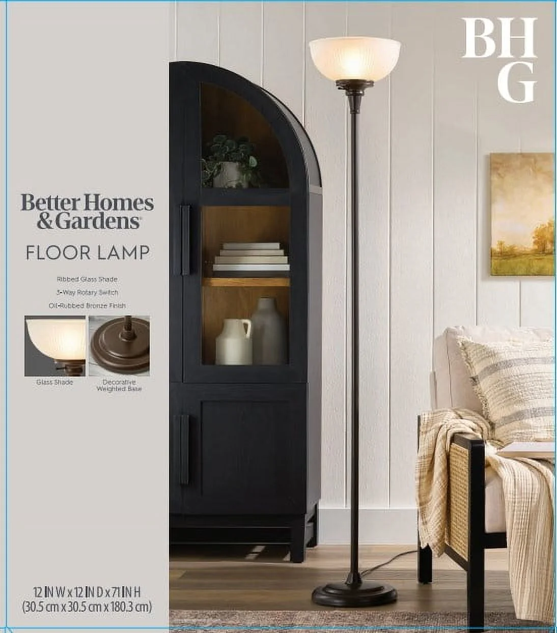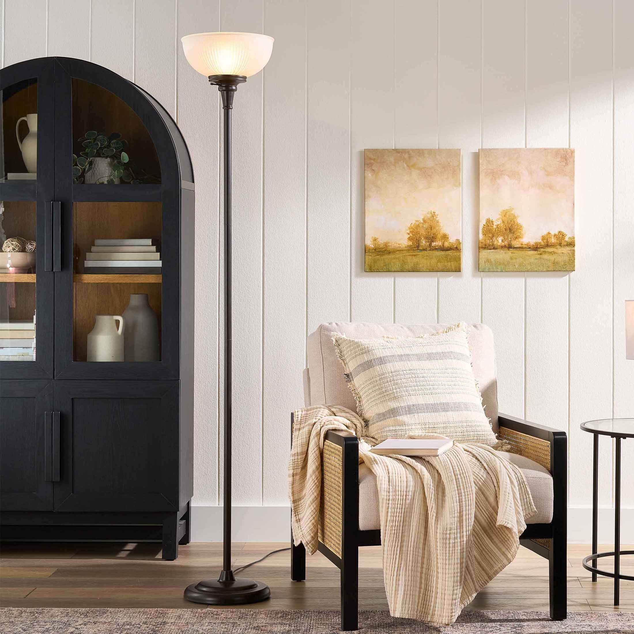 This 71“tall Better Homes and Gardens New Oil Rubbed Bronze Floor Lamp, model # BH6526057317084, with its painted ORB metal finish will be a perfect fit and bring charm to your décor. The Better Homes & Gardens Floor Lamp includes a white ribbed glass shade that is 12 IN in diameter and has a single light socket for one bulb (150W – not included) and will create a cozy warm inviting ambiance on nights when you are curled up on the couch or in a chair reading, crocheting or just watching TV. The floor lamp has a rotary switch and is easy to turn the lamp on or off and has a sturdy durable metal base. With a simple and elegant design, you can proudly display it anywhere you prefer. It will work in small or large rooms – your living room, bedroom or adult home office and will add a tasteful modern touch to your décor style.