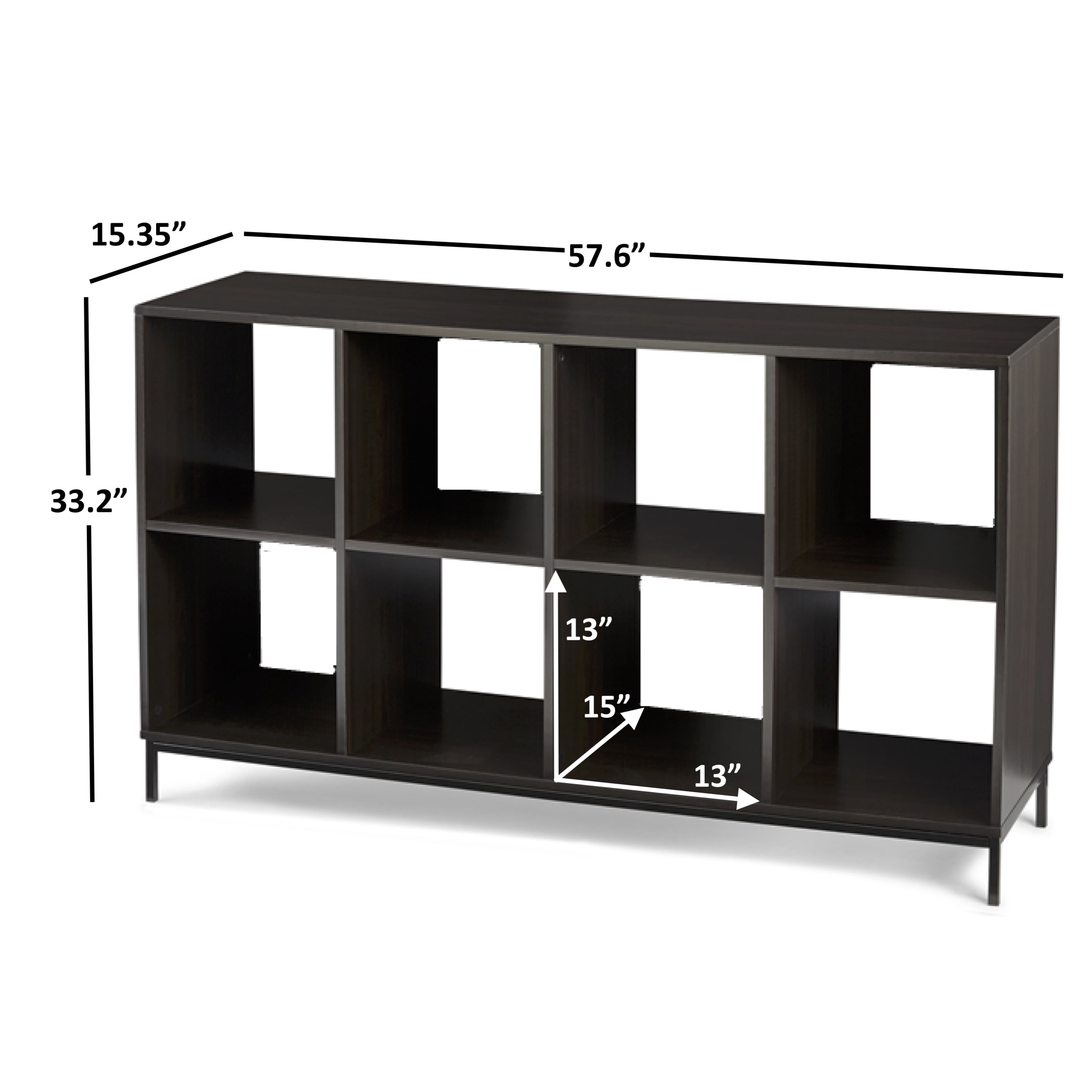 Better Homes & Gardens 8-Cube Storage Organizer with Metal Base, Espresso Stylish cube organizer and bookcase with a metal base and legs to provide sturdy support Features eight 13″ x 15″ x 13″ open back cube spaces Compatible with Better Homes & Gardens Cube Storage Bins (sold separately) Frame and shelves measure 1″ (25mm) in thickness Top panel can support up to 100 lbs, each cube supports up to 30 lbs Dimensions: 57.6″ W x 15.35″ D x 33.19″ H Weight: 56.76 lbs Materials: particleboard, medium density fiberboard, iron, paperboard and polypropylene Can be combined with other Better Homes & Gardens Storage Organizers and Shelves (sold separately) Finishes available: Rustic Gray (BH17-084-098-06), Espresso (BH17-084-098-03), White (BH17-084-098-09) and Vintage Walnut (BH48-084-099-35) Includes wall attachment system for safety Easy to assemble with included instructions Tools required: hammer, Phillips head screwdriver, flat head screwdriver Site to Store Pickup Note: This item is packaged in one large box that may not fit in a standard-sized vehicle. Please make sure you have a large car or truck for store pickup. Package dimensions: 60″ x 7.5″ x 18″ Package weight: 65.89 lbs Assembly Instructions: Better Homes & Gardens 8-Cube Organizer with Metal Base For customer support or assembly assistance, visit huisenfurniture.zendesk.com or call 1-800-729-1569.