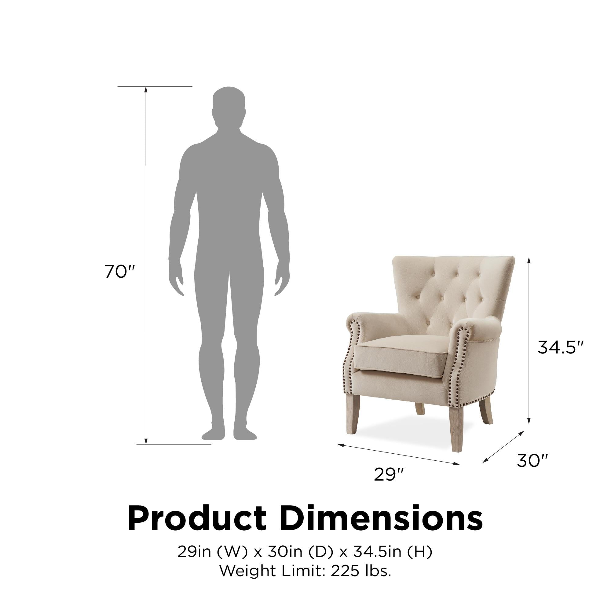 Mid-century modern arm chair perfect for your living room, bedroom and home office. Great desk chair for hours of comfort and support for adults while working on the computer from home. Durable and reliable frame with solid wood legs in a rustic finish. Upholstered in a soft twill fabric with an antique silver nailhead trim. Designed with rolled arms and channel shaped back with button tufting. Ships in one box. Minimal assembly required. 1-year limited warranty. Product dimensions: 29″L x 30″W x 34.25″H. Seat dimensions: 18.5″L x 21.75″W x 19.5″H. Weight limit: 225 lbs. Net weight: 31.9 lbs. Shipping dimensions: 30.5″L x 30″W x 29″H. Gross weight: 41.25 lbs.