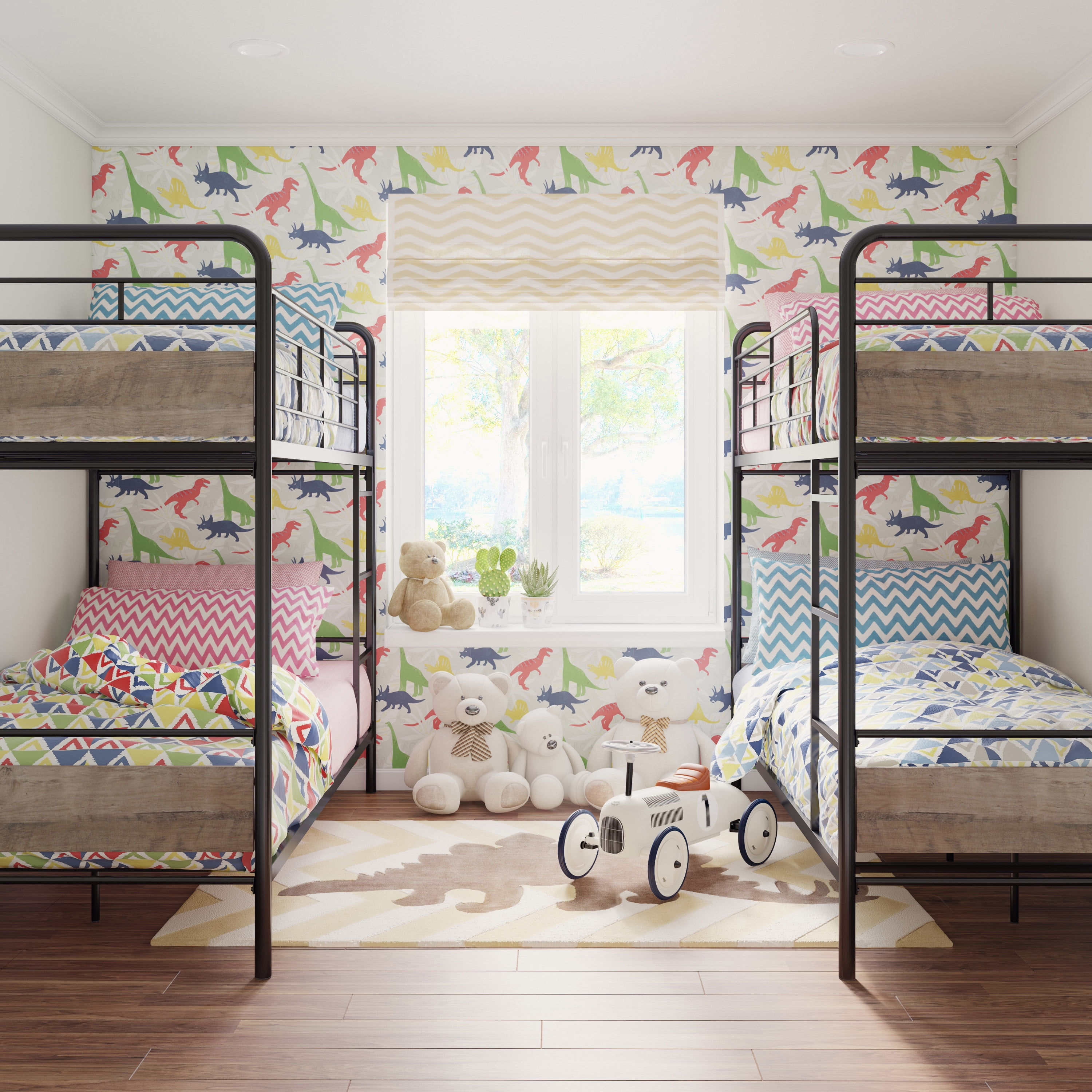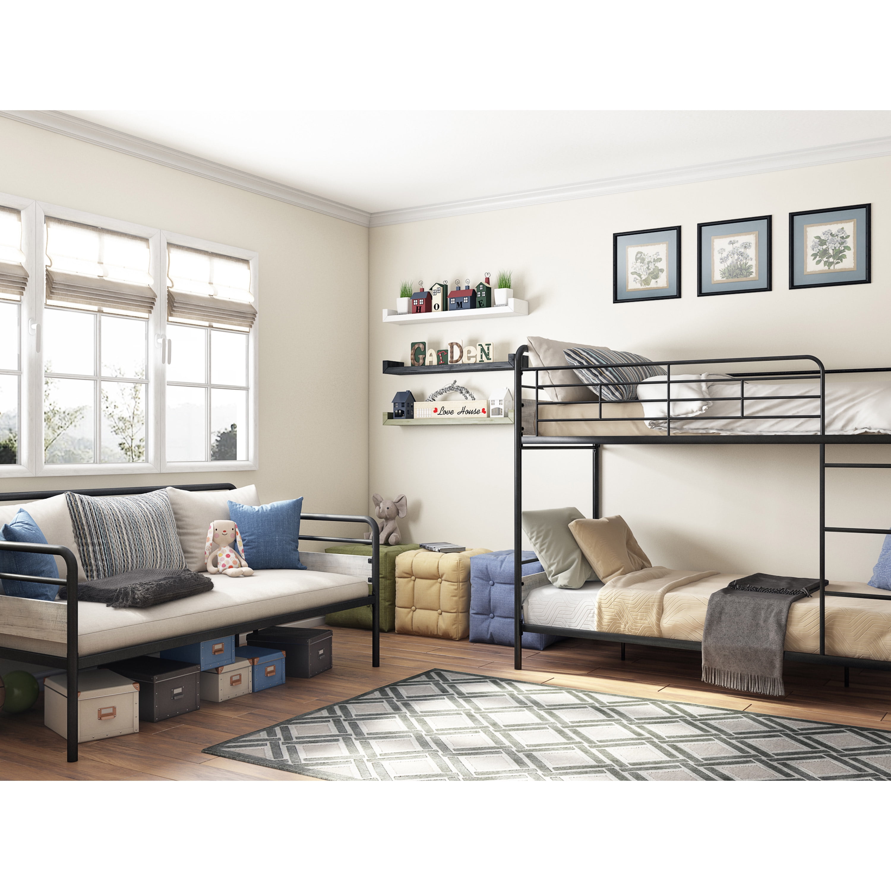 The contemporary design of the Better Homes & Gardens Anniston bunk bed is ideal for maximizing space in any bedroom or decor. The twin over twin bunk is perfect for creating a fun living room for children to sleep, read and play. The space-saving bunk bed is also a great addition to a guest room for family gatherings. The sturdy metal mattress slats provide ample support for kids or guests and fit standard twin-size mattresses. Rustic gray accent panels complement the metal design and match most any decor. Whether you’re decorating your vacation home, children’s room, or guest room, the Anniston bunk bed is safe and secure for everyone. Guardrails and a ladder are included for added security on the top bunk bed for kids to sleep safely while parents stay worry-free. The Better Homes & Gardens Anniston twin over twin bunk bed coordinates with the Better Homes & Gardens Anniston day bed (sold separately) for even more sleeping and lounging options.