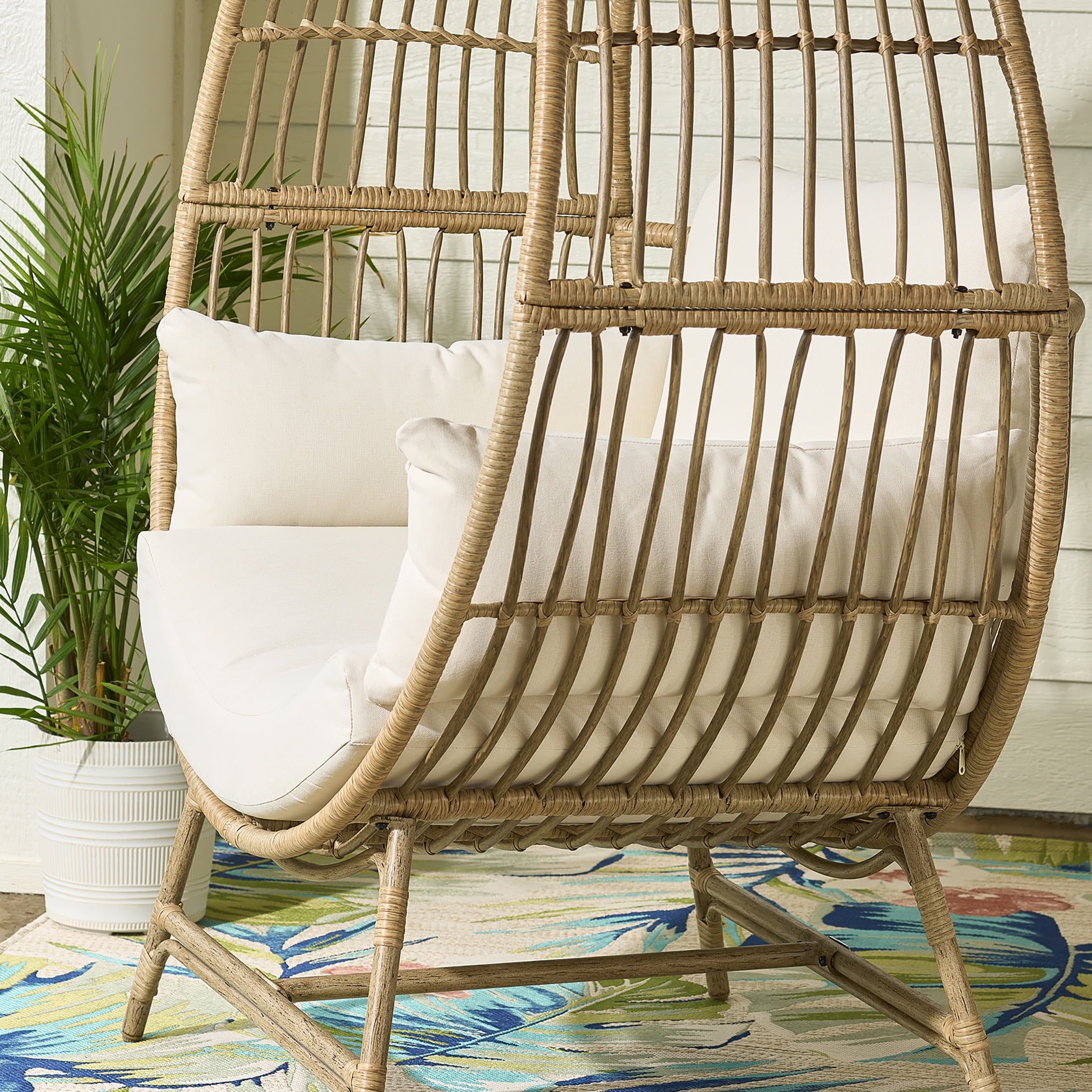 Better Homes & Gardens Bellamy Round Wicker Outdoor Egg Chair, Beige Materials & Construction: Handwoven all-weather wicker | E-coated and powder-coated steel frame for rust resistance Configuration & Dimensions: 33.07″L x 48.33″W x 59.84″H Weight Capacity: Up to 350 lbs Comfort Features: Deep seat and plush cushions for all-day relaxation | 3M Scotchgard™-treated fabric resists stains and moisture Weather Resistance: UV-resistant, solution-dyed polyester fabric withstands sun and rain Assembly: Minimal assembly required with included instructions Warranty: Frame: 3-year limited warranty | Fabric: 1-year limited warranty Maintenance Callout: Spot clean with mild soap and water | Store indoors or use a cover to extend longevity
