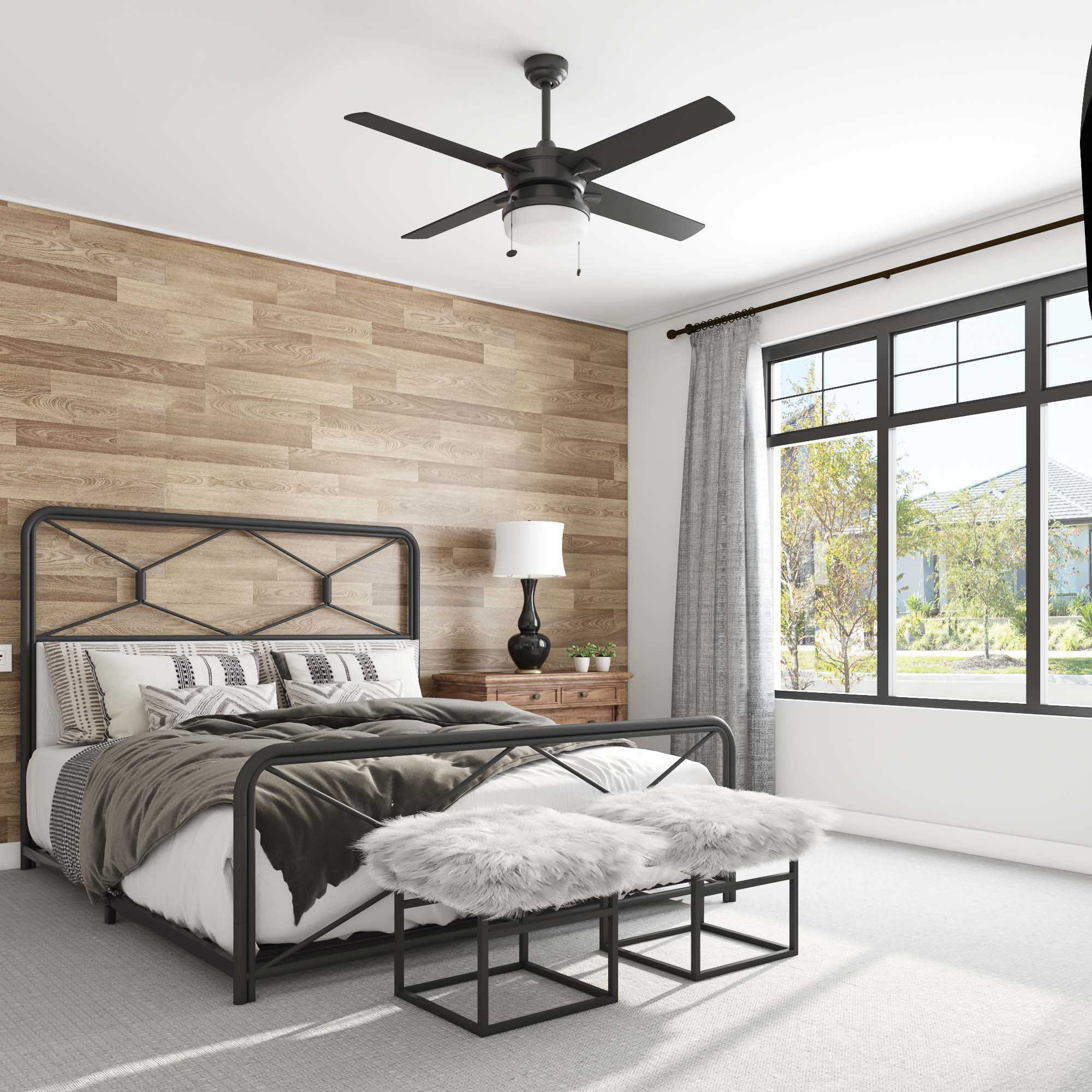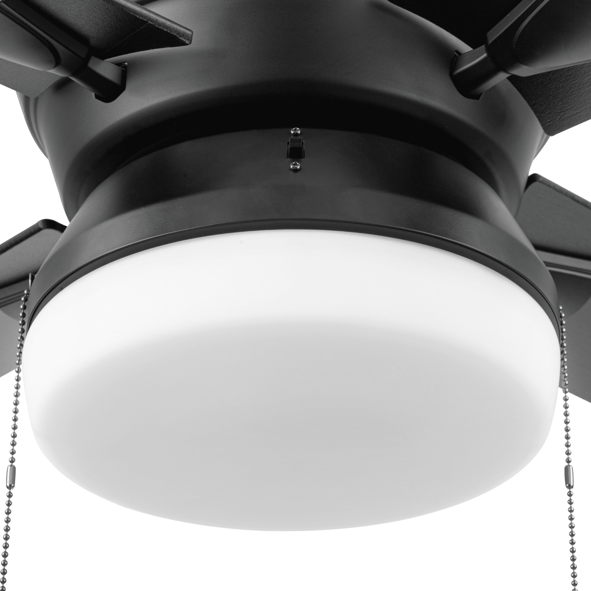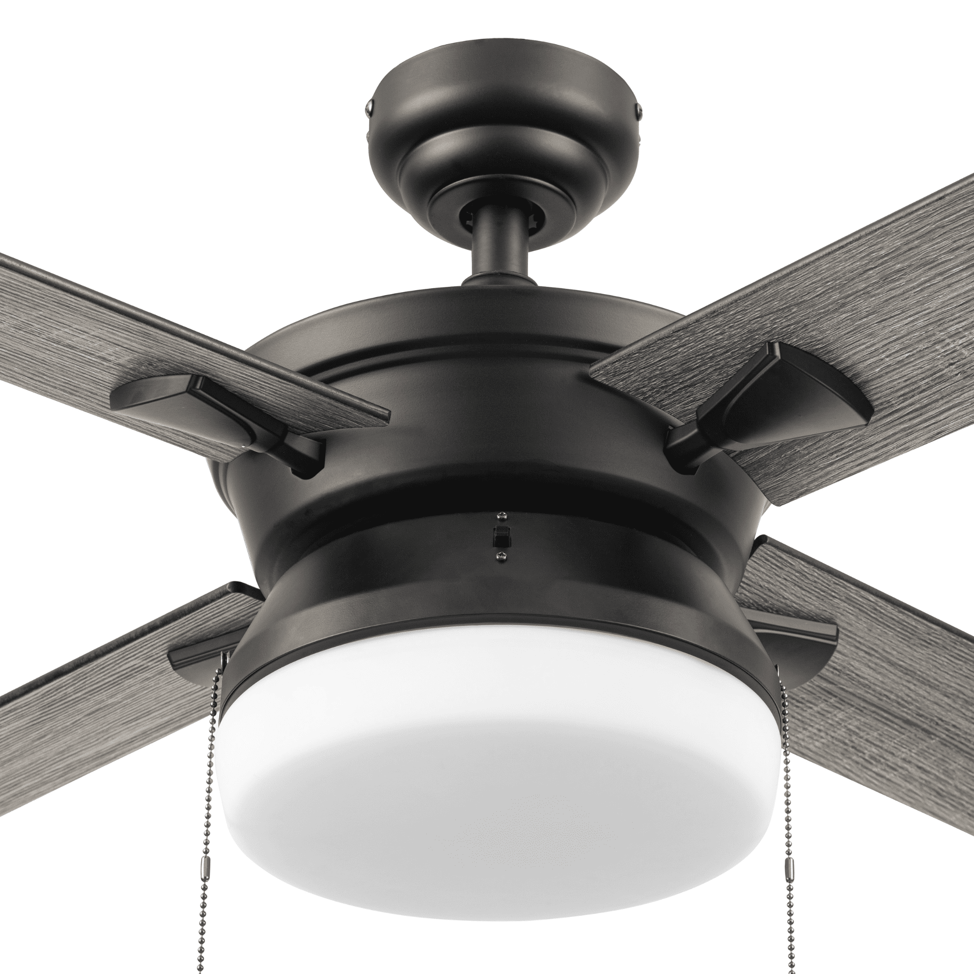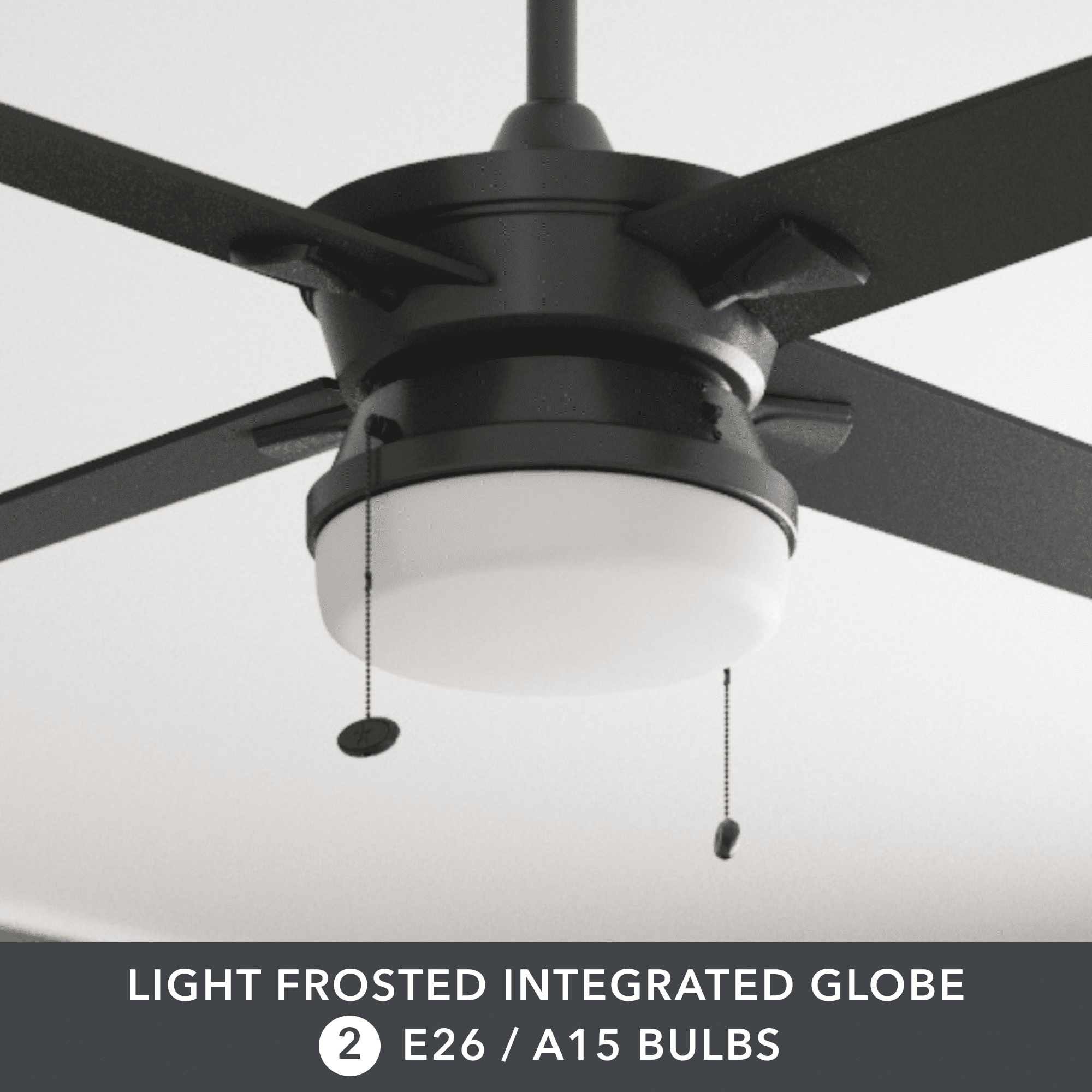 This modern style fan features stylish details and pairs well with most home décor. This matte black ceiling fan has a integrated frosted glass shade, providing beautifully filtered lighting. The 4-blade design provides comforting, adjustable airflow while the LED lights provide ideal lighting for the area. Easily control your ceiling fan’s 3 speeds and turn the light on and off with the traditional pull chains. Use the reversible airflow switch to easily allow you to change the direction of the fan to properly distribute air. During warmer months, this fan will provide a cooling effect or when reversed during the cooler months, it will help distribute warm air. This ceiling fan was created with high-quality materials that are durable and long-lasting and comes with a limited lifetime warranty from the manufacturer. Specifications: Sizing: 52-in 5-blade indoor fan for rooms up to 216 sq. ft. Lighting: 2 x E26/A15 light bulbs included that provide 800 lumens, 8 watts, 2700k color temperature