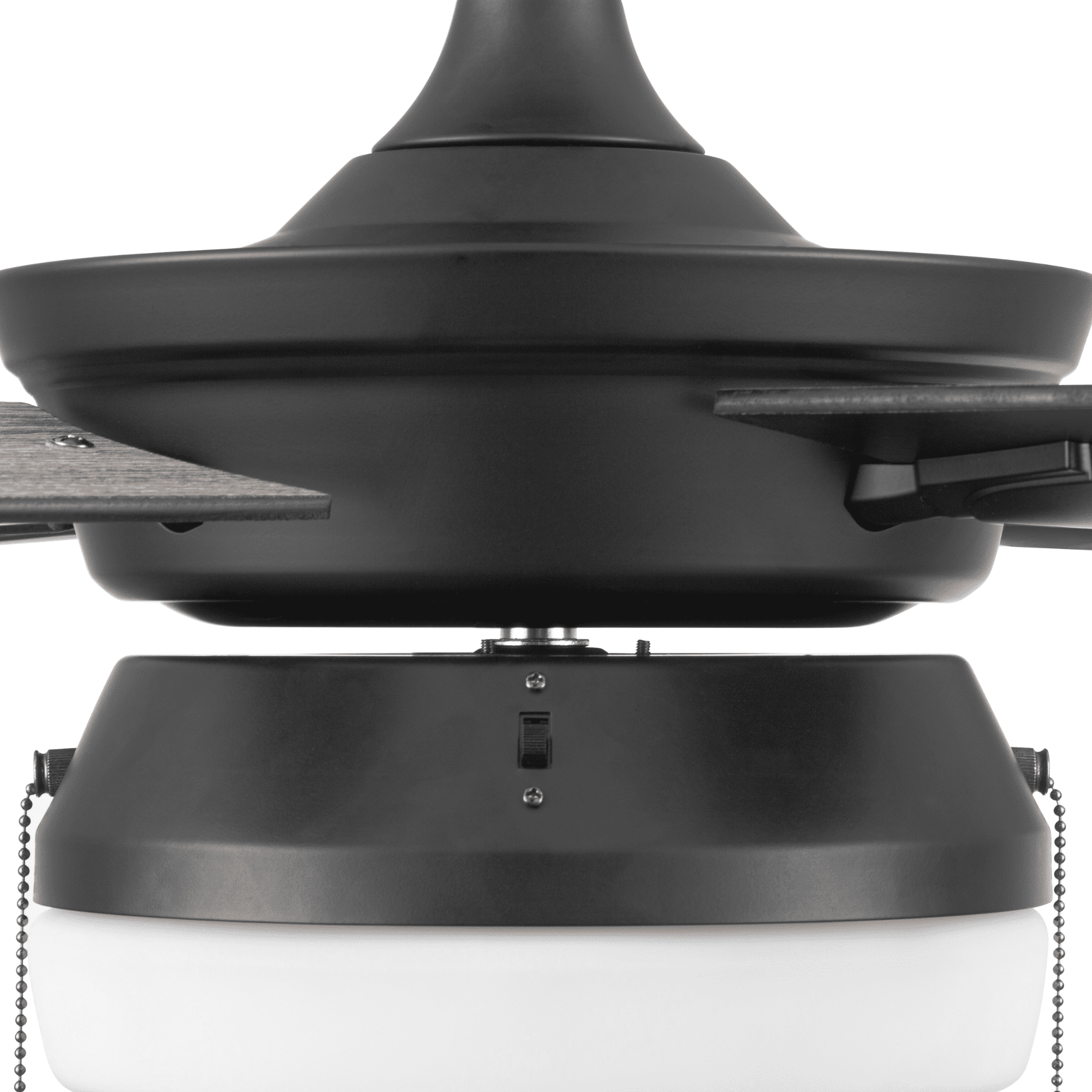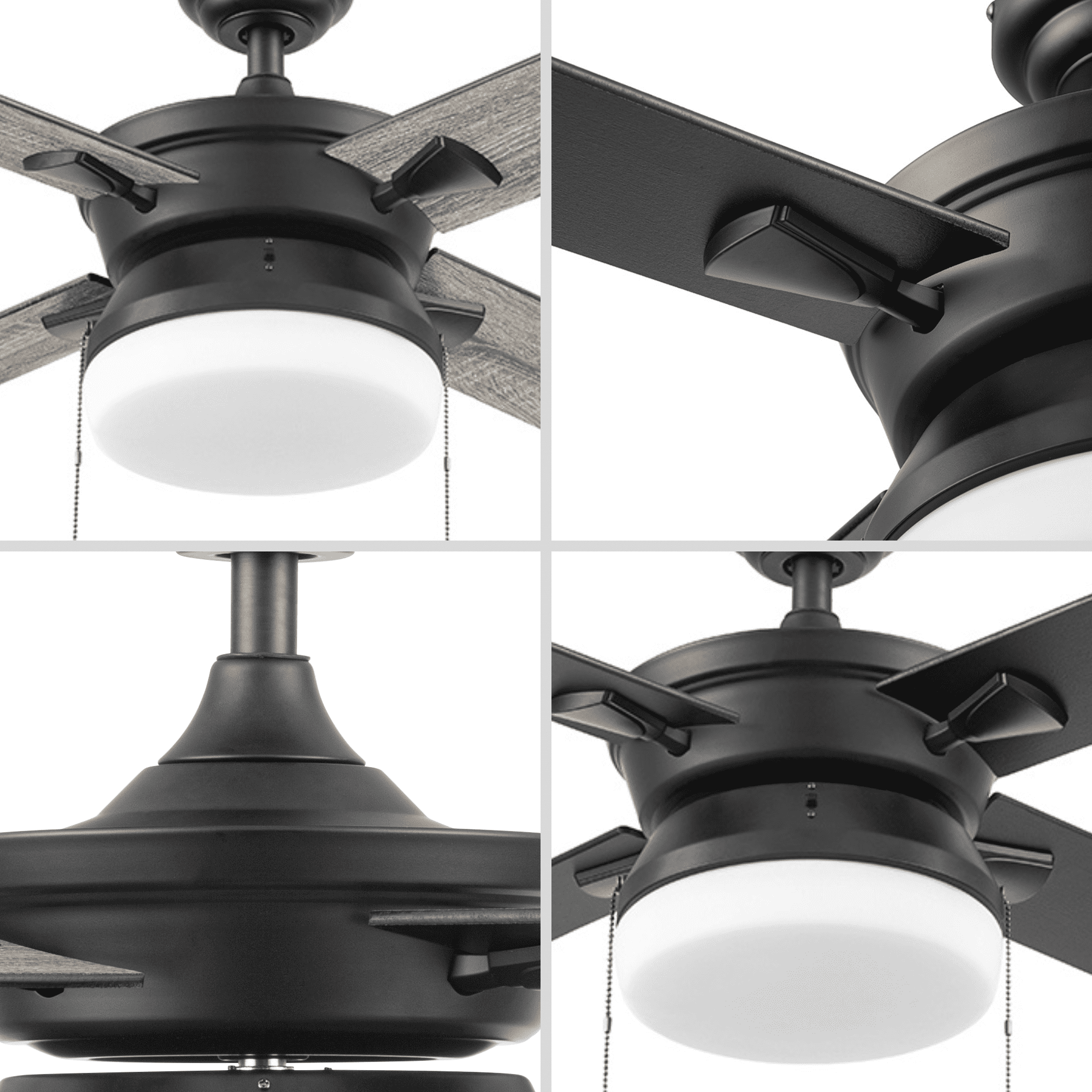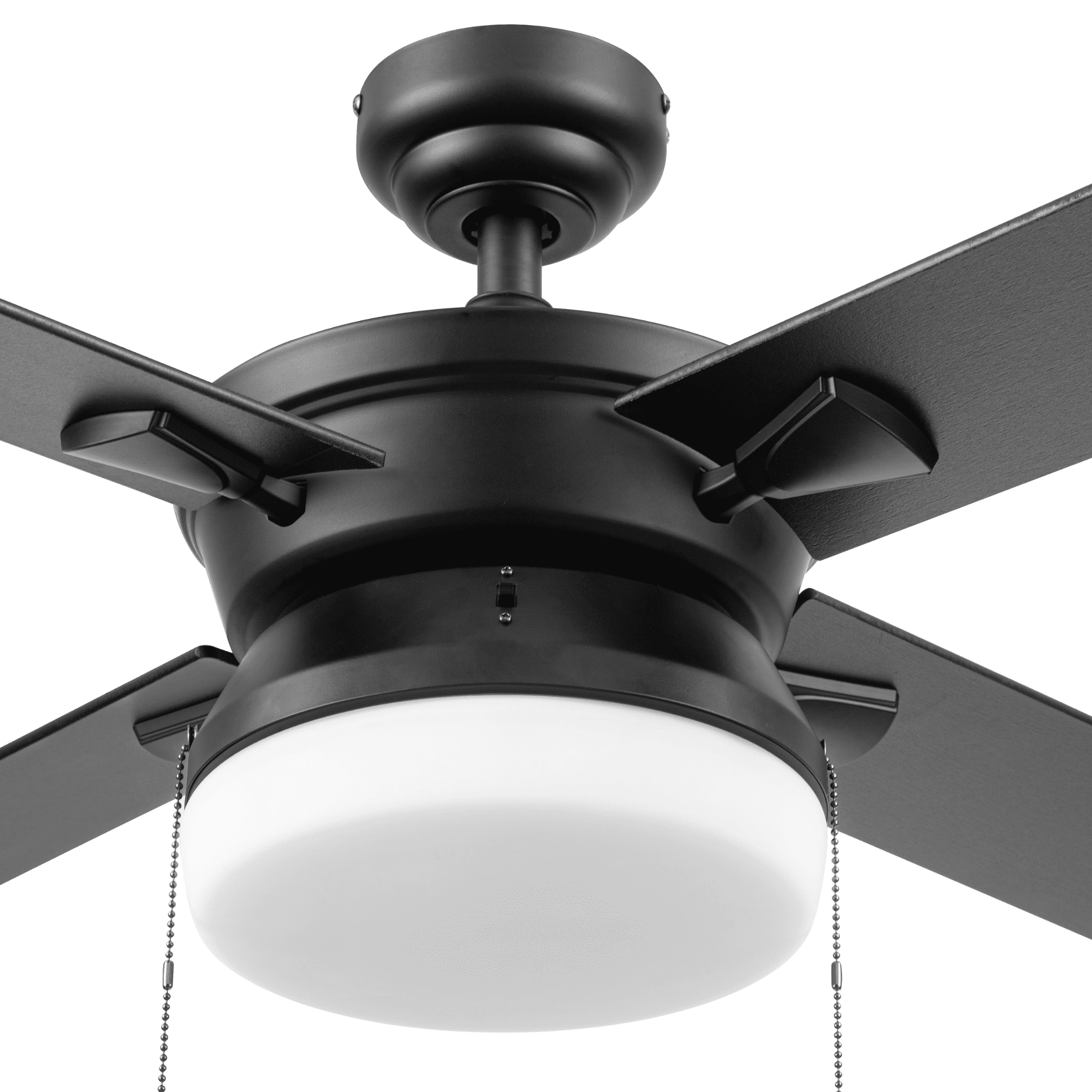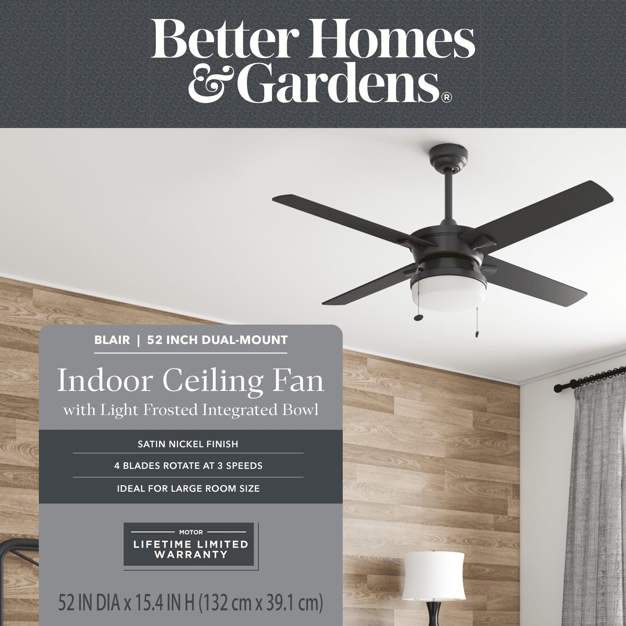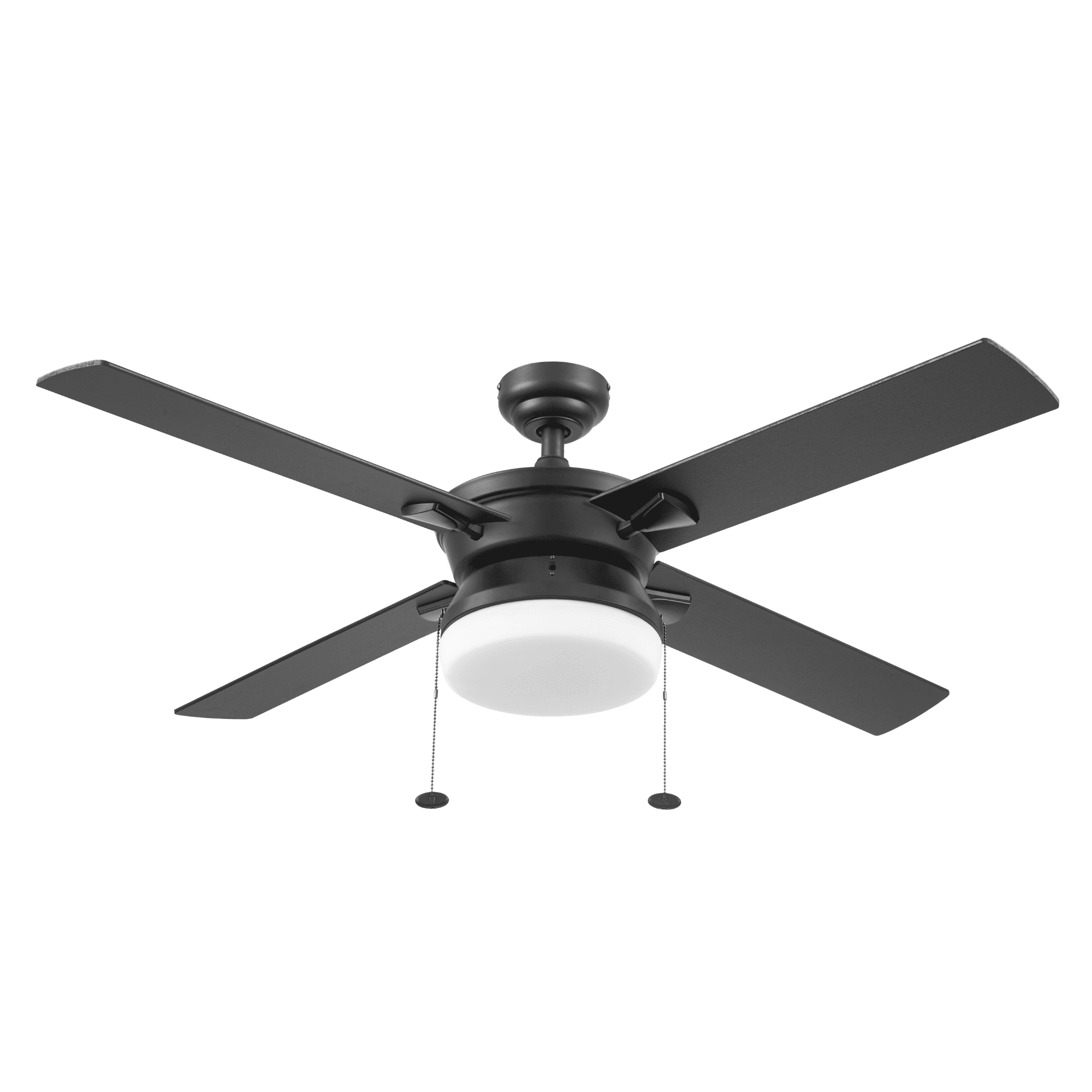 Better Homes & Gardens Blair 52” Black Modern Indoor Ceiling Fan with Light 4 Blades Pull Chains Ideal for medium to large rooms up to 216 sq. ft., such as bedrooms, dens, and dining rooms Offers dual-mount hanging options: standard 4-inch downrod or angled mount for vaulted ceilings (longer downrod sold separately) Reversible fan function enhances air circulation in both summer and winter; optimizes airflow in summer and distributes warm air in winter Controlled via 2 pull chains: one for the fan’s 3 speeds and another for the light kit; compatible with universal ceiling fan remotes (sold separately) Includes energy-efficient LED bulbs (800 lumens, 8 watts, 2700k color temperature) and a lightly frosted integrated glass shade for beautifully filtered lighting