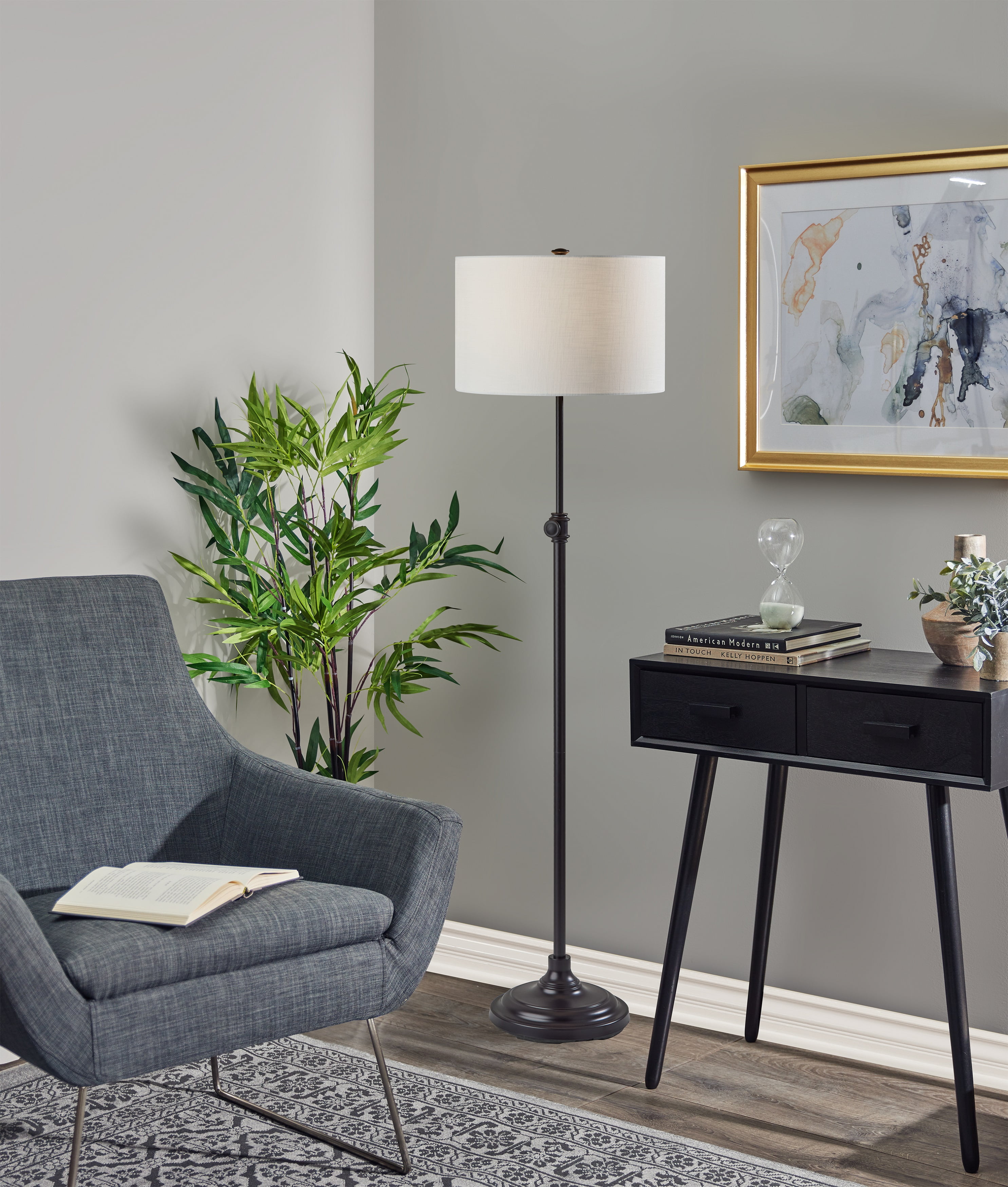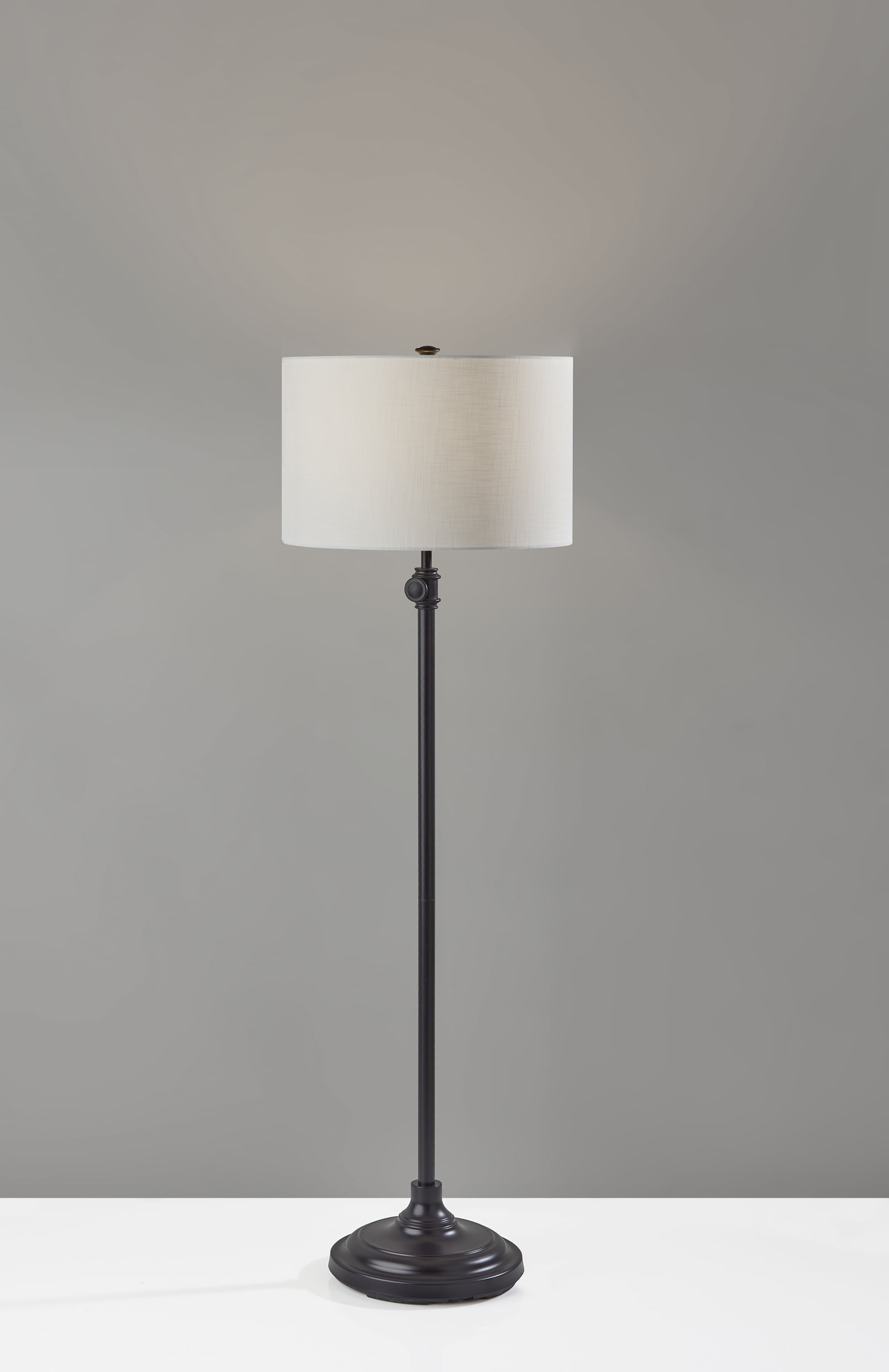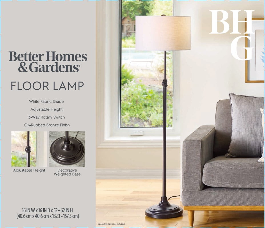 Light up your home with the Better Homes & Gardens AF48949AB bronze adjustable floor lamp. It provides a soft glow of light for you whether you are in your bedroom, living room and is ideal for young adult dorm rooms or adult home office. The bronze finish adds a modern style to this functional and affordable floor lamp. This simple clean line and sleek design floor lamp lends your layout a touch of classic style as it boosts brightness. Crafted from metal, it features a round base and a slender tubular body that blends easily with most color palettes. It has a easy to use on/off rotary switch. The lamp can adjust from 52 inches to 62 inches. A fabric drum shade rounds out the design, diffusing light from a compatible 150watt medium-base bulb or LED compatible bulb (not included) in an ambient direction. Complete the look of your home with the Better Homes & Gardens adjustable lamp.