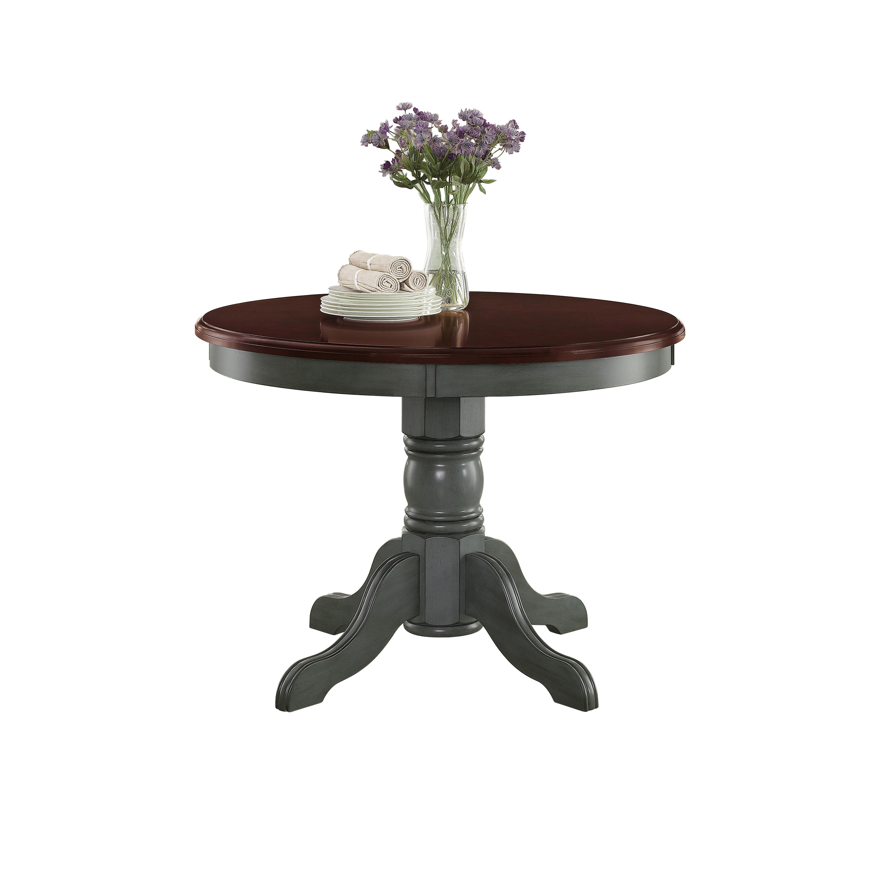 This modern table adds a contemporary feel to your dining room or kitchen area Ideal for small spaces, the 42″ round table seats up to 4 people Complements most interior decor styles from rustic and minimalist to classic, transitional and traditional Dark Seafoam dining table coordinates with mocha and Dark Seafoam, two-toned Maddox Crossing chairs (sold separately) Can be used in the Kitchen or dining room and could even be used as an accent table Multi-step, hand-applied warm, mocha finish on the tabletop with a painted solid Dark Seafoam base Perfect for cozy meals or casual sitting Supported by a graceful 30” pedestal stand that features four elegantly carved legs Offers space to serve up meals without taking up too much square footage Easy assembly makes for a quick and efficient construction process Dimensions: 42″ L x 42″ W x 30″ H (106.68 cm x 106.68 cm x 76.2 cm) Model # BH15-084-299-05