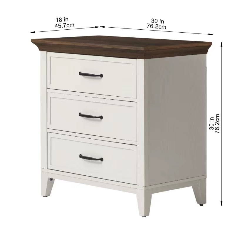 3 Large Drawers: Provide sufficient storage space for your books, cosmetics, accessories and other personal items. By storing all your items in one cabinet, you can keep your items clean and tidy, which is the perfect solution for small space storage. Quality Finish Materials: The top surface of the nightstand is made from 15mm MDF with a smooth, polished finish that will add elegance and sophistication to any room. Black Handles-The drawer handle is both functional and aesthetically pleasing. Its elegant and stylish design with a slim, ergonomic shape is easy to grip and comfortable to use. Specification: Dimmesions:30″W x 18″D x 30″H Product Weight: 77.16 lbs (35 kgs) Packaging Dimensions: 34.7“L x 21.1″W x 12″H Packaging Weight: 93.7 lbs (42.5 kgs) Model: BHS436249972013