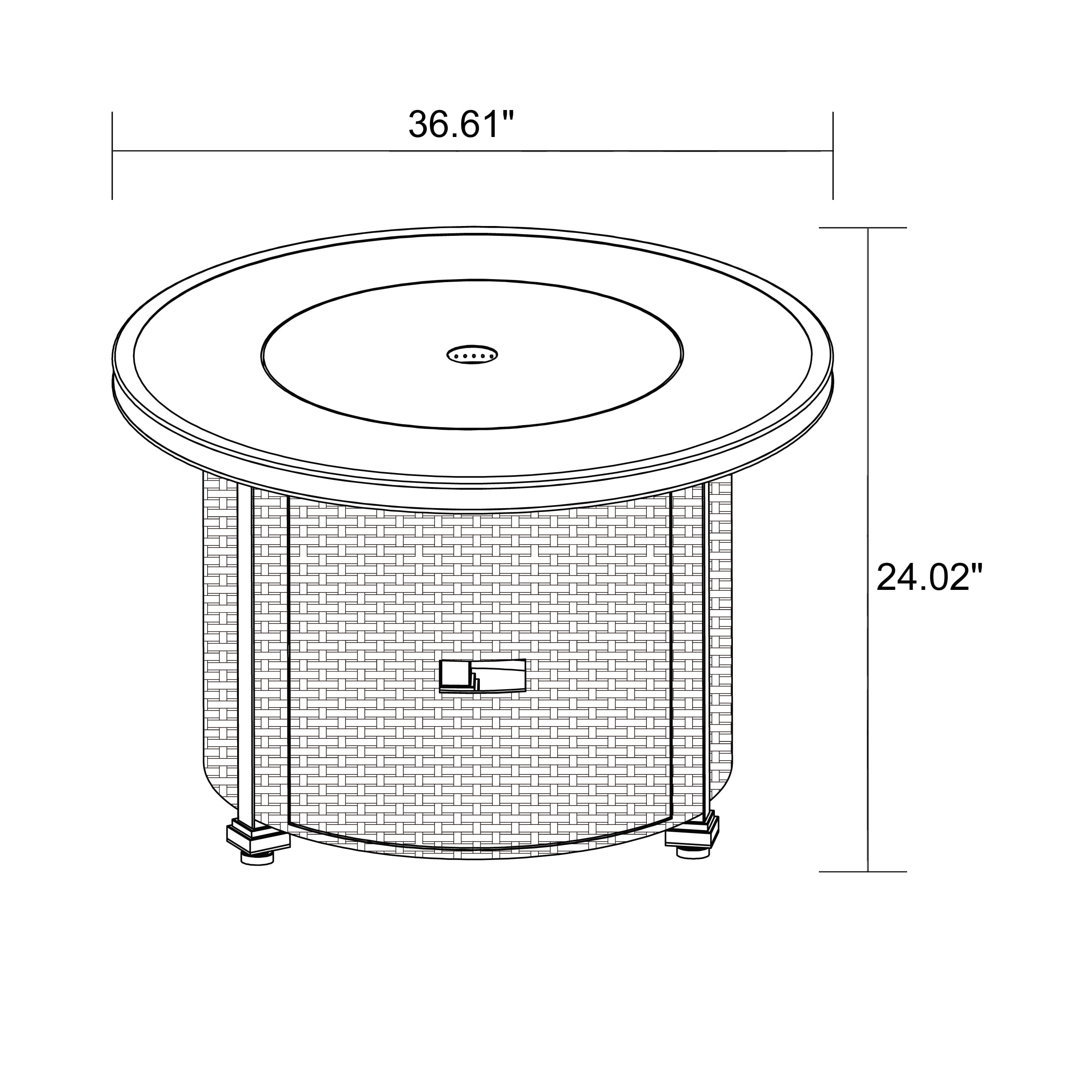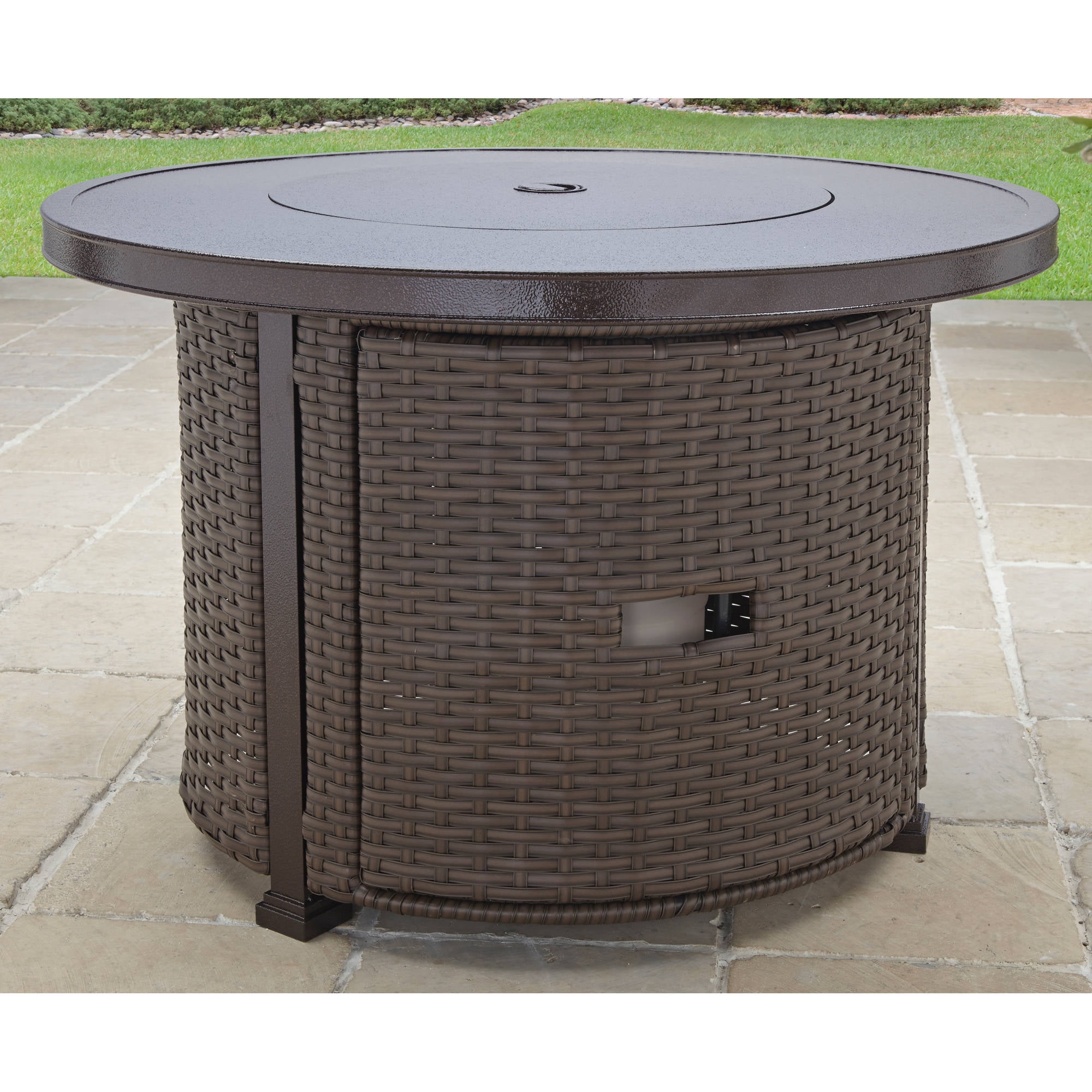 Create the perfect place to gather outdoors with the Better Homes & Gardens Colebrooke 37 inch gas fire pit. This charming outdoor fire pit is constructed with a durable wicker base and an aluminum top to provide a long life in all types of weather and features a heat resistant bronze finish to protect the unit reliably even during heavy use. The pit includes a burner cover to allow it to be used as an outdoor coffee table and comes with an all weather fabric cover to keep the fire pit protected when not in use. Easily portable with a round handle at the top for a secure grip, you can place this fire pit on patios, decks, yards, driveways and more to provide cheery light and warmth almost anywhere. The Better homes and gardens Colebrooke 37 inch gas fire pit assembles quickly in minutes with the included hardware and is fueled by a standard propane tank (not included).
