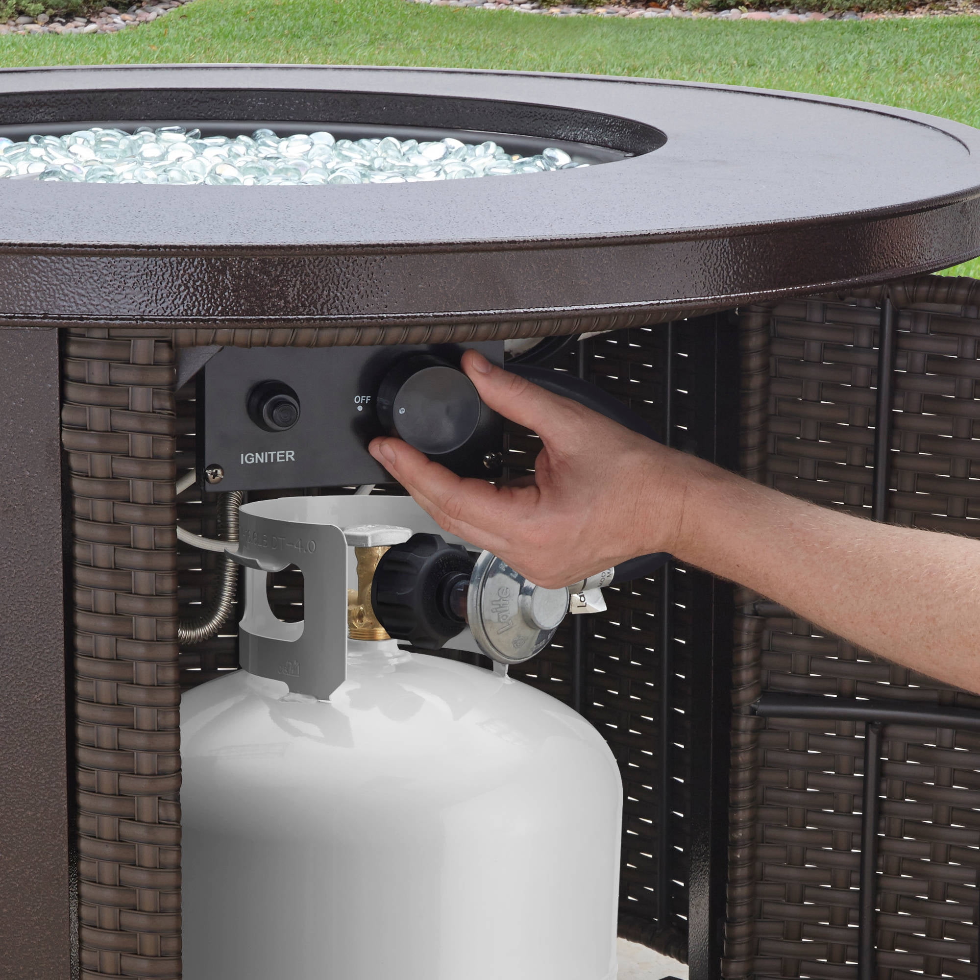 Includes a lid the burner that allows the fire pit to be used as an outdoor coffee table Fire pit comes with glass bead Matches the better homes and gardens Colebrooke collection of outdoor furniture and accessories Liquid propane provides a clean, smokeless burn with a heat output of 50,000 BTUs Stainless steel burner ensures outdoor durability Fuel Type: Propane Uses 20-lb. tank of propane (tank sold separately) Features a battery operated electric igniter for easy starting (battery included) Adjustable heat control creates maximum comfort in all seasons Dimensions: 37″ D x 24.41″ H Gross Weighs: 77 lbs. Easily assembled with included instructions and hardware