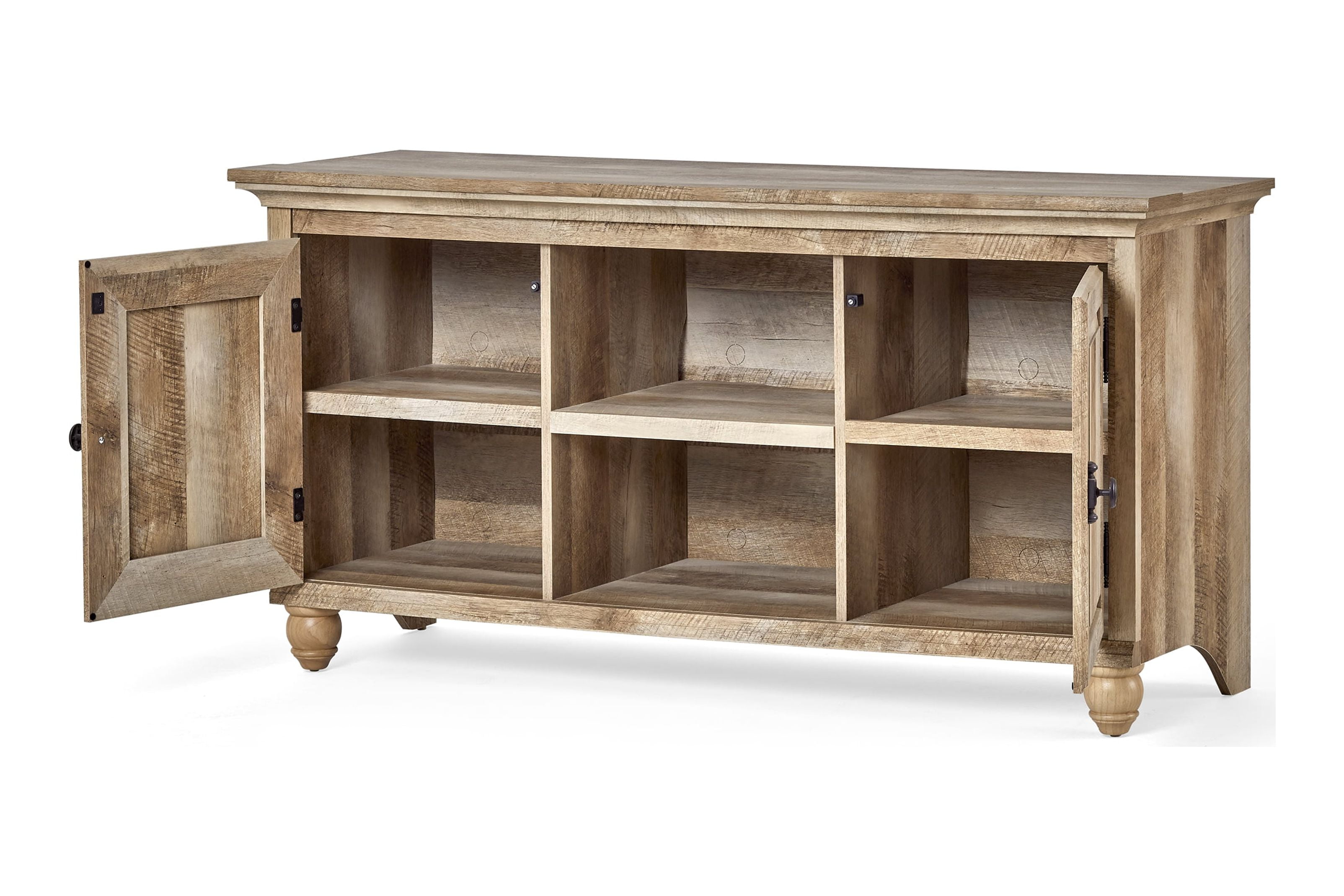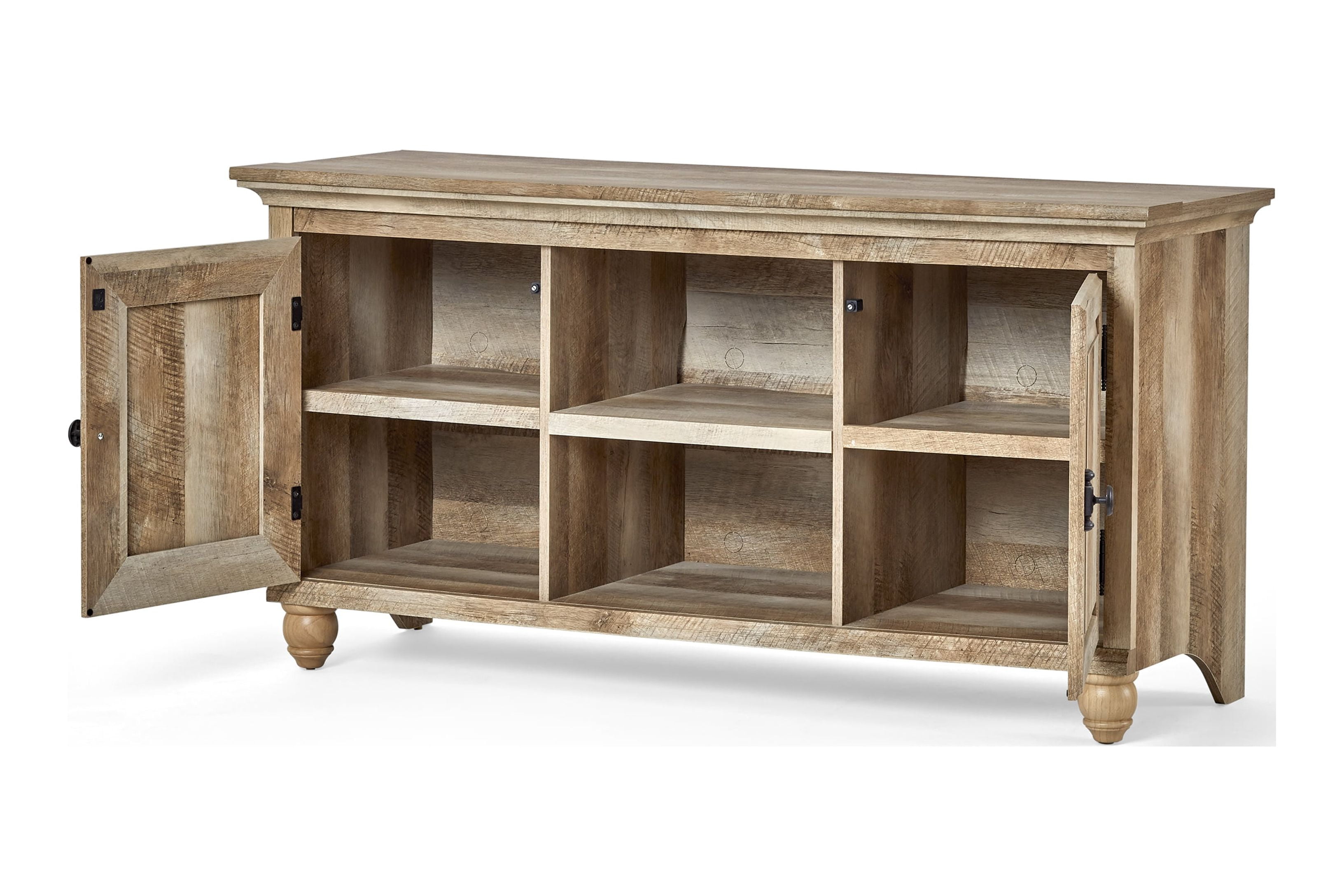 Assembled Dimensions: 59.21″ L x 19.45″ W x 30.16″ H Accommodates up to a 65″ TV weighing 70 lbs. or less Three adjustable shelves and raised panel doors Weathered finish Model #: 415979 Box Dimensions: 65.63″ L x 17.75″ W x 5.87″ H For additional questions, please contact the manufacturer at 1-800-523-3987 Be sure to check out the Better Homes & Gardens Crossmill collection for more great items!