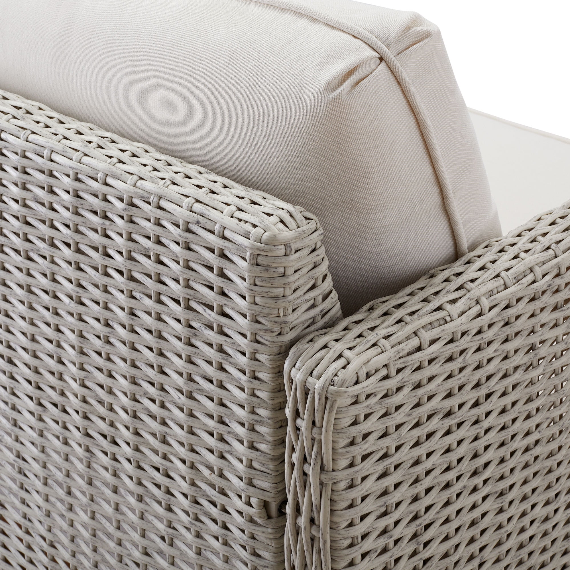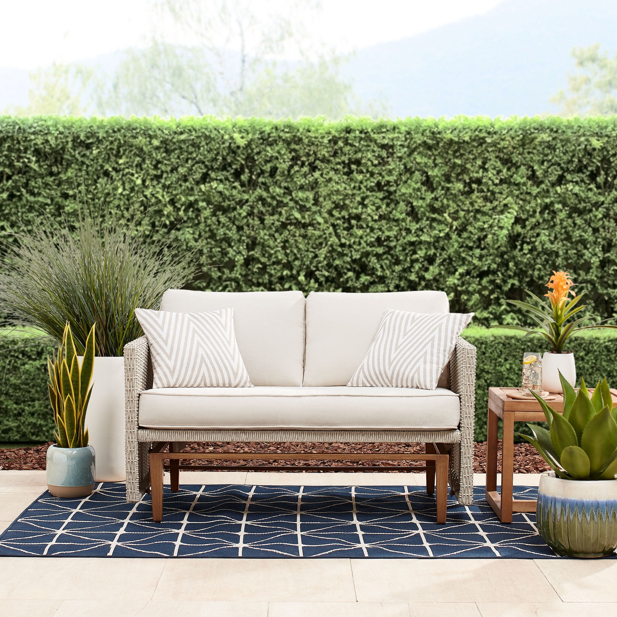 Relax on your patio or deck withthe Better Homes & GardensDavenport Outdoor LoveseatGlider Bench. The sturdysteel construction with powder-coated finish and all weather wickerensures durability and long-lastinguse. This outdoor garden glider willadd a beautiful presence to yourexisting space. It comes with fourcushions that are UV protected to retaintheir sharp color for seasons tocome. Add style and function toyour outdoor living space whileadding a relaxing place to sit, read,entertain and unwind, with thispatio glider bench.