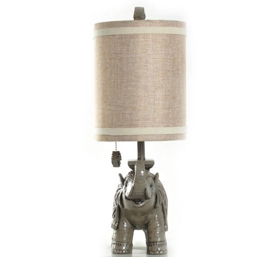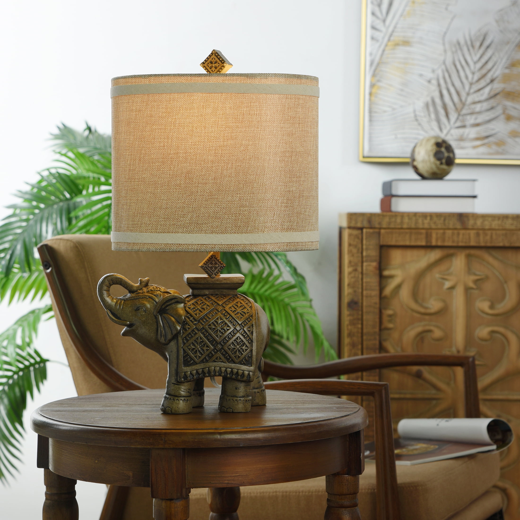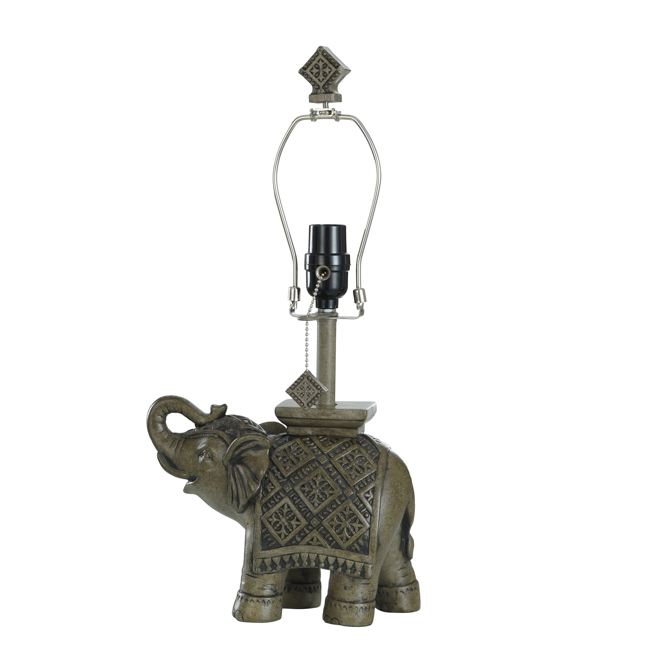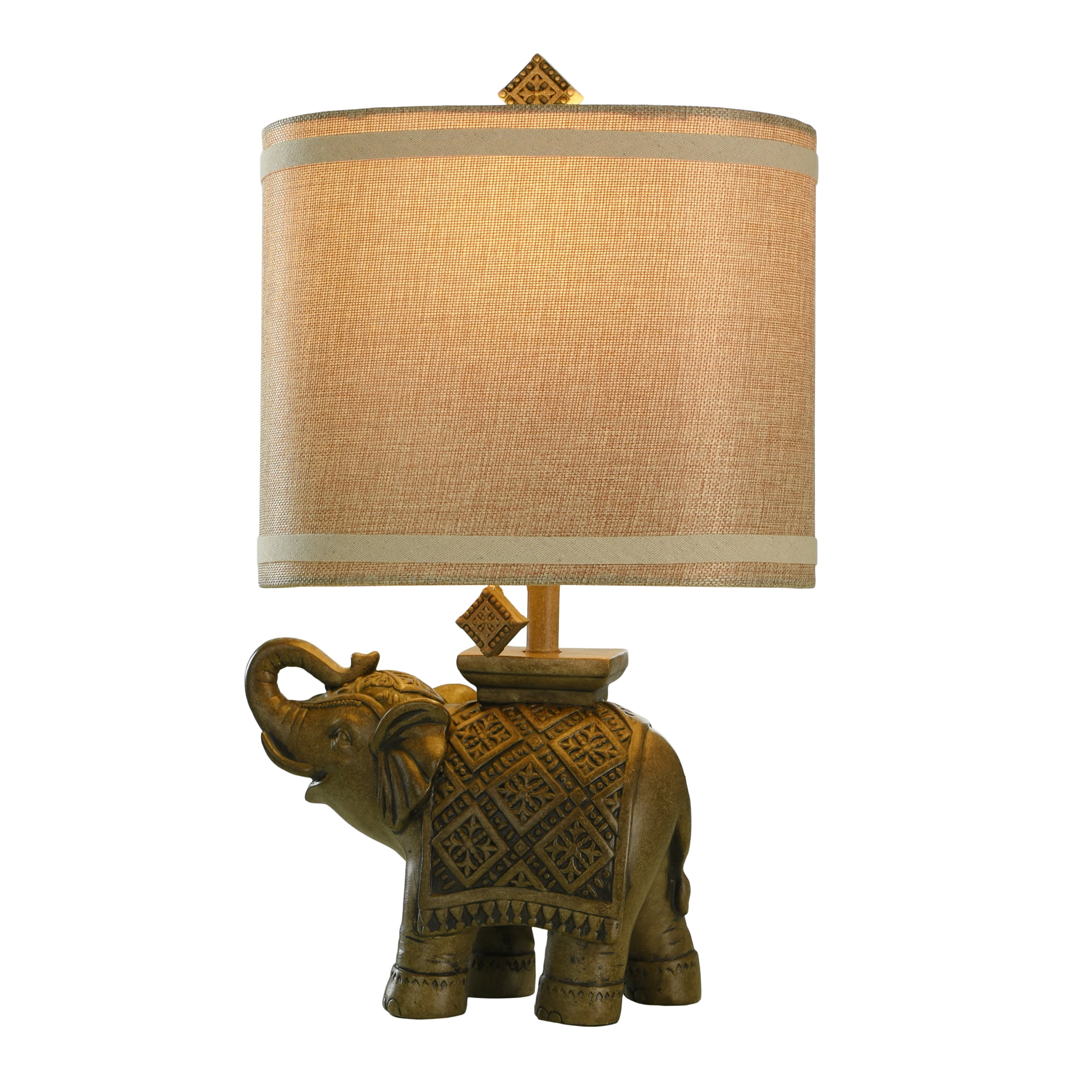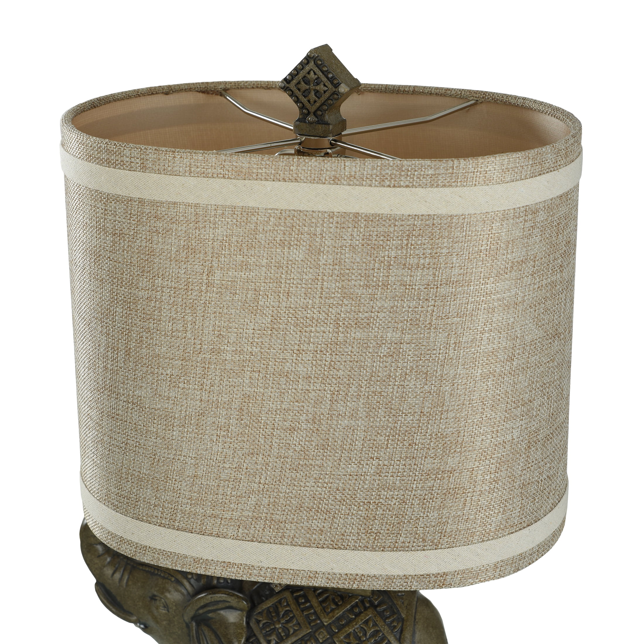 Decorative table lamp Intricate elephant-shaped design Includes base, harp, finial, and shade Durable resin finish 75 watts Measures: 11″ L x 7″ W x 19″ H Blends well with boho-chic or global home-decor styles