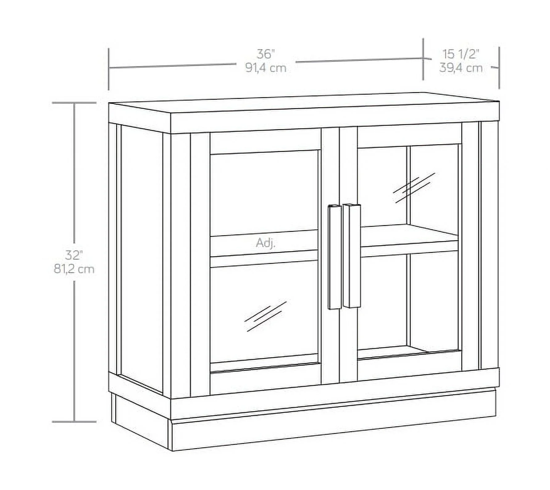 The Better Homes & Gardens Ezra Accent Cabinet presents a modern display cabinet that offers an effortless infusion of style into any room of the home. Create versatile storage and display options in the living room, dining room, entryway or kitchen with the modern geometric design of this utility wood accent cabinet. Behind its set of framed, safety-tempered glass doors with soft-close hinges, this fashion cabinet provides an adjustable, spacious shelf. Along with the bottom shelf, the display area is ideal for showcasing a prized collection of antiques, vintage China, or photos of family and friends. This living room storage cabinet has a strong and lightweight 2-inch panel construction and built-in adjustable base levelers so that it is durable yet versatile in any living space. Finished in the hues of a Warm Walnut finish, with modern, geometric hardware, this Better Homes & Gardens Ezra Accent Cabinet with glass doors offers an updated version of a home storage classic.