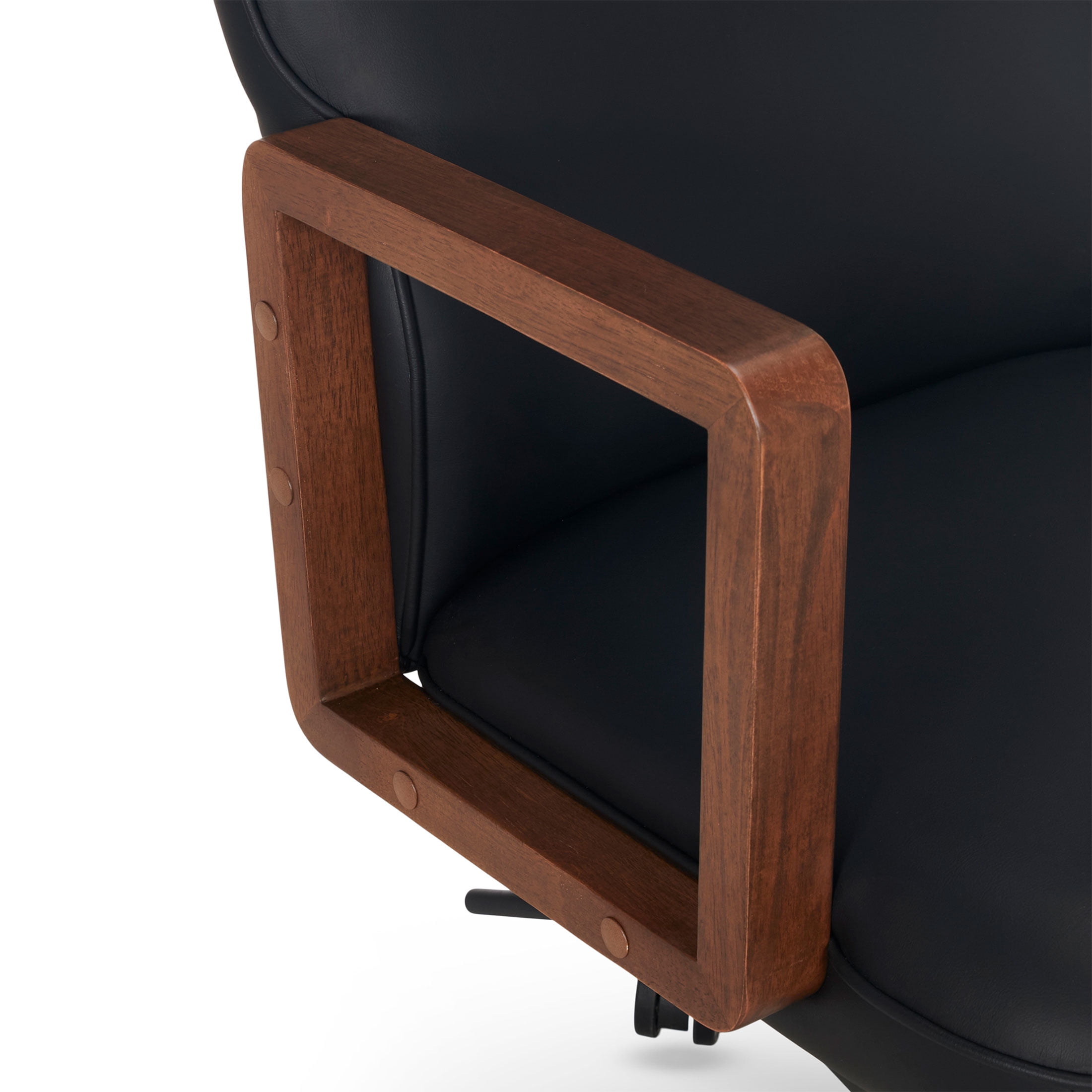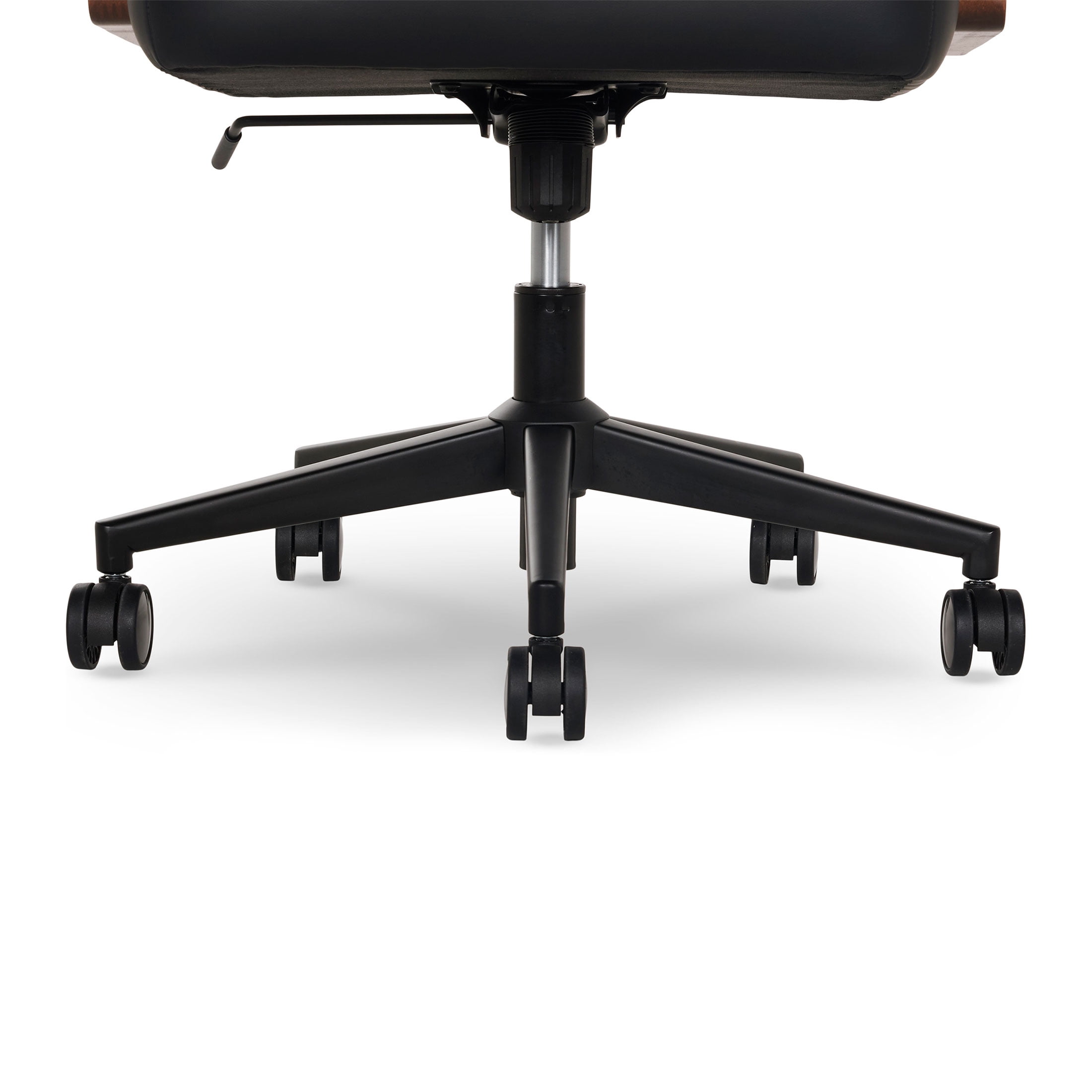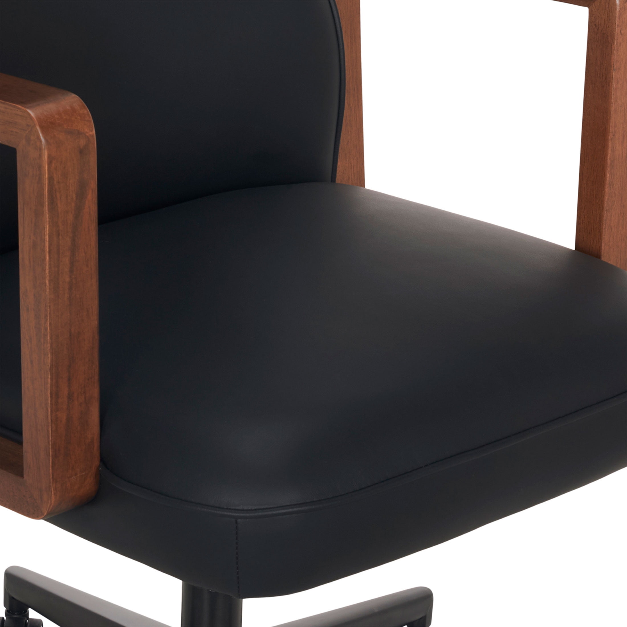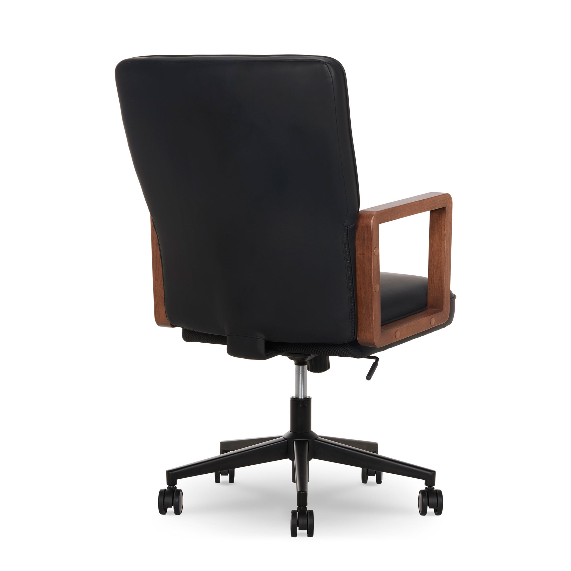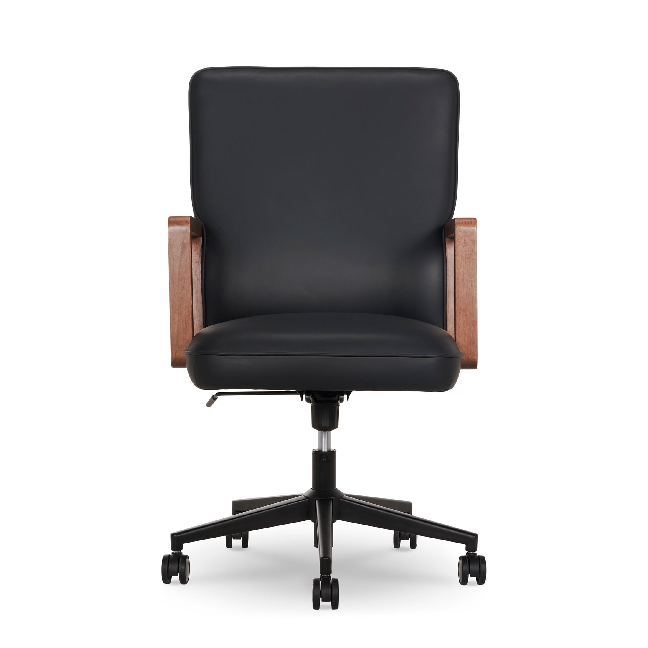 Better Homes & Gardens Ezra Office Chair, Black Vegan leather seating surfaces combine elegance and durability for a naturally elevated look Authentic wood grain armrests provide upper body support Ergonomically-curved backrest promotes good posture Adjustable seat height with gas lift and control lever Recline mechanism with adjustable tilt tension and tilt lockout 360° dual-wheel casters and smooth-swivel seat for effortless mobility Durable metal base provides reliable support Available in Black, Olive or Chestnut Easy adult assembly with no additional tools required Product Dimensions: 24.5 in W x 28 in D x 38.5 – 42.25 in H (62.2 cm x 71.1 cm x 97.8 – 107.3 cm) Packaging Dimensions: 29 in x 14.25 in 24.75 in Model# BH25000052549BL, BH25000052549OL, BH25000052549CH