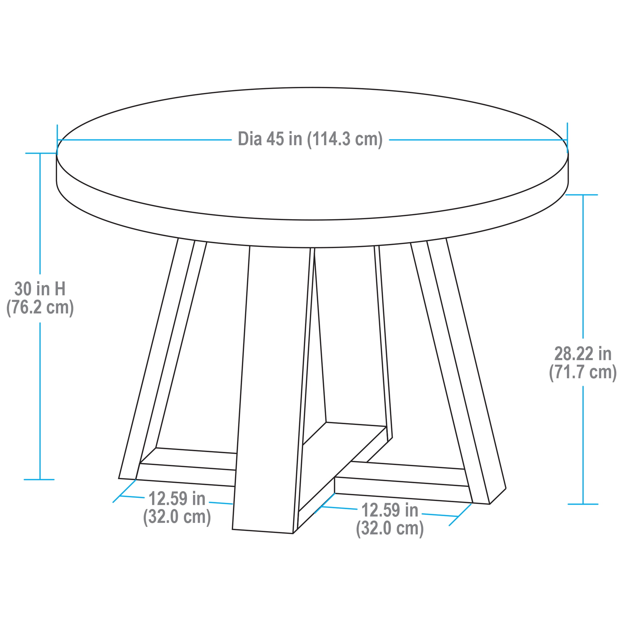 Assembled Dimensions: 45” L x 45” W x 30” H Product Weight: 60 lb Color: Walnut Material: Rubberwood, MDF veneer Package Dimensions: 49.2” L x 49” W x 6.3” H (125cm L x 124.5cm W x 16cm H) Package Weight: 99 lb (45 kg) Contemporary style Better Homes & Gardens ‘Ezra’ Collection Seats 4 people Space-saving round top with cross-frame legs Assembly required Cleaning and Care: Clean with damp cloth and dry Model #04894165028209