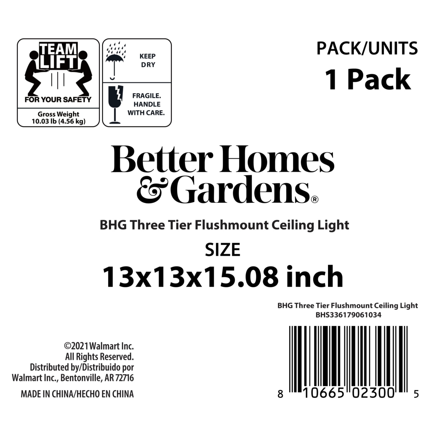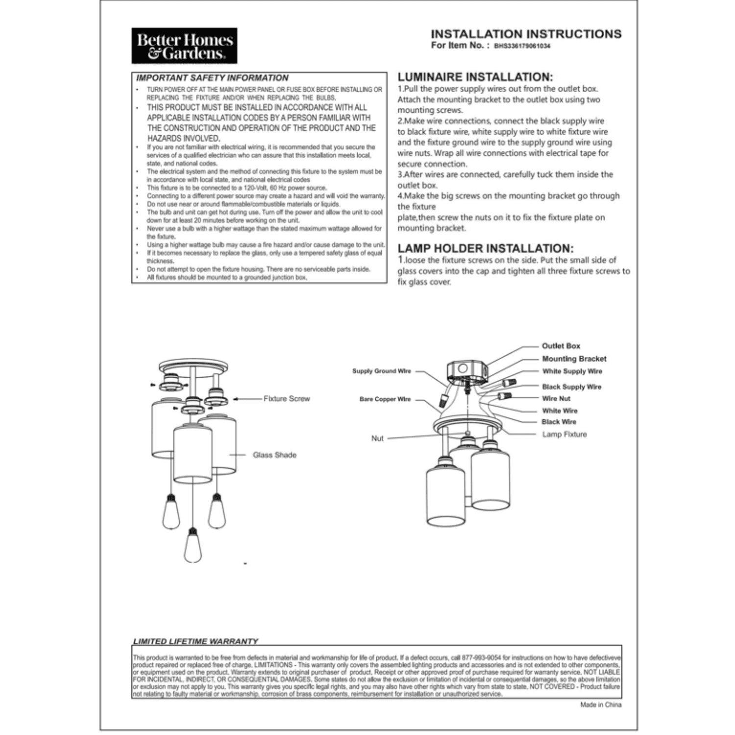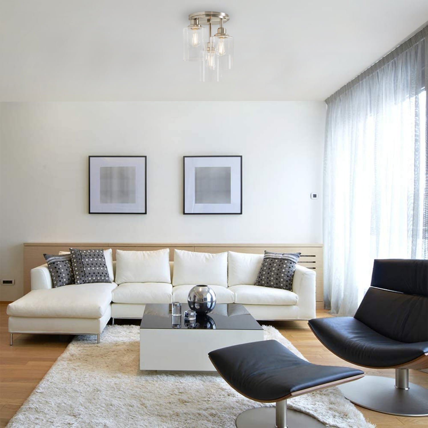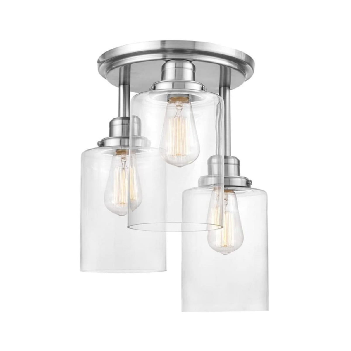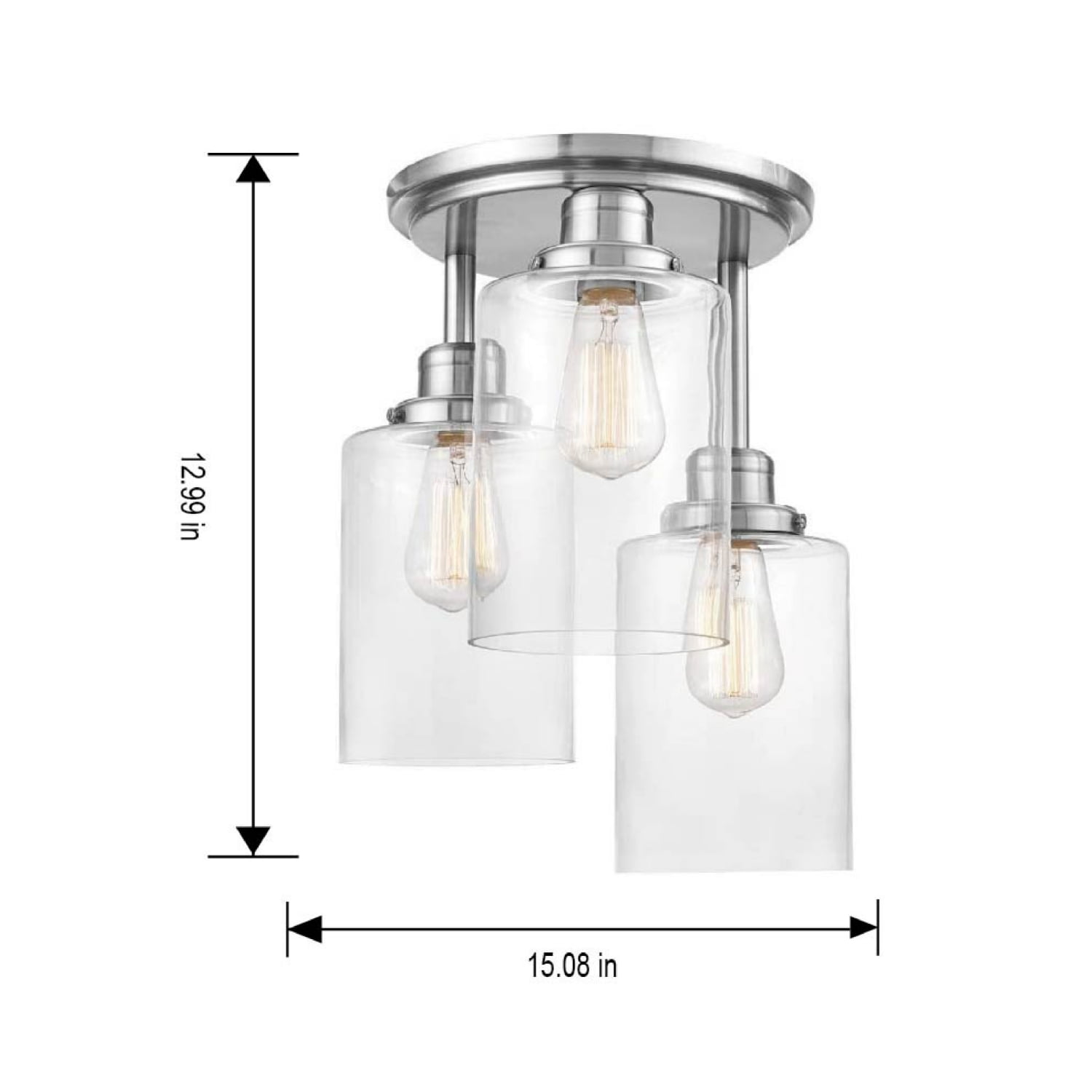 Better Homes & Gardens 3-Light Flush mount Ceiling Light Glam Style Satin Nickle Finish Clear glass shades (3) Dimmable ST19 LED bulbs included Light output: 450 Lumen x 3 Color temperature: Soft white 2700K 5 years limited warranty Size: 12.99×12.99×15.08IN