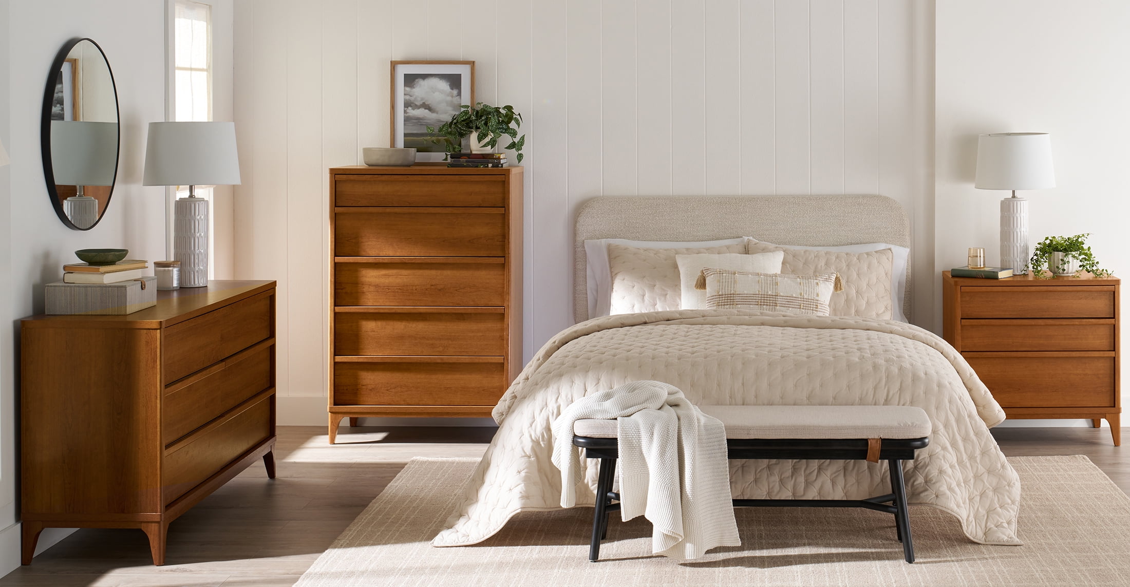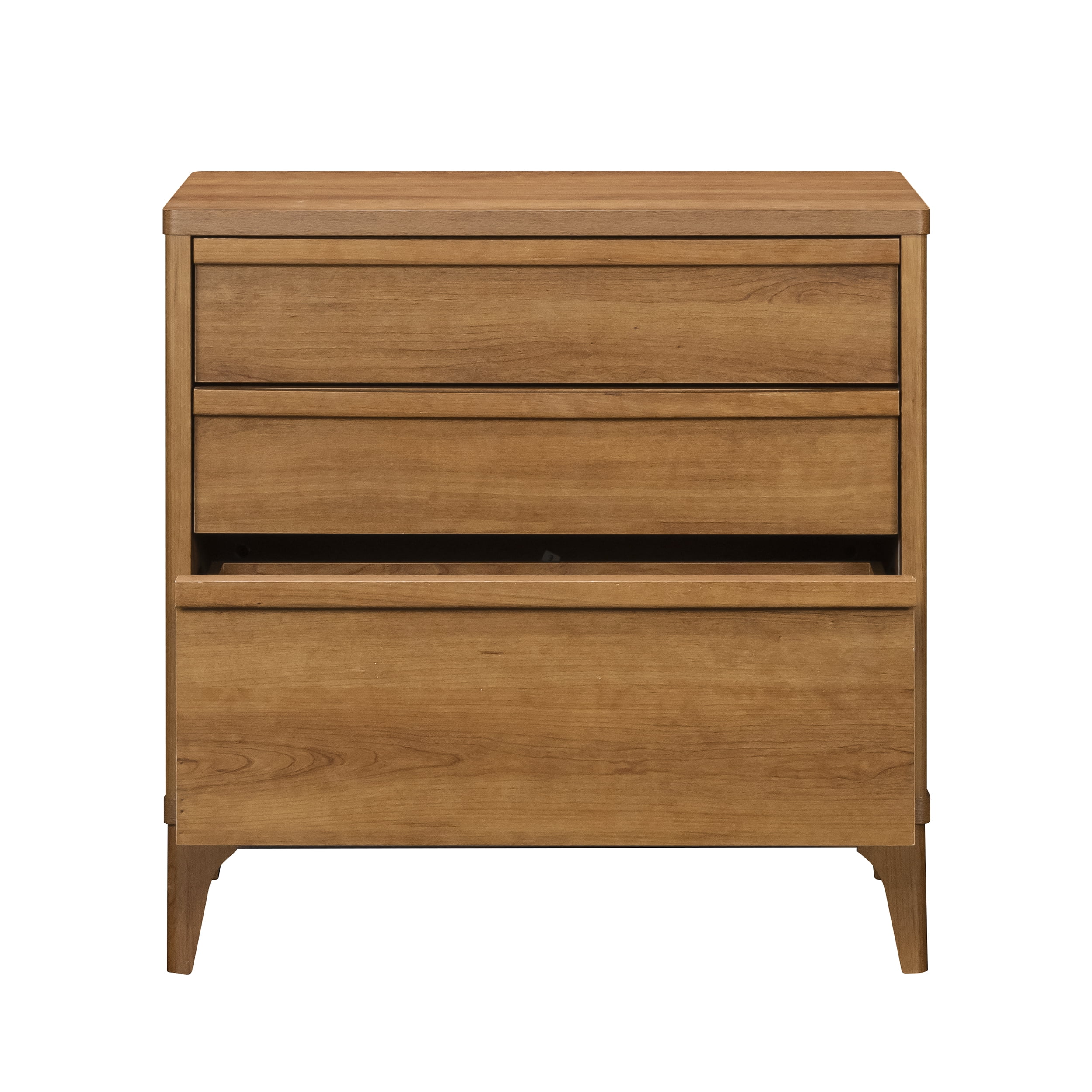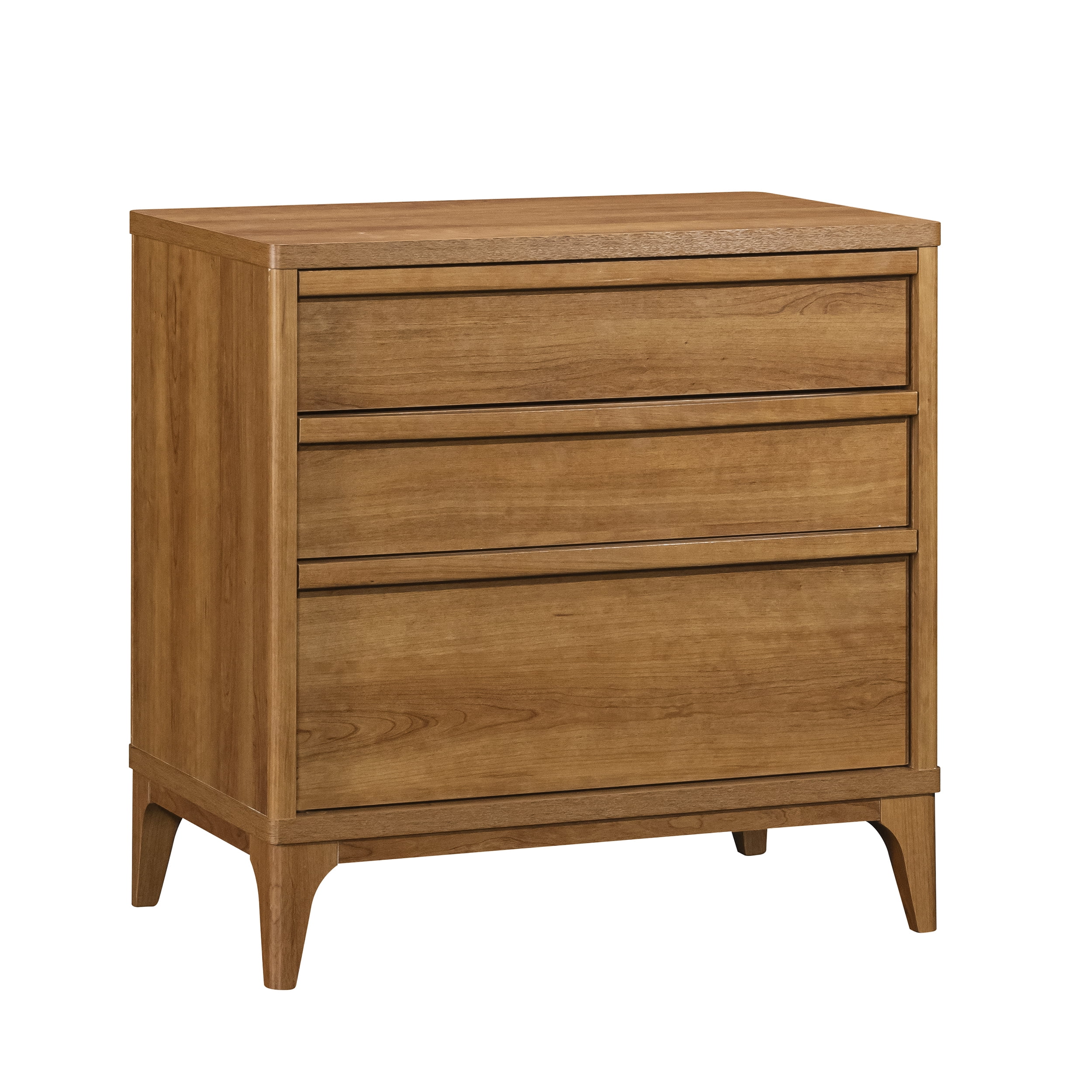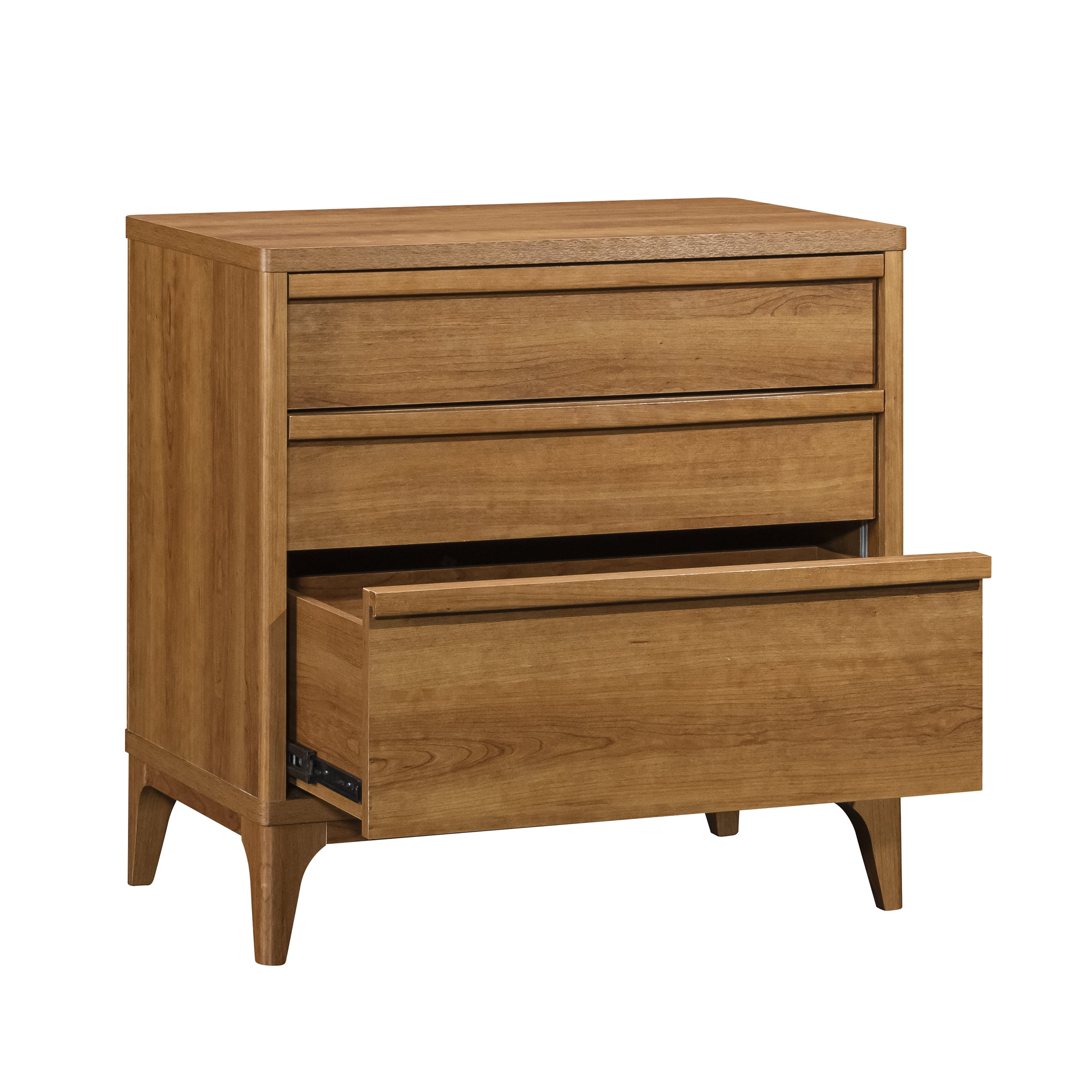 Add a touch of mid-century modern elegance to any home with this stylish 3-drawer side table from the Better Homes & Gardens Greyson collection. Featuring a natural wood look with a warm Acorn finish, this contemporary nightstand is designed to complement any decor. The solid wood feet of this engineered wood nightstand not only provide stability but enhance the durability of the piece, ensuring it will be a long-lasting addition to the home. Each of the three spacious drawers glide smoothly on metal runners and includes safety stops, making it easy to access bedroom or living room essentials. The interlocking safety mechanism on this 3-drawer nightstand ensures that only one drawer can be opened at a time, preventing accidental tipping and enhancing safety. Additionally, a tip restraint safety strap is included, providing extra security for this mid-century modern nightstand. With the perfect blend of form and function, this retro bedside table with drawers offers ample storage space while adding a sophisticated, timeless aesthetic whether standing beside a bed, a sofa, or all on its own.