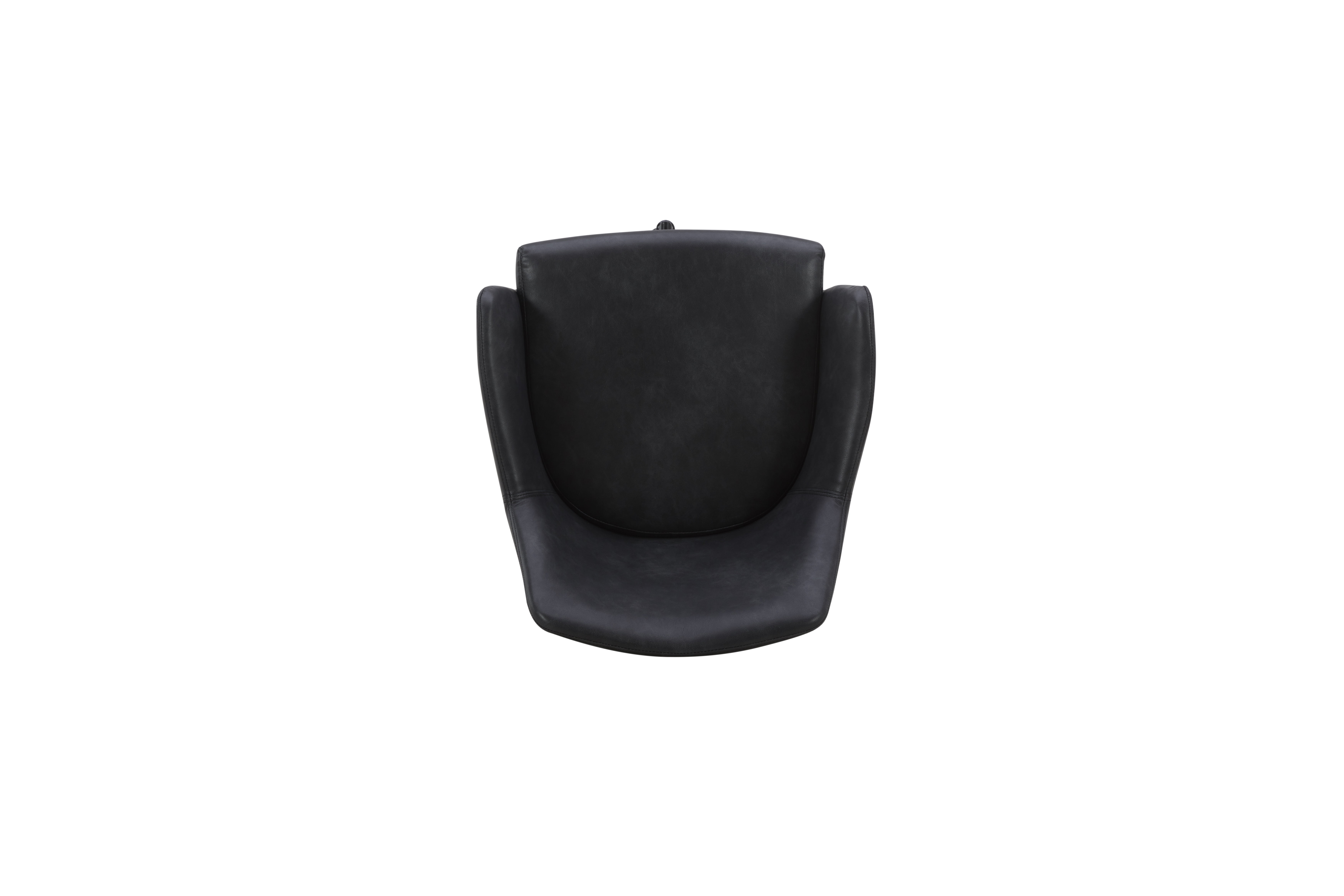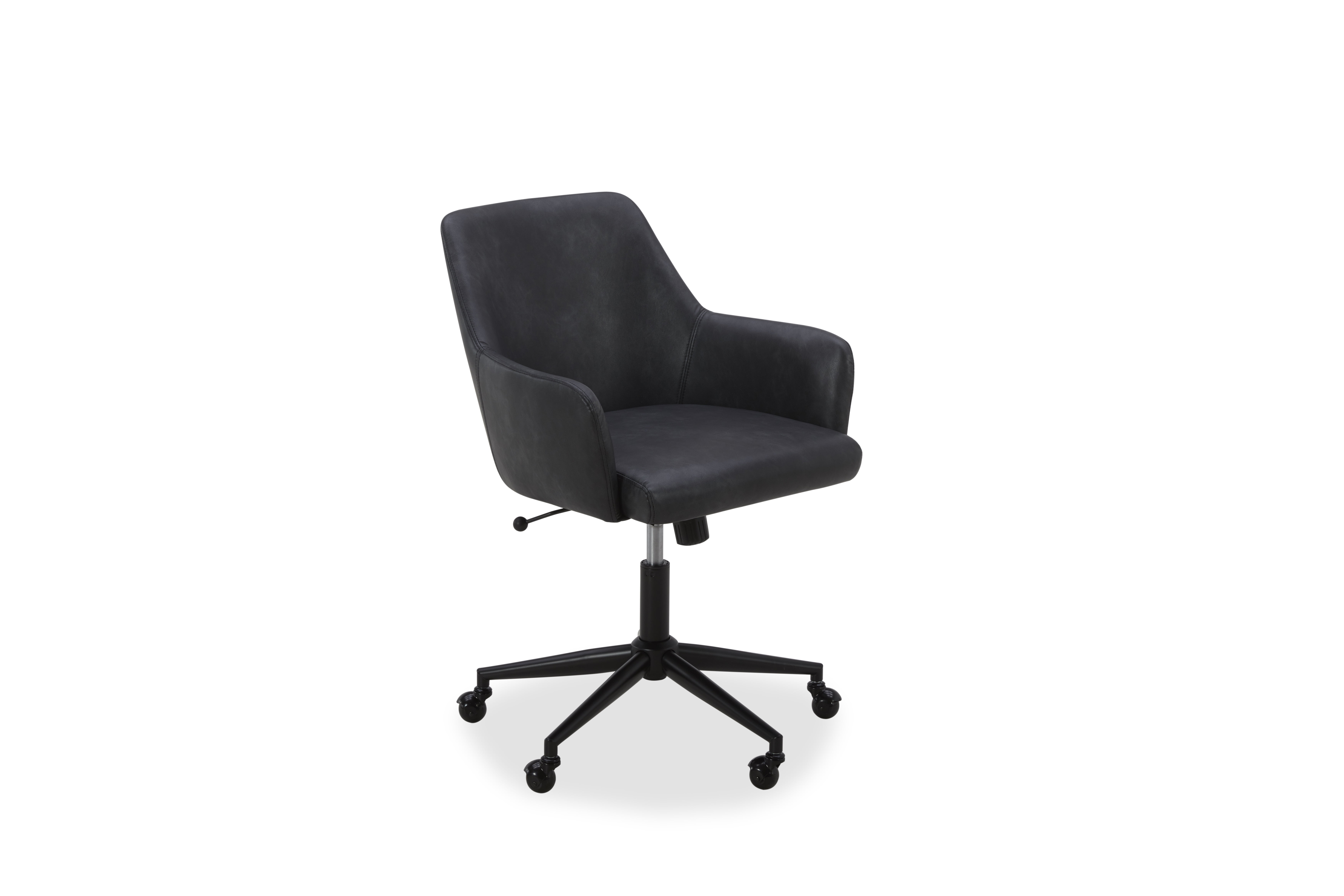Upholstered in faux black leather with matching stitching Solid and engineered wood construction Swivel caster base with gas lift High density foam seat cushion with webbed seat suspension Simple assembly required Weight Limited: 300 lbs