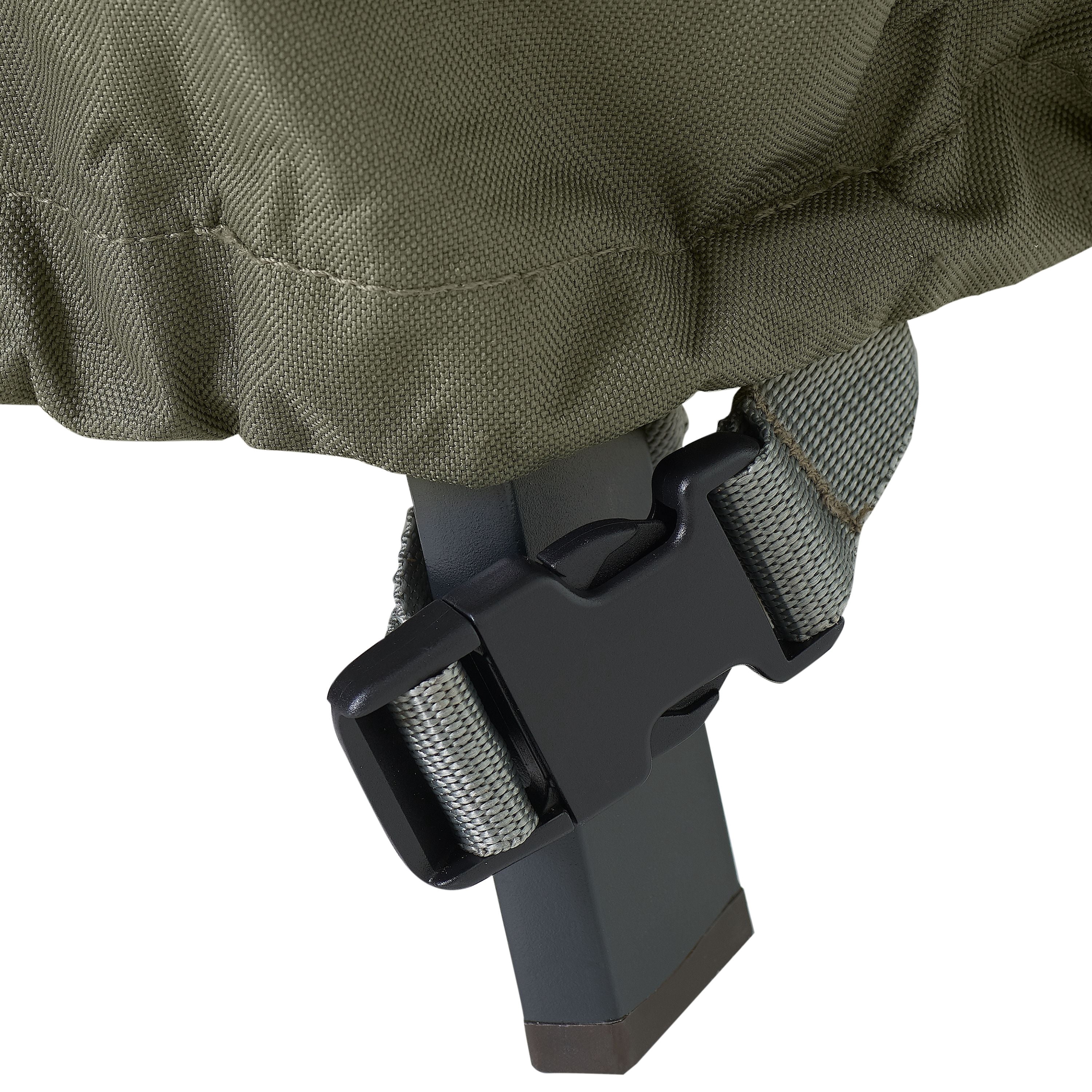 Rectangular patio dining set cover fits table and chairs up to 128″ L x 82″ W x 23″ H Water-resistant polyester fabric is densely woven to protect against dirt, heat, rain, sleet, and snow Durable all-weather rectangular dining set cover stays flexible and won’t crack in below-freezing temperatures Elastic hem with buckled strap secures the lightweight cover over outdoor dining table and chairs Cover is vented for airflow to prevent the growth of mold and mildew Outdoor furniture cover is highly resistant to fading Also protects oval outdoor dining sets Olive Gray color is a stylish complement to an outdoor patio, porch, deck, terrace, garden, or balcony Designed to protect a rectangular-shaped outdoor dining table and dining chairs in all seasons Easy to store Clean with lukewarm water and a non-abrasive brush