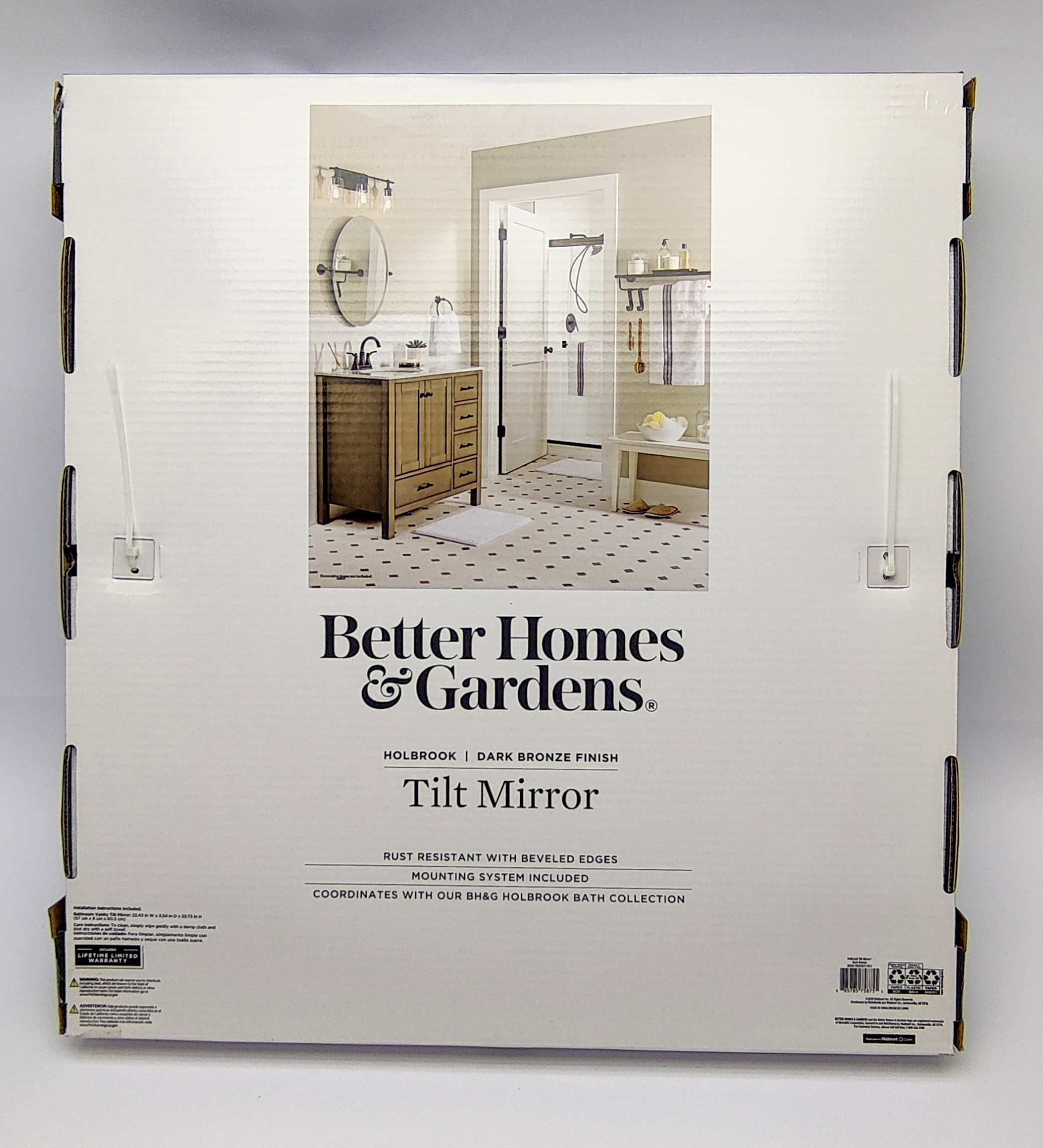 Features beveled edges and a tilt design for adjustability Mounting hardware and hanging template included High quality, upscale design from Better Homes & Gardens will give a beautiful update to any bathroom Zinc die cast construction provides exceptional reliability and durability Features durable wall-mounting system for hassle-free installation Long-lasting oil rubbed bronze finish helps prevent corrosion, tarnish or discoloration