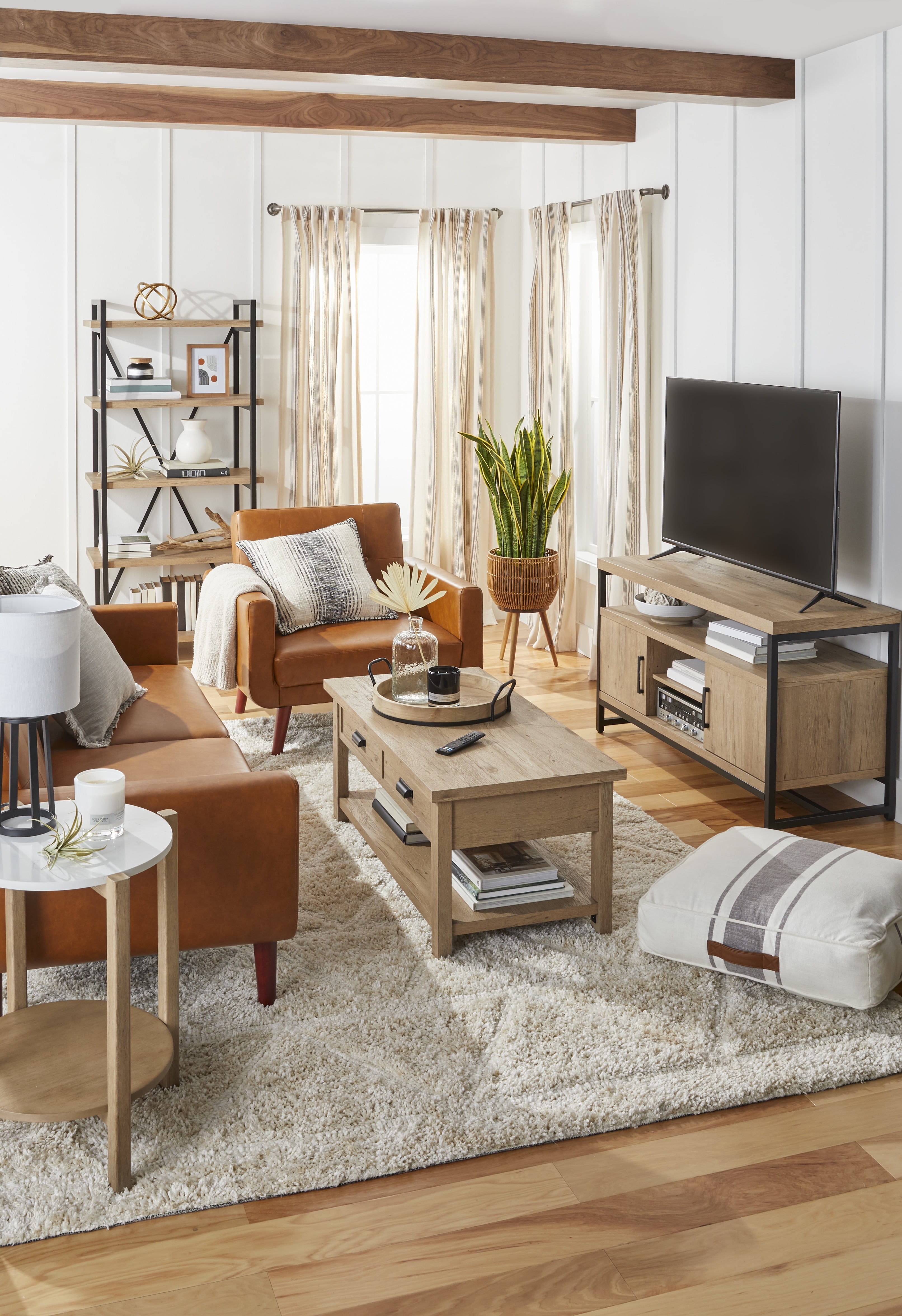 Fits most flat panel TVs up to 55 inches & 80 lbs Large top shelf for storage and display option Center adjustable shelf creates a flexible storage space and is great for displaying audio/video components 2 cabinets doors for concealed storage Sturdy metal frame with a rustic gunmetal finish Natural Oak finish Adjustable levelers 3D interactive assembly guide available through free BILT app (Download from the app store or Google Play) Coordinates with the Better Homes & Gardens Jace 5-Tier Bookcase (sold separately) Product Dimensions: 47.5in W x 19in D x 27in H (120.7cm x 48.3cm x 68.6cm) Product Weight: 95.2 lb (43.2kg) Packaging Dimensions: 51in W x 22.5in D x 9.25in H Model# BHF1025004002