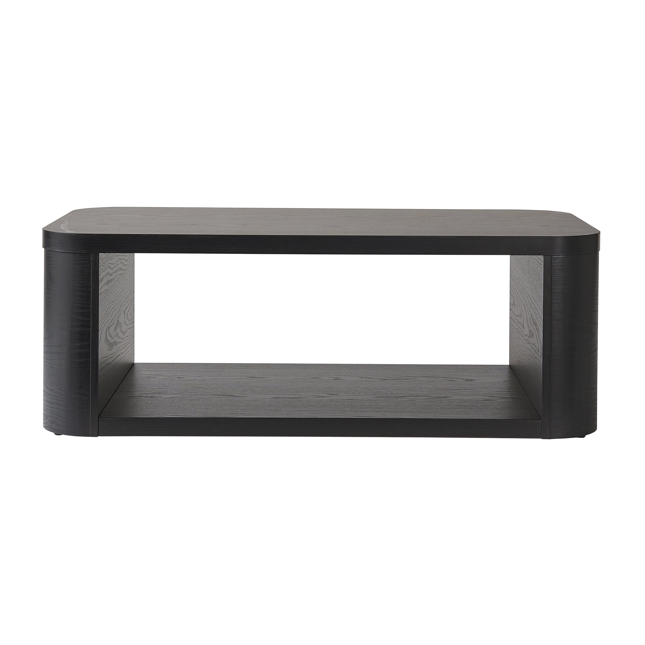 Elevate your living space with the Better Homes & Gardens Juliet Coffee Table in a sleek black woodgrain finish. This modern rectangular coffee table features an open design with gracefully curved edges, creating an airy, contemporary feel ideal for living rooms, family rooms, or lounges. Its spacious tabletop is perfect for serving snacks, beverages, or showcasing decorative items. The lower shelf is the perfect platform for decorative storage of books, coasters, or plants; add pretty baskets or bins to stash removes or other small items. Constructed from durable MDF and particle board with a 100-pound weight capacity, this stylish coffee table combines quality construction with functional design. Assembly is required.