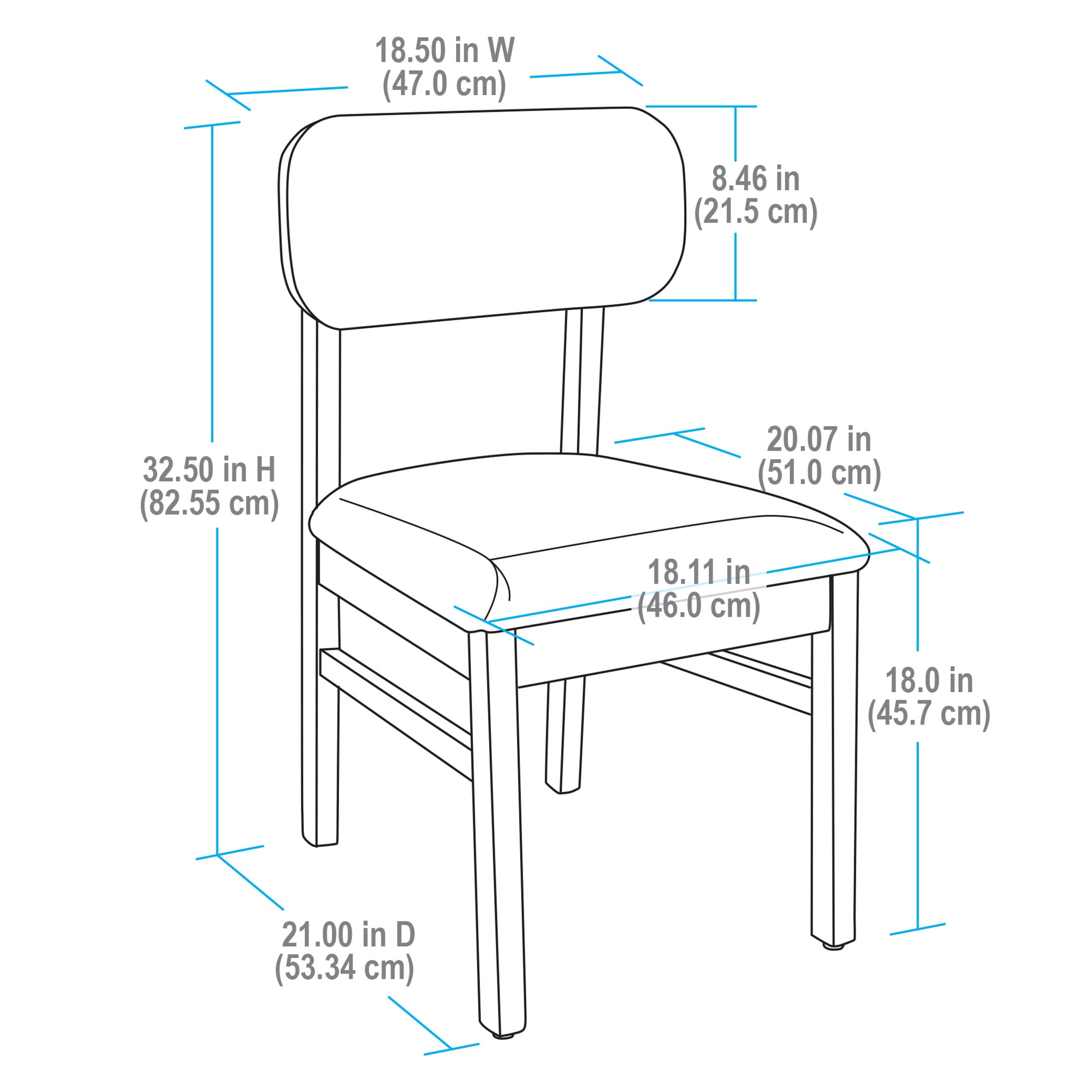 Assembled Dimensions: 18.5” W x 21” D x 32.5” H Product Weight: 37 lb Color: Light Honey Material: Solid rubberwood frame, 100% polyester fabric Package Dimensions: 42.2” L x 20.3” W x 11.6” H (107 cm L x 51.5 cm W x 29.5 cm H) Package Weight: 46.2 lb (21 kg) Contemporary style Better Homes & Gardens ‘Juliet’ Collection Cushioned foam seat Set of 2 chairs Seat Height: 15.5” Seat Width: 18” Seat Depth: 20” Assembly required Model #BH2402125171010