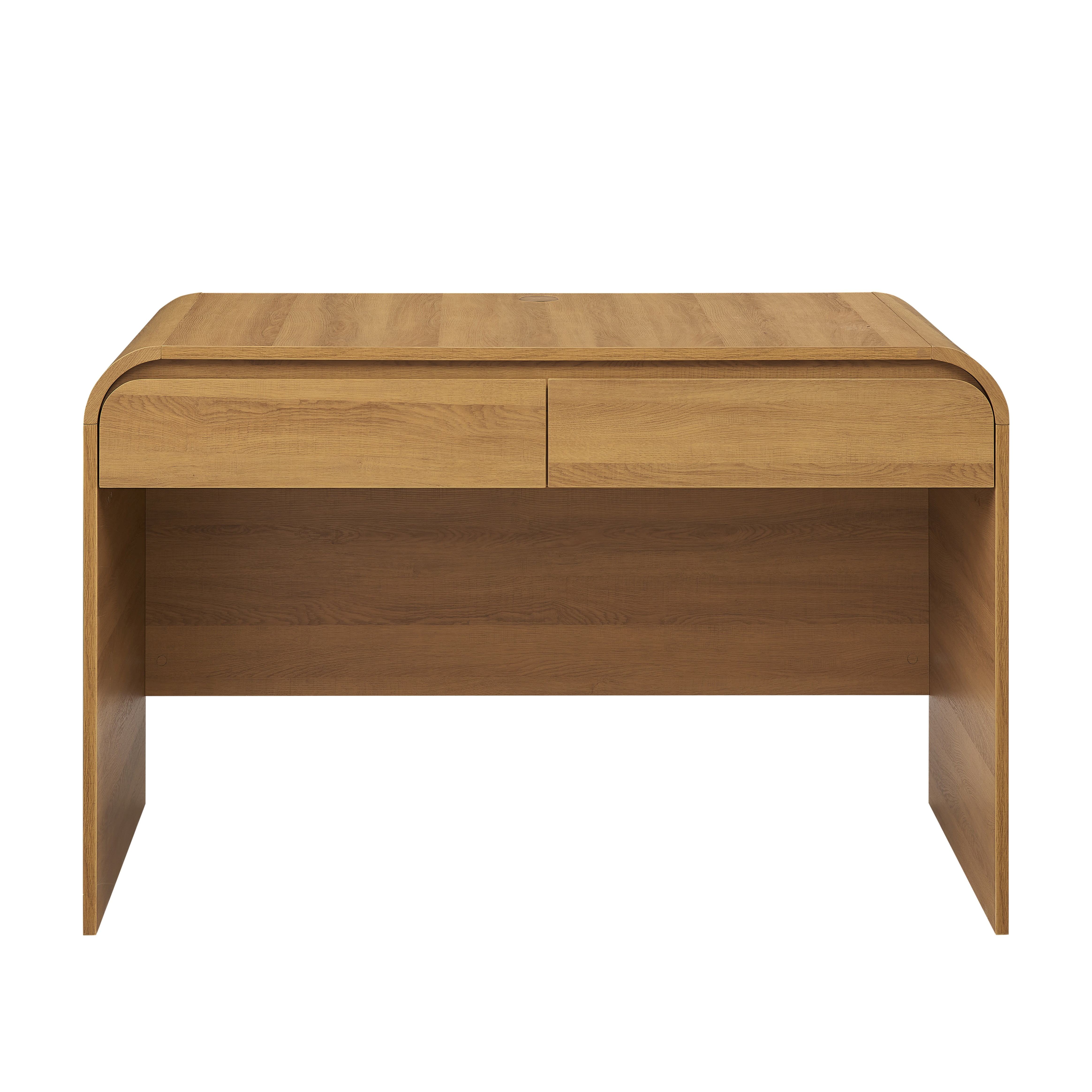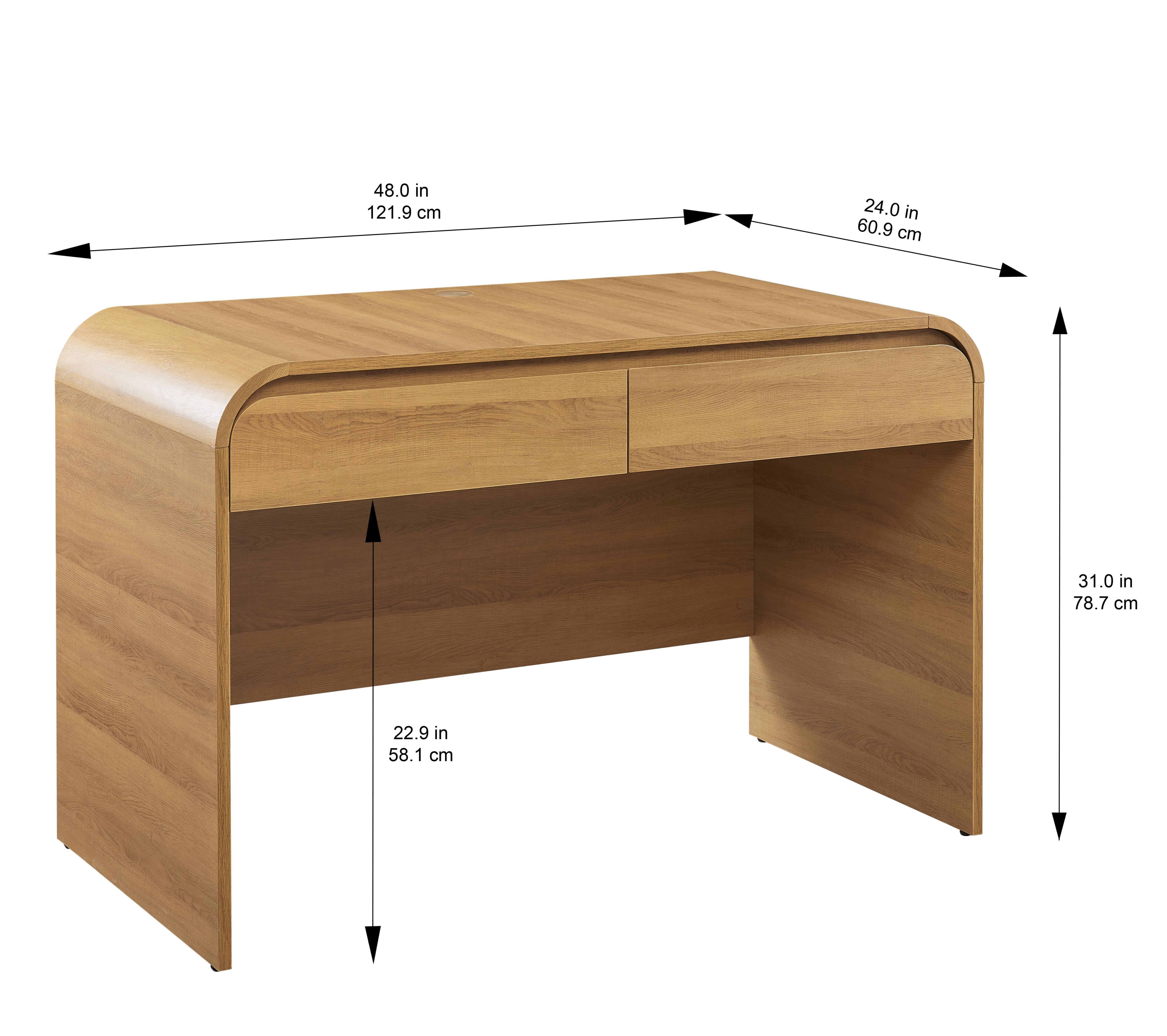 Better Homes & Gardens Juliet Rounded Arc Desk, Light Honey Finish Modern, Contemporary style Computer desk, Executive desk, Console table Product material: Engineered wood, Rubberwood Light honey finish with wood-grain style 2 center storage drawers with easy-open finger pulls on the top edges Ball-bearing metal drawer glides ensure soft, quiet closing Wide worksurface for computer work Cord management cutout on the back of the desktop keeps wires hidden Ample leg room under desk for legs and small mobile file cabinet Wipe clean with soft, dry cloth Assembly required: Accessory kit, tools, and instructions included Desktop weight limit: 200 lbs Assembled desk dimensions: 48 in. L x 31 in. H x 24 in. W Assembled product weight: 89.3 lbs Desk and task chairs sold separately Package dimensions: 51 in. x 27.2 in. x 5.8 in. Package weight: 102.5 lbs Model #BHS436249972006