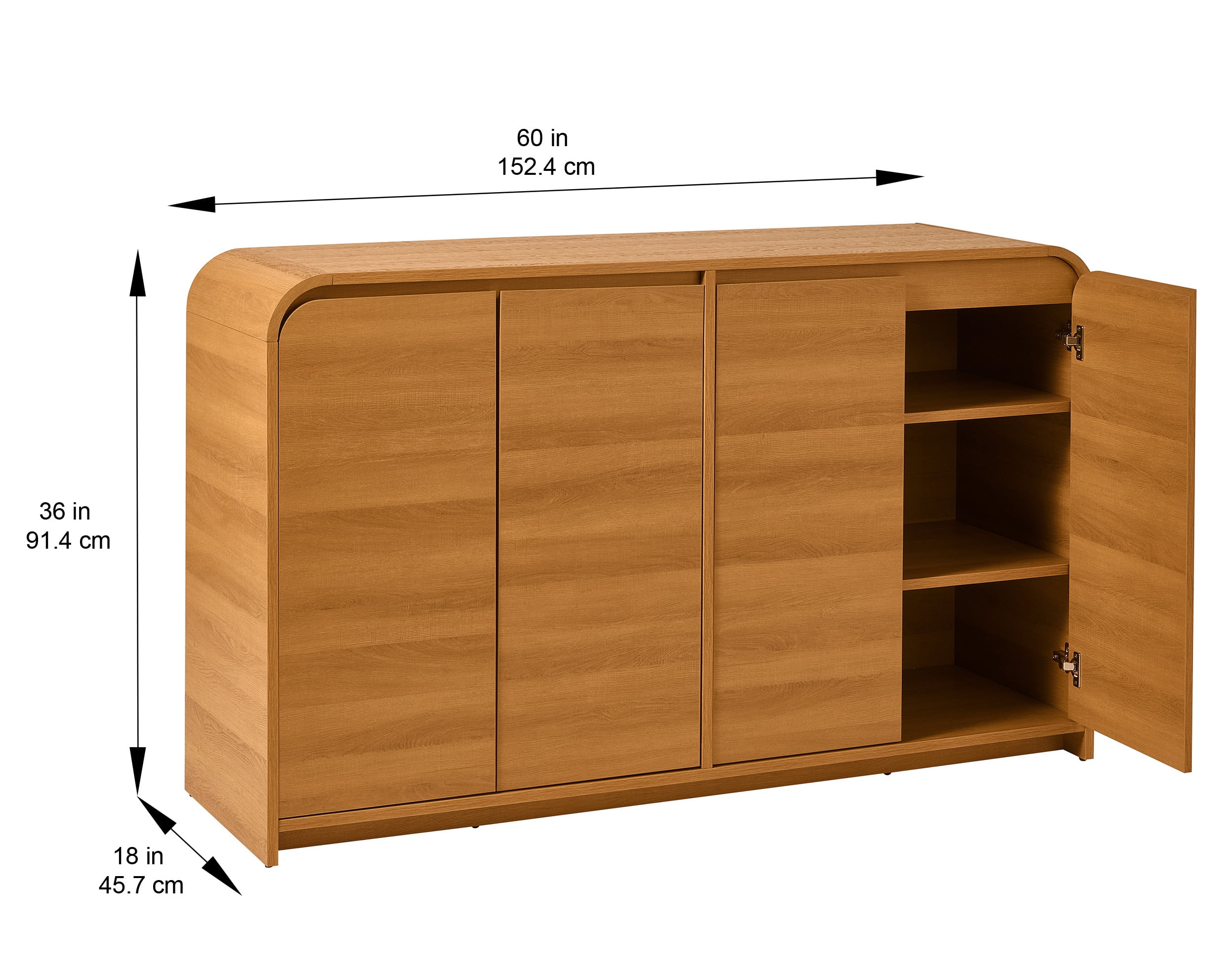 Two-Tier Shelving: This buffet includes two shelves, providing ample space to store kitchen or household essentials. Magnetic Cabinet Catches: Enjoy the convenience of quiet and easy opening and closing with magnetic catches. The buffet is also easy to assemble. Package Details: This item includes two packages, each containing one cabinet. Specifications: • Style: 4 Door • Dimensions: 60” W x 18” D x 36” H • Mounting Type: Floor mount • Shape: Rectangular • Number of Shelves: 2 • Product Care: Wipe clean with a dry cloth • Assembly Required: Yes Additional Features: • Durable Construction: Made from MDF board, the top surface can support up to 50 pounds. The thickened board ensures a sturdy and stable build, resistant to deformation or bending over time. • Multiple Storage Spaces: The fluted cabinet design features two storage compartments, each with adjustable shelves offering three different height options. This design makes it easy to organize and access your items. • Multi-Functional: Whether used as a credenza, kitchen cabinet, console table, buffet, or entryway cabinet, this piece excels in both style and storage. It seamlessly integrates into any room, including the living room, dining room, or bedroom. • Easy Assembly: Each part is labeled for easy identification, and the instructions include detailed illustrations. No specialized tools or knowledge are required, making for a quick and easy assembly process. Assembled dimensions: 60” W x 18” D x 36” H.