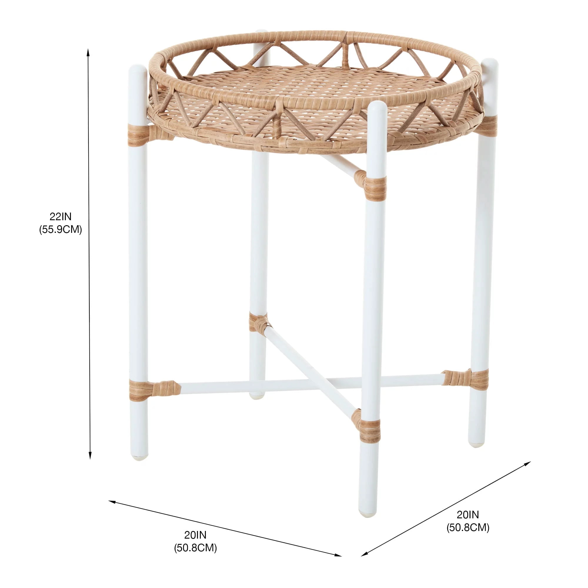 Better Homes & Gardens Lilah Outdoor 20″ Round End Table, White Table dimensions: 20″ x 20″ x 22″ Handwoven, all-weather resin wicker for durability Removable tray table for added convenience Heavy-duty, rust-resistant, e-coated & powder-coated steel frame Durable and low-maintenance design Assembly required; instructions, hardware kit, and tools included Coordinates with other pieces in the Lilah patio collection (sold separately) Arrives in one box for easy handling Wipe clean with a damp cloth; air dry. Do not use bleach or solvent. Furniture cover recommended