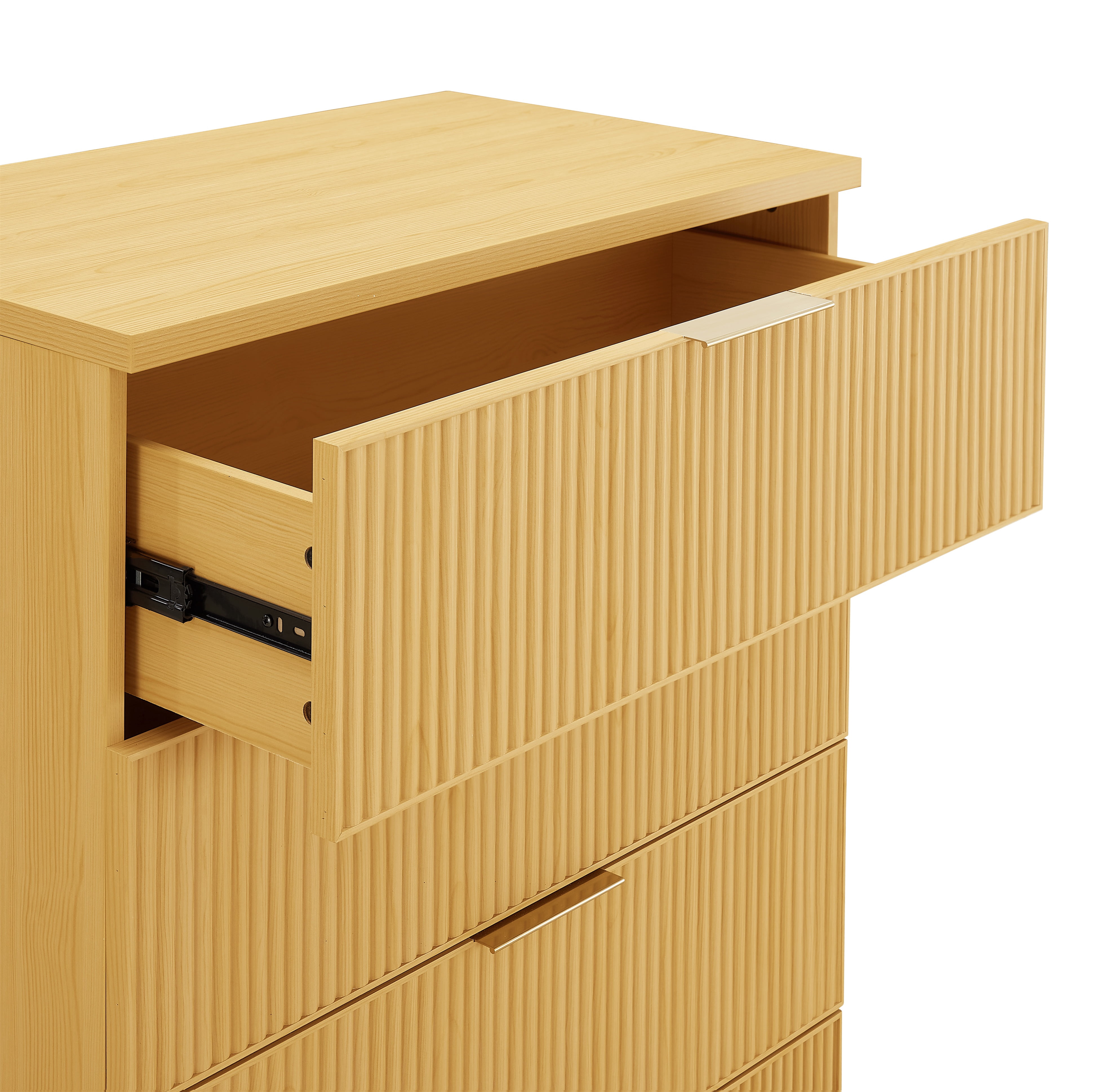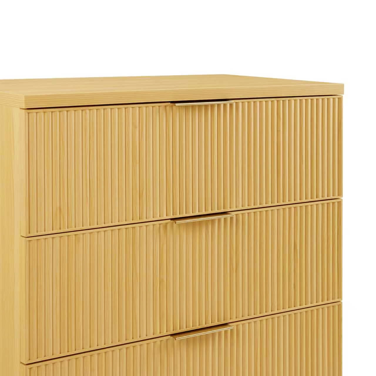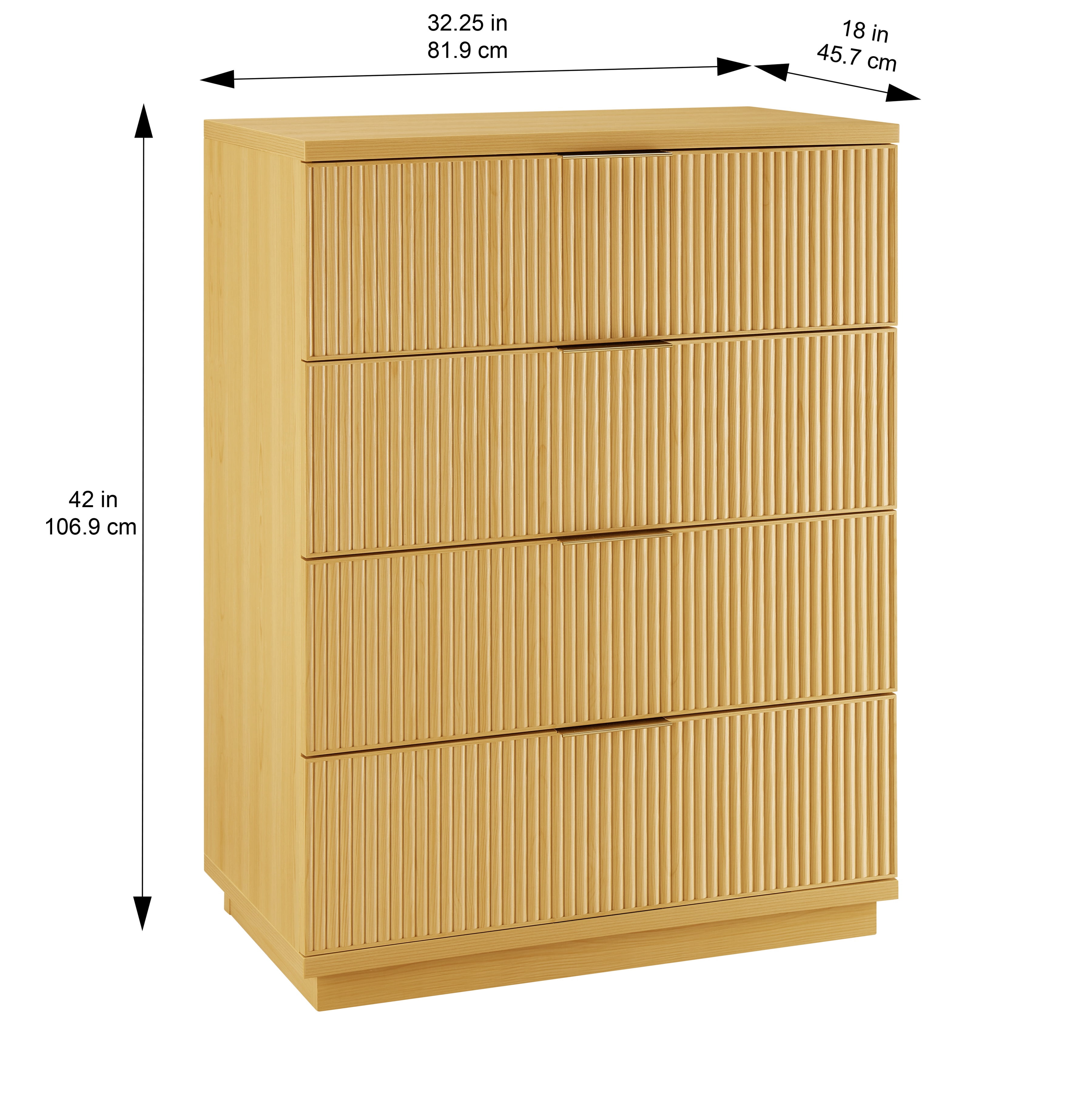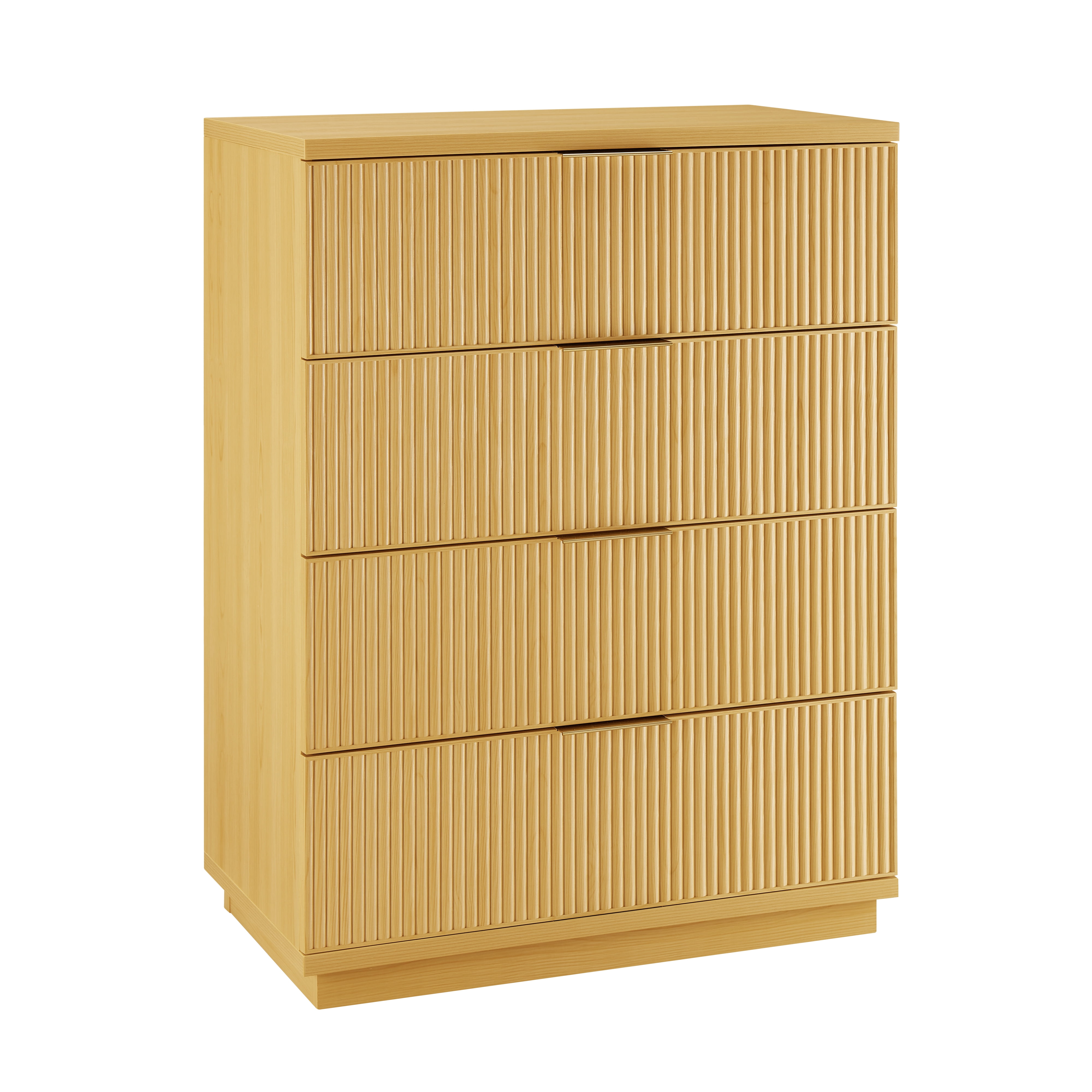 Add style and function to your bedroom with the Better Homes & Gardens Lillian Fluted 4 Drawer Dresser in a natural pine finish. Featuring a textured fluted drawer front design, this dresser combines elegance and durability, making it an ideal addition to bedrooms, guest rooms, or entryways. With four spacious drawers, this tall dresser provides ample storage space for clothing, accessories, and more. The compact vertical design is perfect for small spaces, apartments, and dorm rooms, helping you keep your belongings organized and clutter-free. Crafted from high-quality materials, the smooth, polished finish adds a sophisticated touch, while the sleek metal handles offer a modern, elegant accent. The stable bottom base ensures durability and strength. Pair this piece with other contemporary furniture from the Better Homes & Gardens Lillian Collection to complete the look.