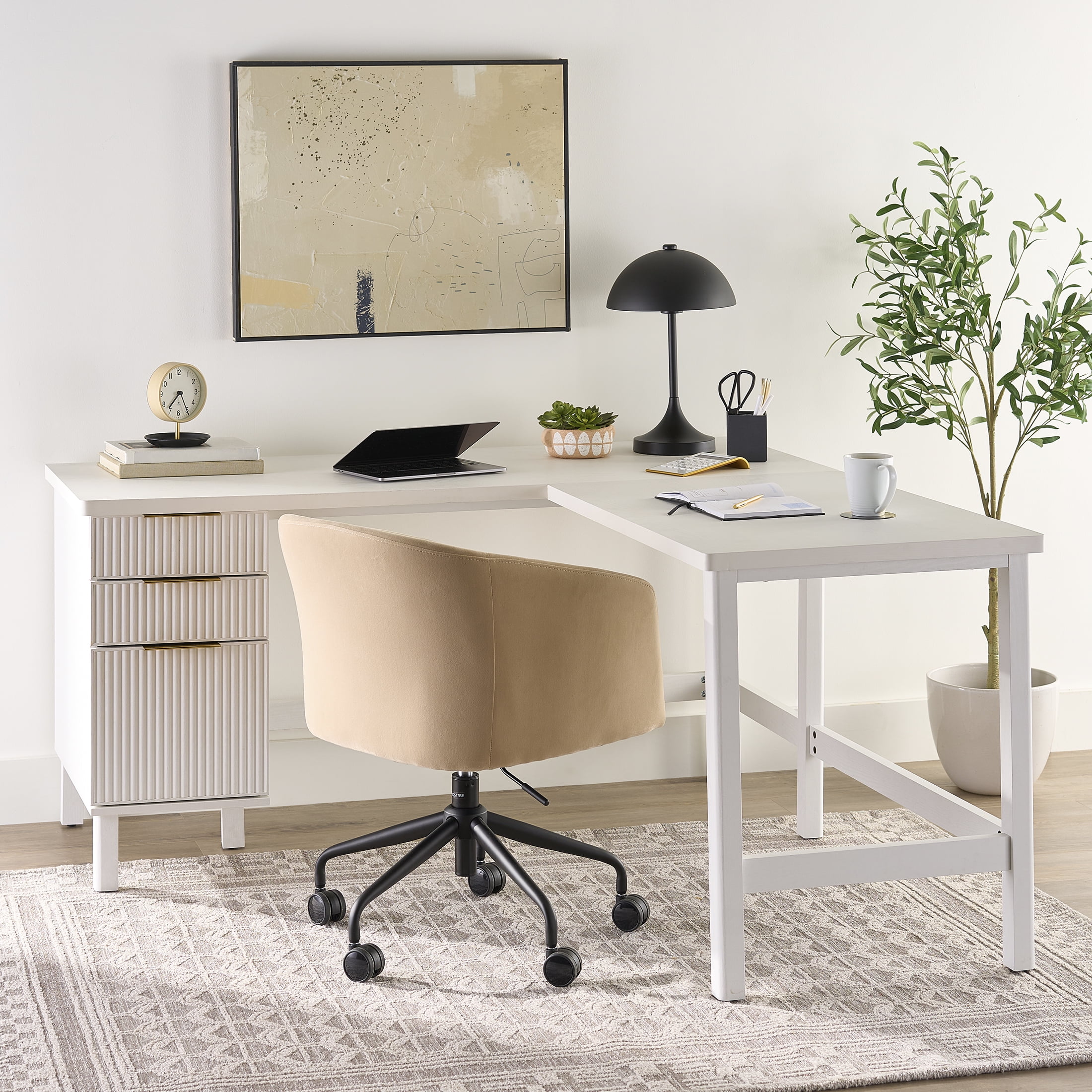Create a modern, bright, and stylish home workspace with the Lillian Fluted L-Shape Desk from the Better Homes & Gardens collection. This durable desk features a pristine white finish and a sleek silhouette that complements various décor styles, from modern to cottage to coastal. The desk showcases a fluted design with vertical grooves on the three drawer fronts for a textured, ribbed look. With a spacious corner work surface, it provides ample room for work or study. The desk also includes two smaller storage drawers and one large file drawer to keep your workspace organized and clutter-free. Enhance your home office with the Lillian Fluted L-Shape Desk, and pair it with other pieces from the Lillian Fluted Collection, including tables, cabinets, office seating, and more for a cohesive, elegant design.
