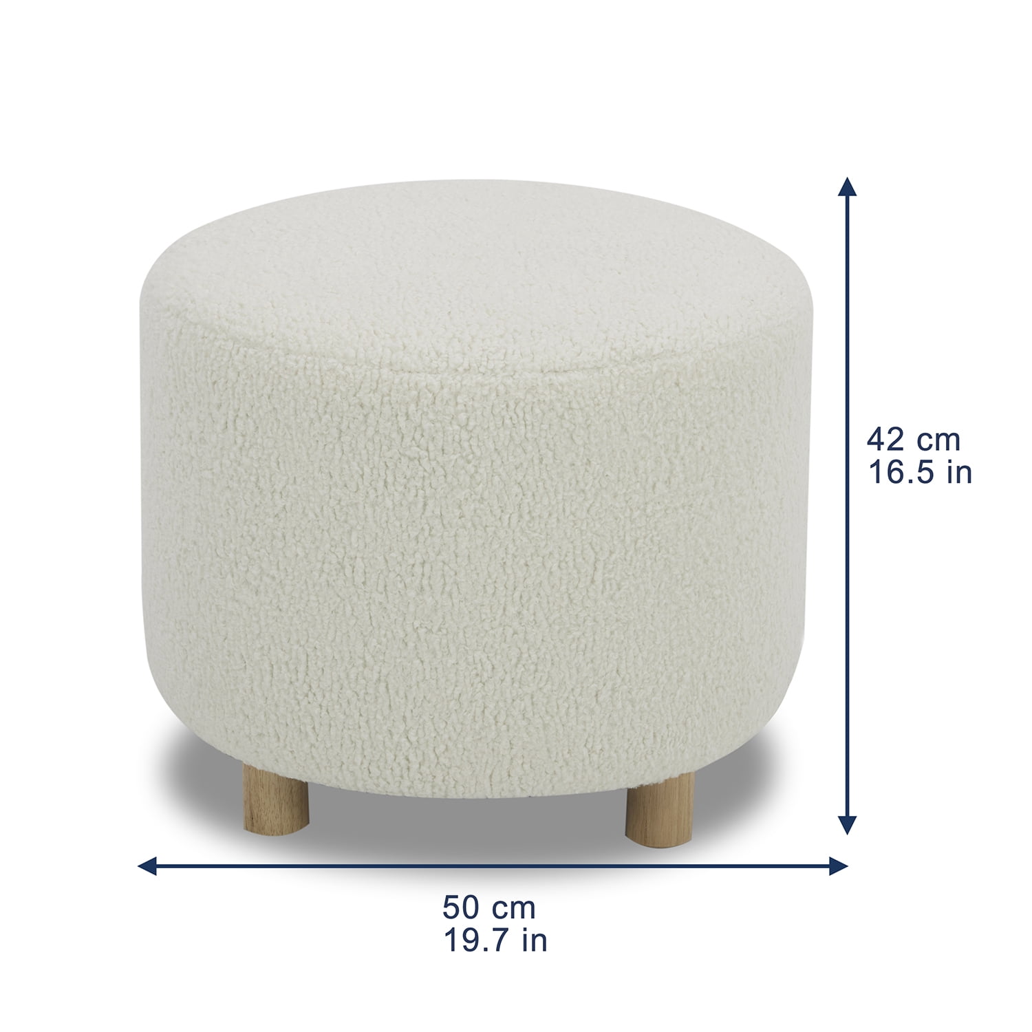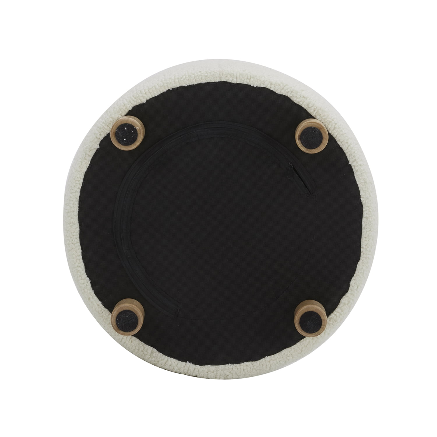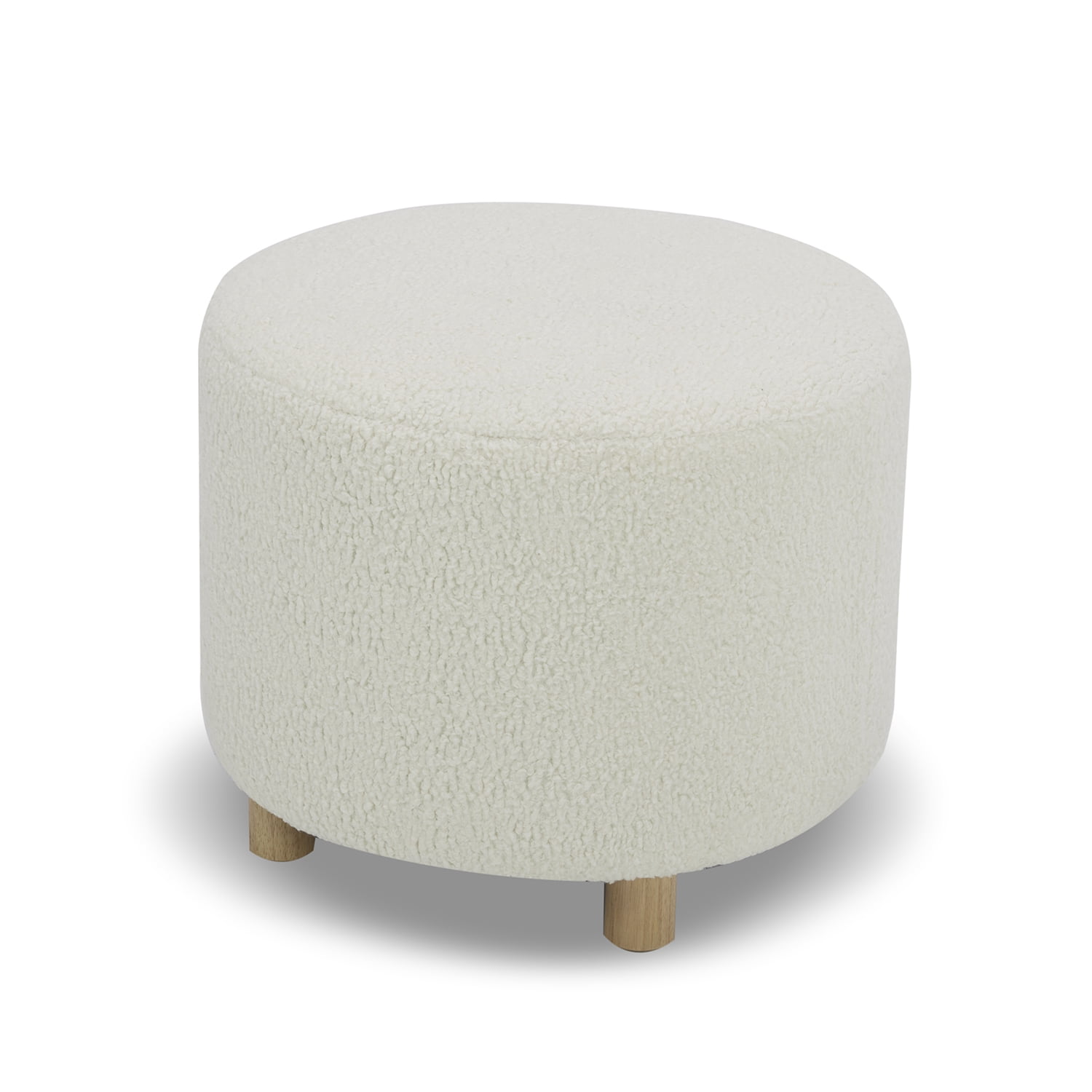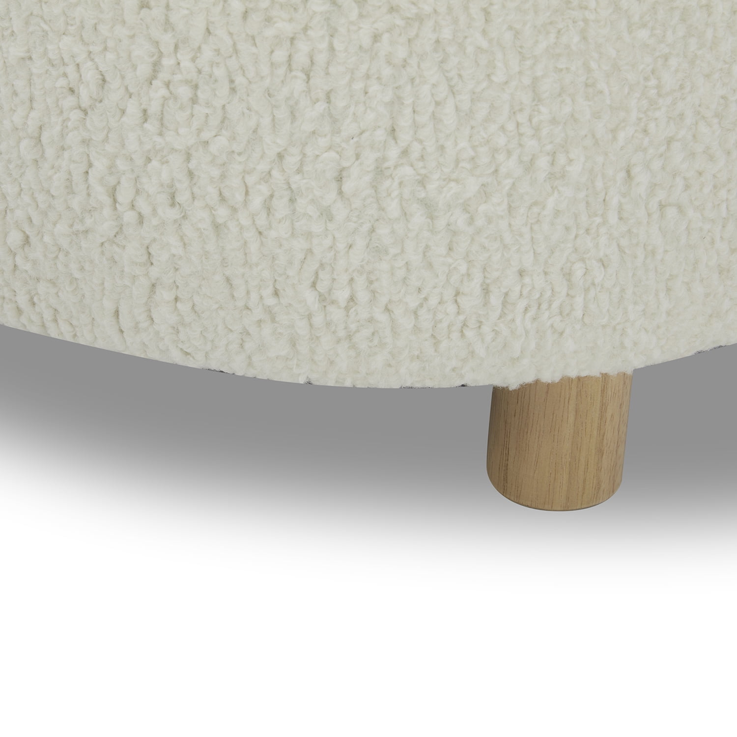 Chic, minimalist and modern, the Faux Sherpa Cream Ottoman in a stylish round shape is covered in a plush piled fabric for a soft, fluffy and comforting texture. Slim tapered solid wood legs in a warm honey finish and matching stitching on the upholstery and reversible cushion create a refined look with designer appeal. The ottoman offers trouble-free, enduring quality with solid hardwood construction and reinforced joints, along with premium high-density foam and a heavy no-sag suspension construction system. Get started relaxing with no delay: assembly is easy and fast by simply attaching the legs to the base of the modern ottoman.