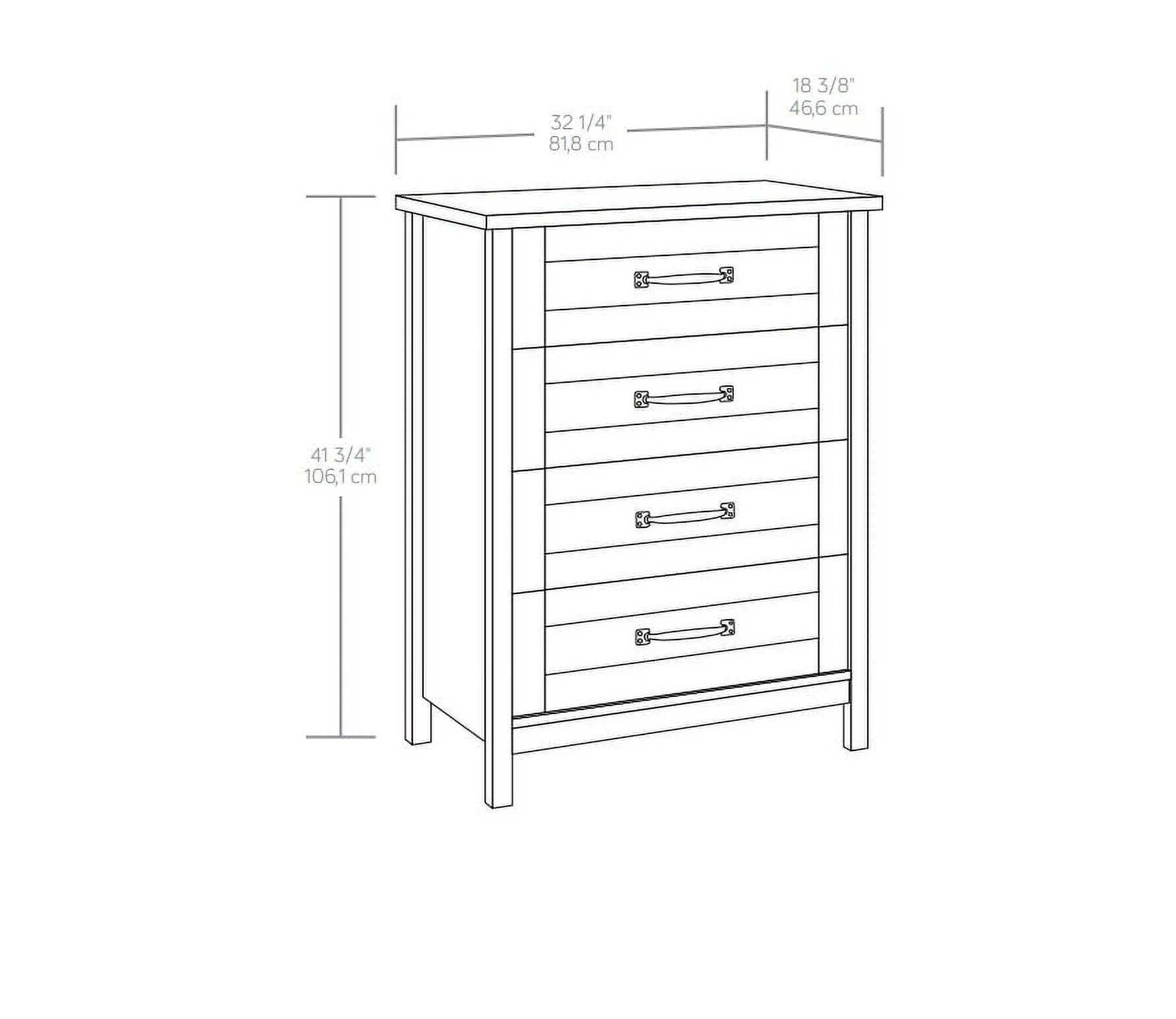 Assembled Dimensions: 32.21″ L X 18.35″ W X 41.77″ H Drawers feature metal runners and safety stops Interlocking safety mechanism allows only one drawer open at a time This chest complies with ASTM F2057-23 Standard Safety Specifications for Clothing Storage Units as required by the STURDY Act Rustic Gray Finish Model 437116 For additional questions or any issues, please contact the manufacturer at 1-800-523-3987 Shop additional items in the Better Homes & Gardens Modern Farmhouse collection!