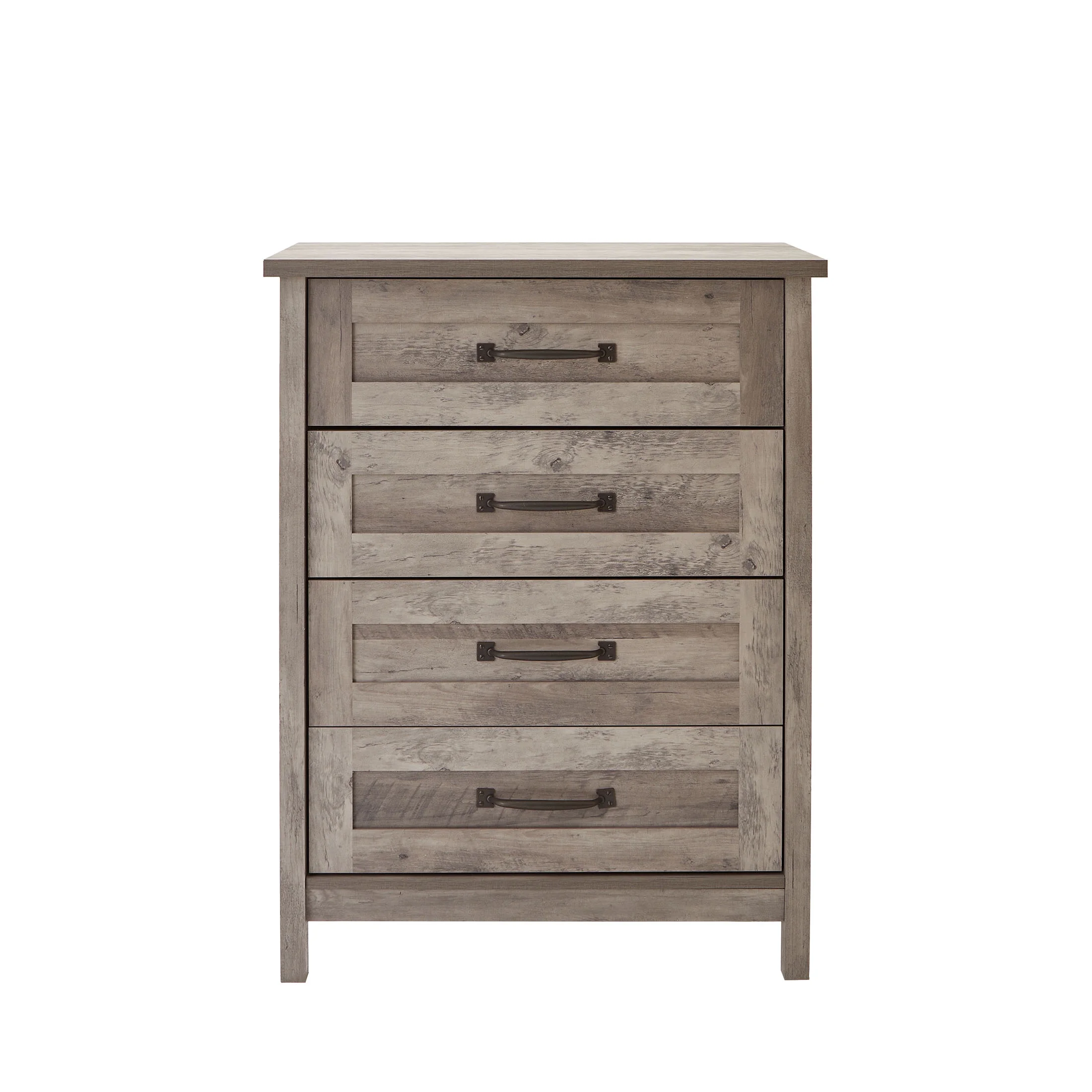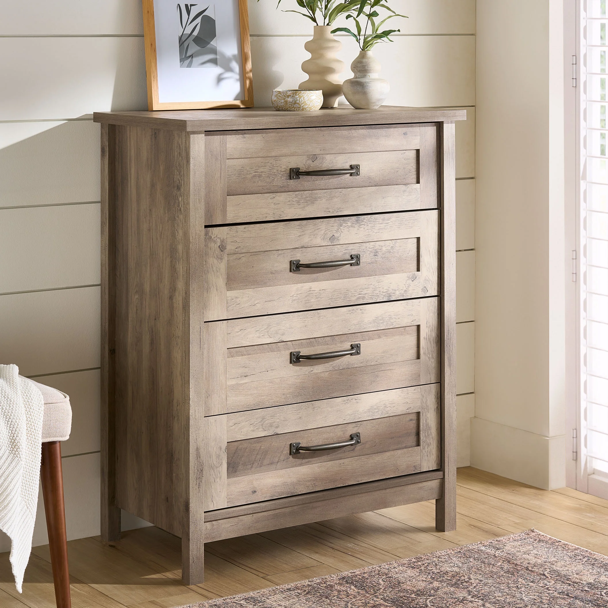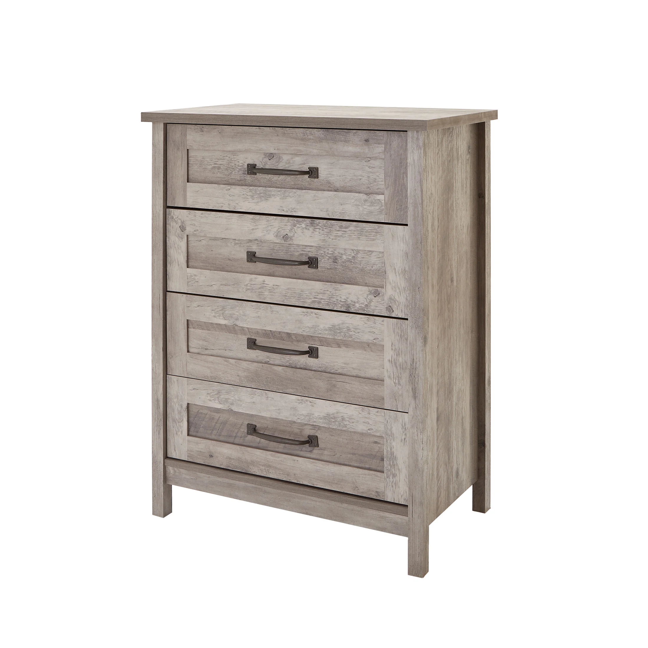 There is no such thing as too much storage space. Create versatile storage for all your things while adding beautiful style and charming design with this 4-drawer chest from the Better Homes & Gardens Modern Farmhouse collection. This handsome chest of drawers features four large drawers that open and close on smooth metal runners, making them ideal for easy access storage of an array of different items like stacks of your favorite blouses and your best-fitting jeans to your secret collection of old t-shirts and your comfy sweatpants. You can find a space for all your things! It also features a spacious top surface that provides you with room to store additional bedroom items or display home decor like an accent lamp, bottles of cologne, your makeup bag, and pictures of your family and friends too. Its framed panel doors and stylish hardware give this dresser a look that is sure to stand out in your bedroom. Finished in Rustic Gray, this stunning chest of drawers is the solution to all your storage woes.