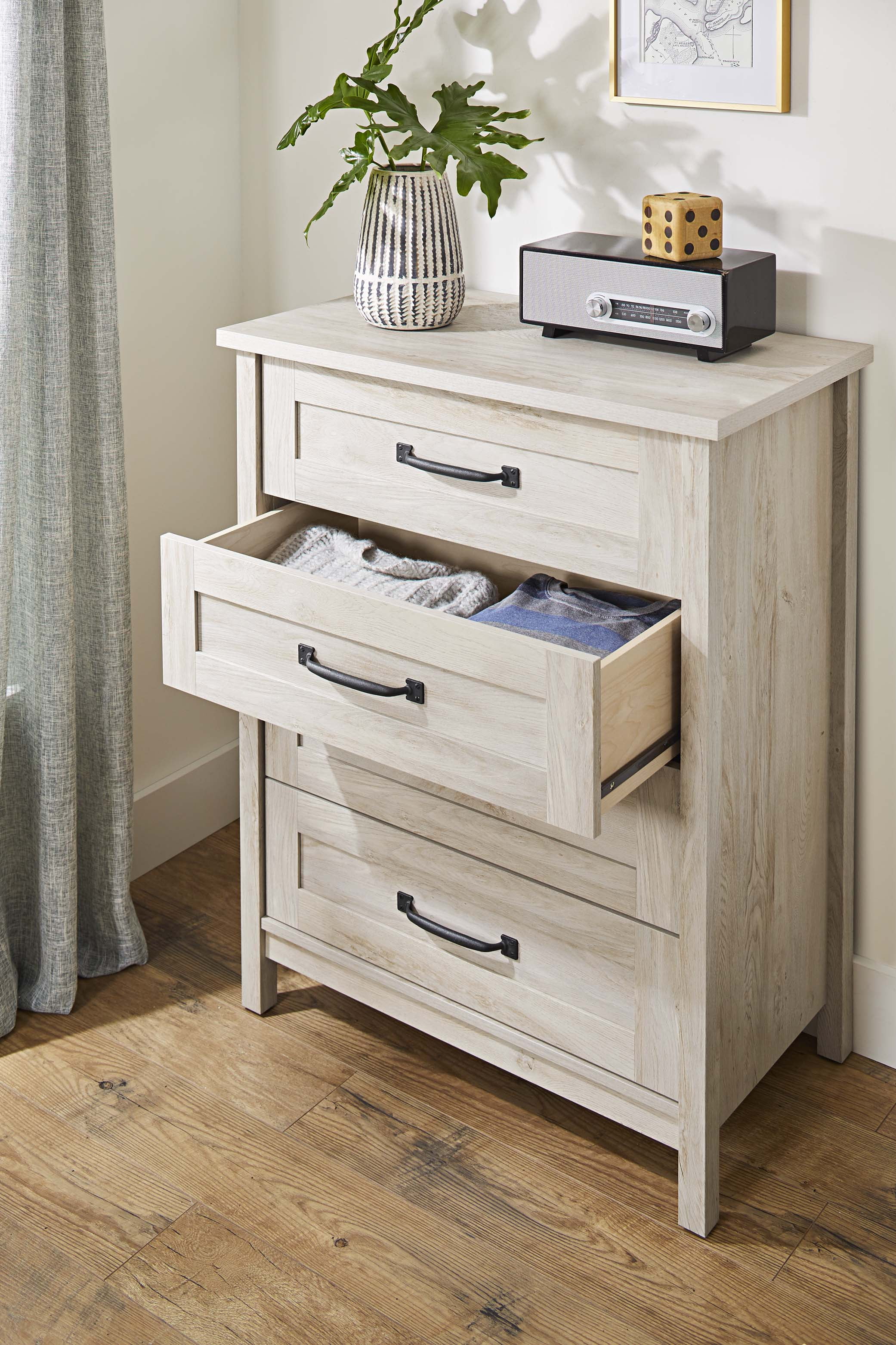Assembled Dimensions: 32.21″ L x 18.35″ W x 41.77″ H Four spacious drawers Drawers feature metal runners and safety stops Interlocking safety mechanism allows only one drawer open at a time This dresser complies with ASTM F2057-23 Standard Safety Specifications for Clothing Storage Units as required by the STURDY Act Rustic White finish Model #: 437117 Box Dimensions: 48.89″ L x 20.87″ W x 12.52″ H For additional questions or any issues, please contact the manufacturer at 1-800-523-3987. Be sure to check out the Better Homes & Gardens Modern Farmhouse collection for more great items!