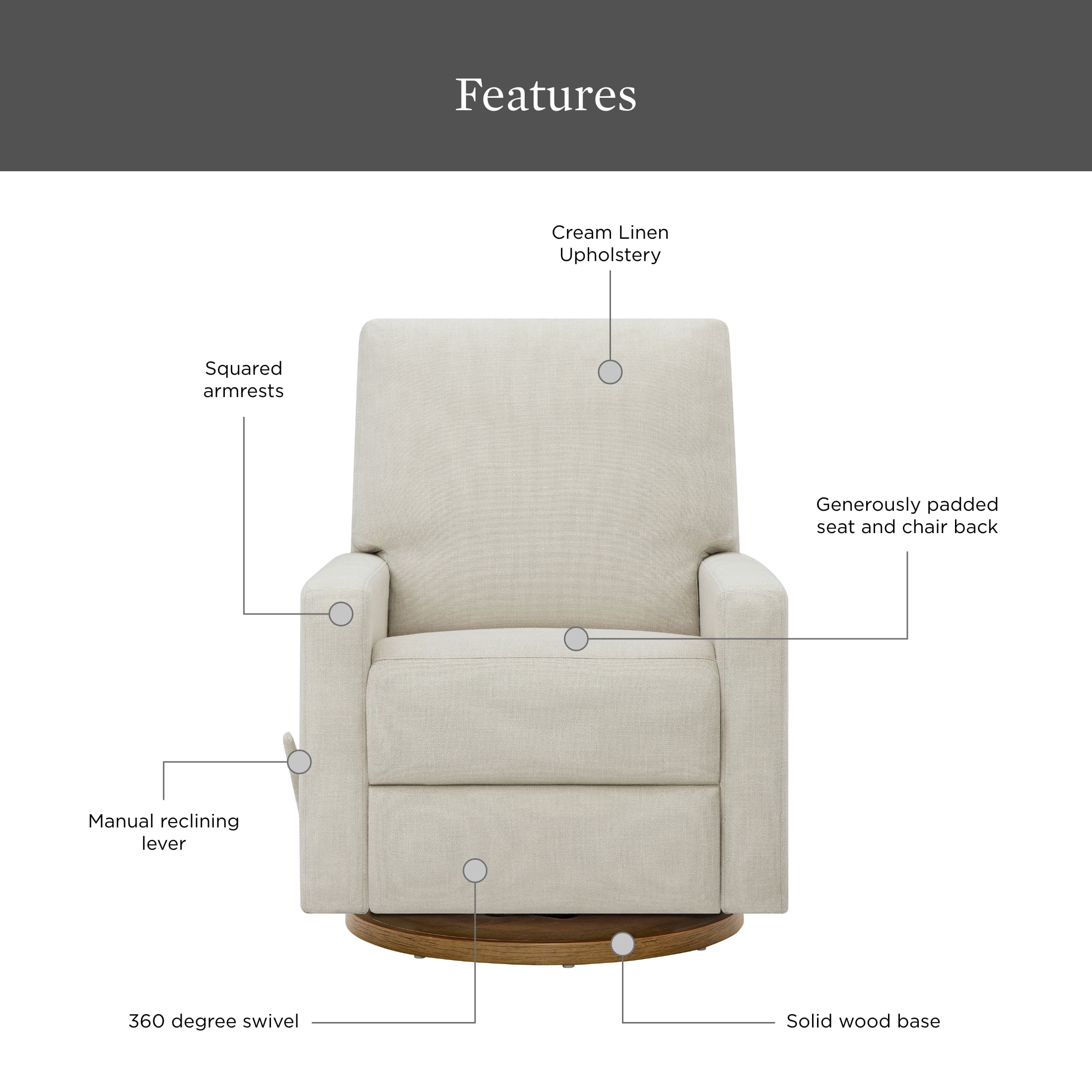 360-degree swivel for easy, flexible seating Manual reclining lever lets you kick back with ease Solid wood base ensures durability and stability Durable upholstery available in Cream Linen or Camel Faux Leather Farmhouse design brings rustic charm to any room Available in 2 colors: Cream Linen and Camel Faux Leather Product Dimensions: 31.5 IN W x 37 IN D x 40.5 IN H (80.1 CM x 94 CM x 102.9 CM) Packaging Dimensions: 32.5 IN x 30 IN x 34 IN Model# BH4331098397B01, BH4331096437001