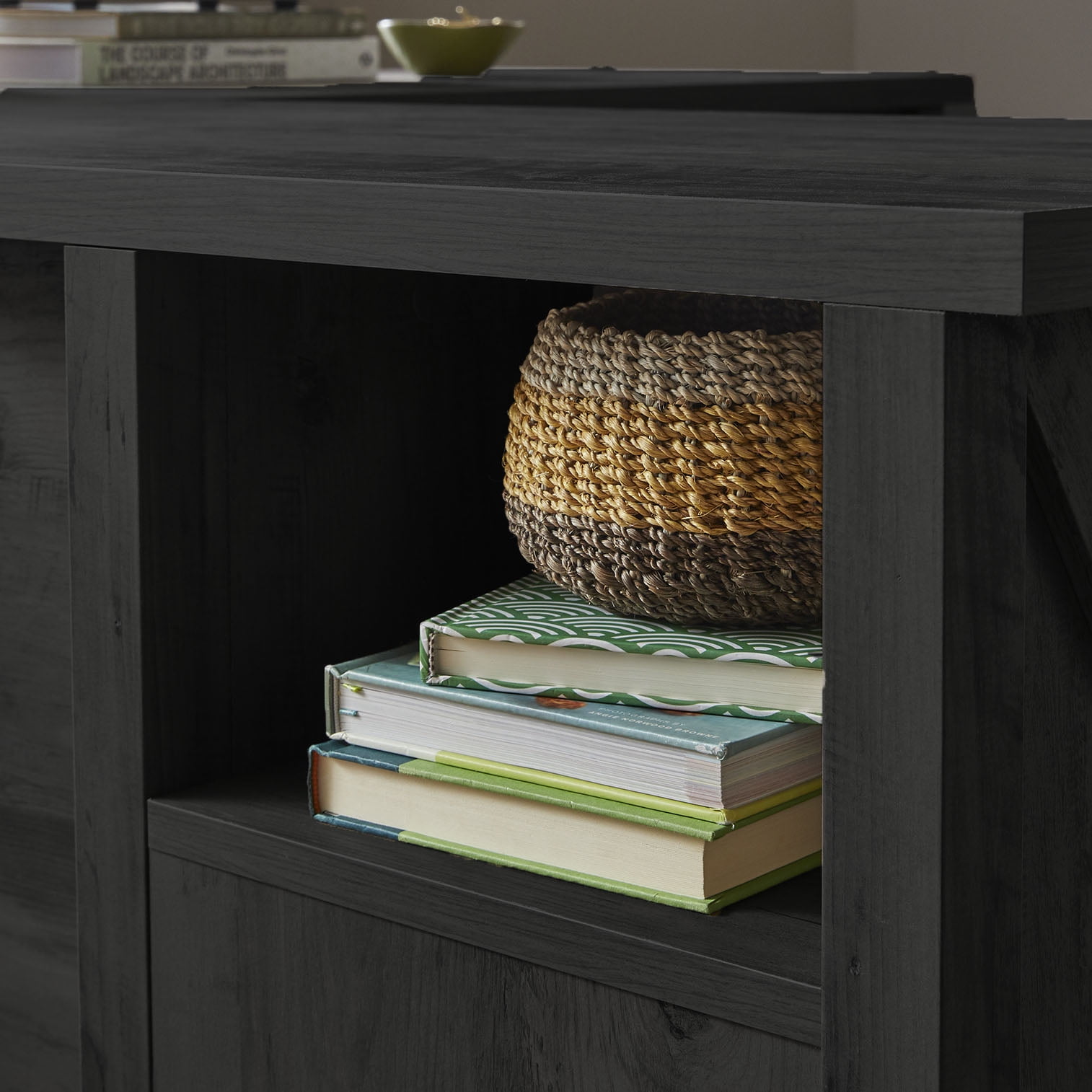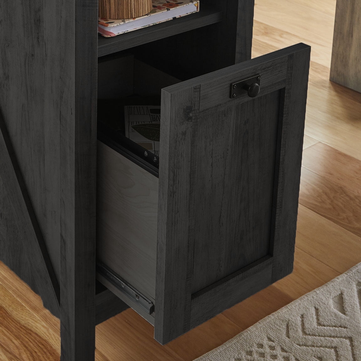 Assembled Dimensions: 66.38″ L X 58.39″ W X 29.25″ H Spacious work area Drawer features full extension slides Open shelf for additional storage Finished on all sides for versatile placement Charcoal finish Model #: 433585 Box Dimensions: 48.63″ L x 19.00″ W x 5.63″ H For additional questions or any issues, please contact the manufacturer at 1-800-523-3987. Be sure to check out the Better Homes &; Gardens Modern Farmhouse collection for more great items!