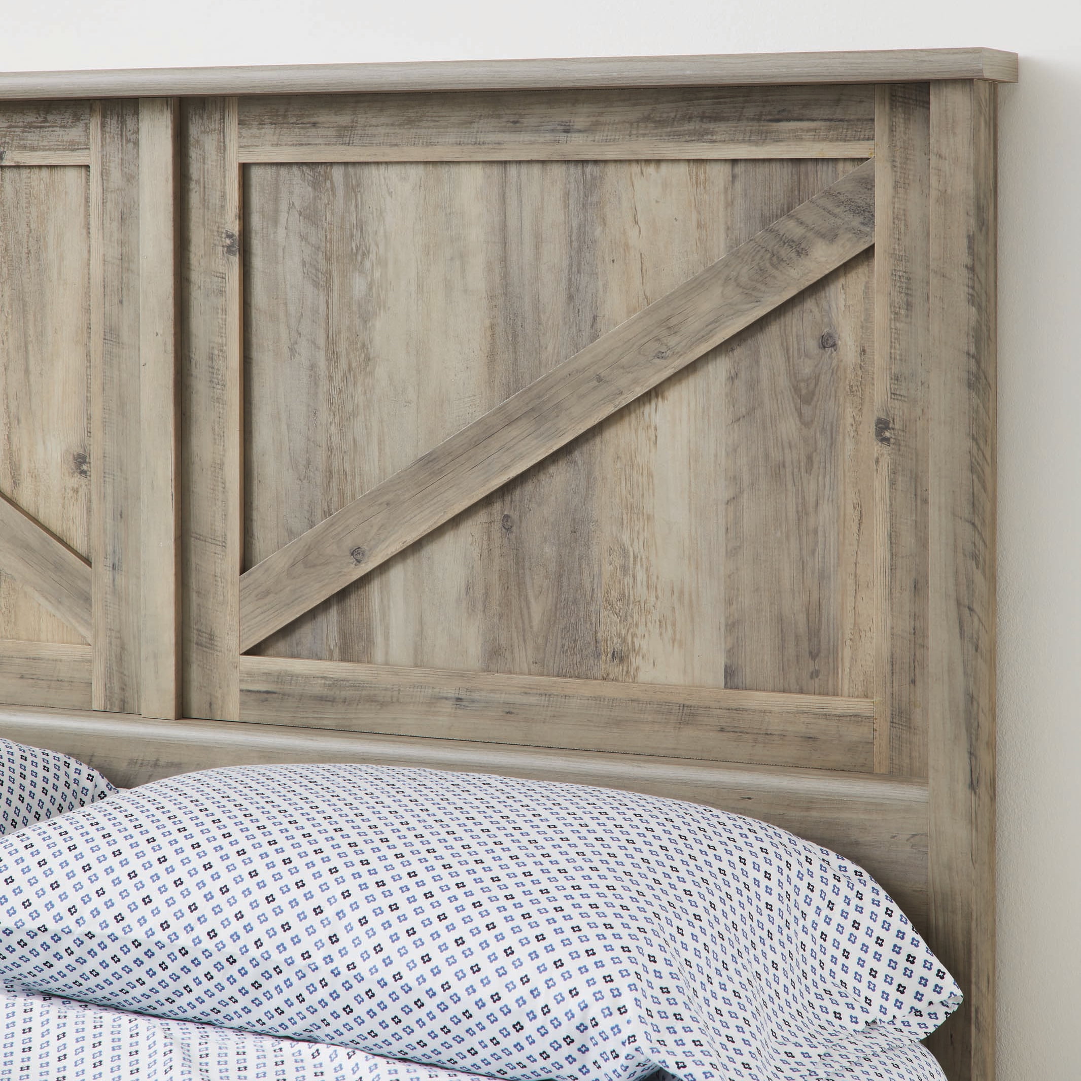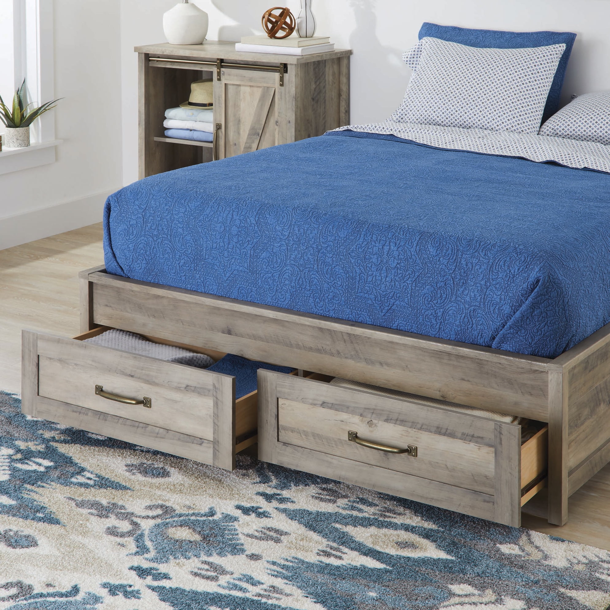 Give your bedroom a fresh, new look and begin to snooze in style with this queen platform bed from the Better Homes & Gardens Modern Farmhouse collection. This bed features a barn wood inspired design headboard which gives it a unique rustic look. It also features, convenient under the bed storage which includes two large drawers that open and close on smooth metal runners. Both drawers feature a removable divider for versatile storage options of an array of different items. Enjoy an easy access space to stow away anything from stacks of sweatshirts and shoes to board games and an extra set of sheets and blankets. You can find room for all your stuff! It accommodates a queen-sized mattress to give you a completed look, whether it is in your master suite or down the hallway in the guest room. It adds cozy style and simplistic beauty no matter where it rests. Its detailed with framed panel doors and stylish hardware to give it its charming good looks. Finished in Rustic Gray, this bed is everything your bedroom needs.