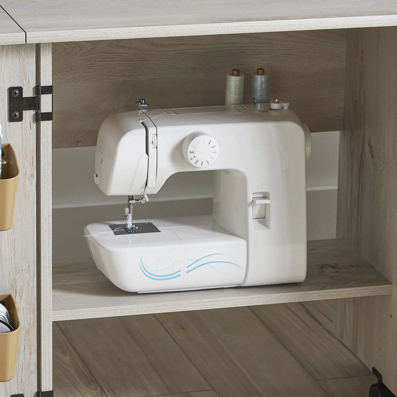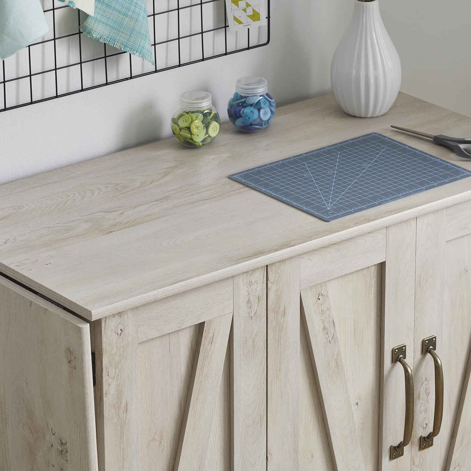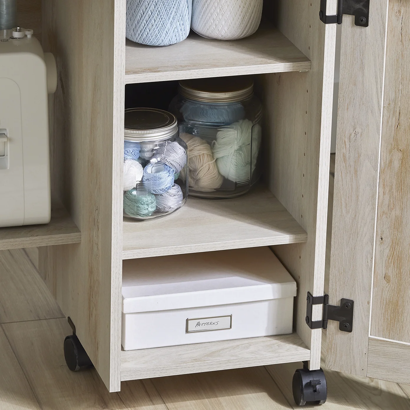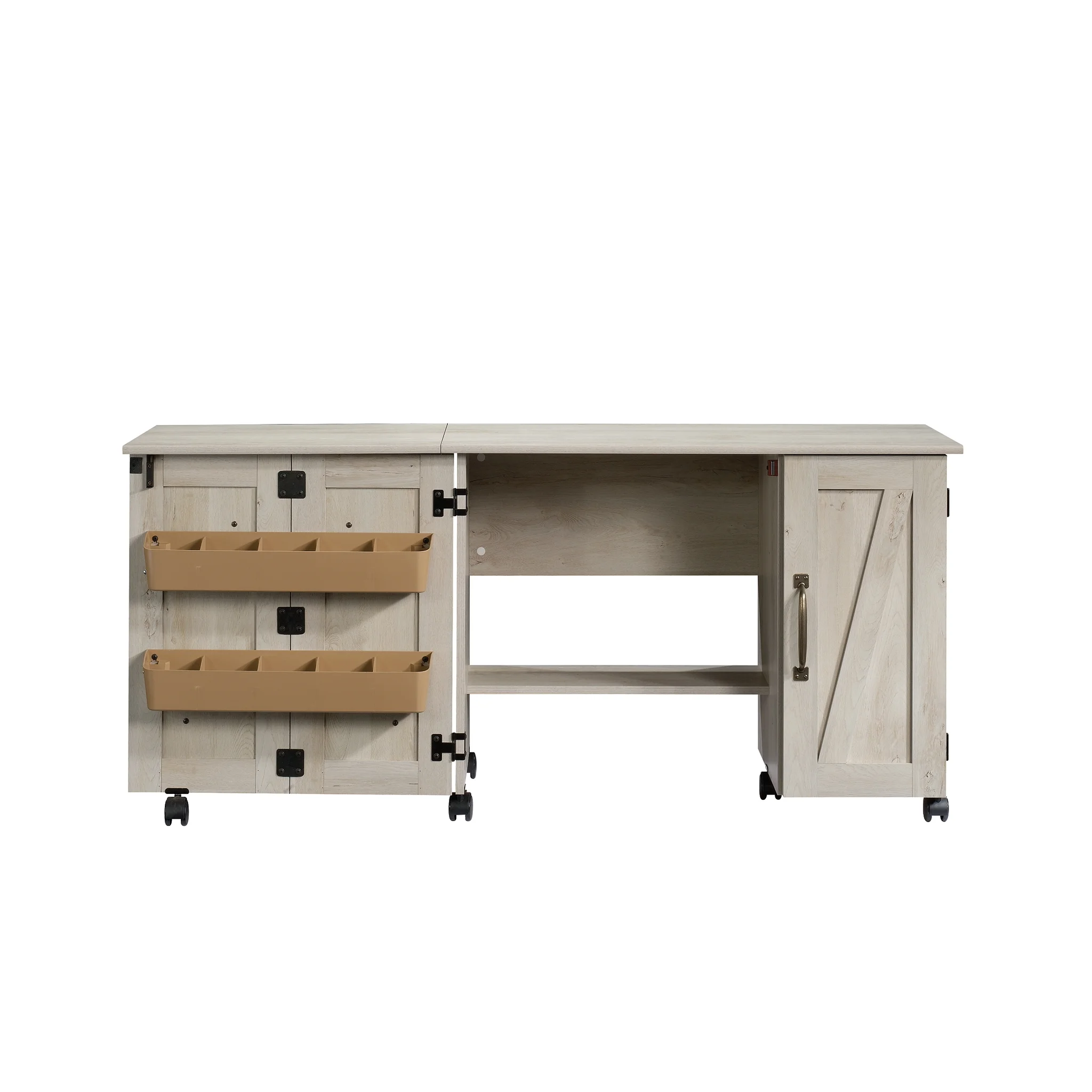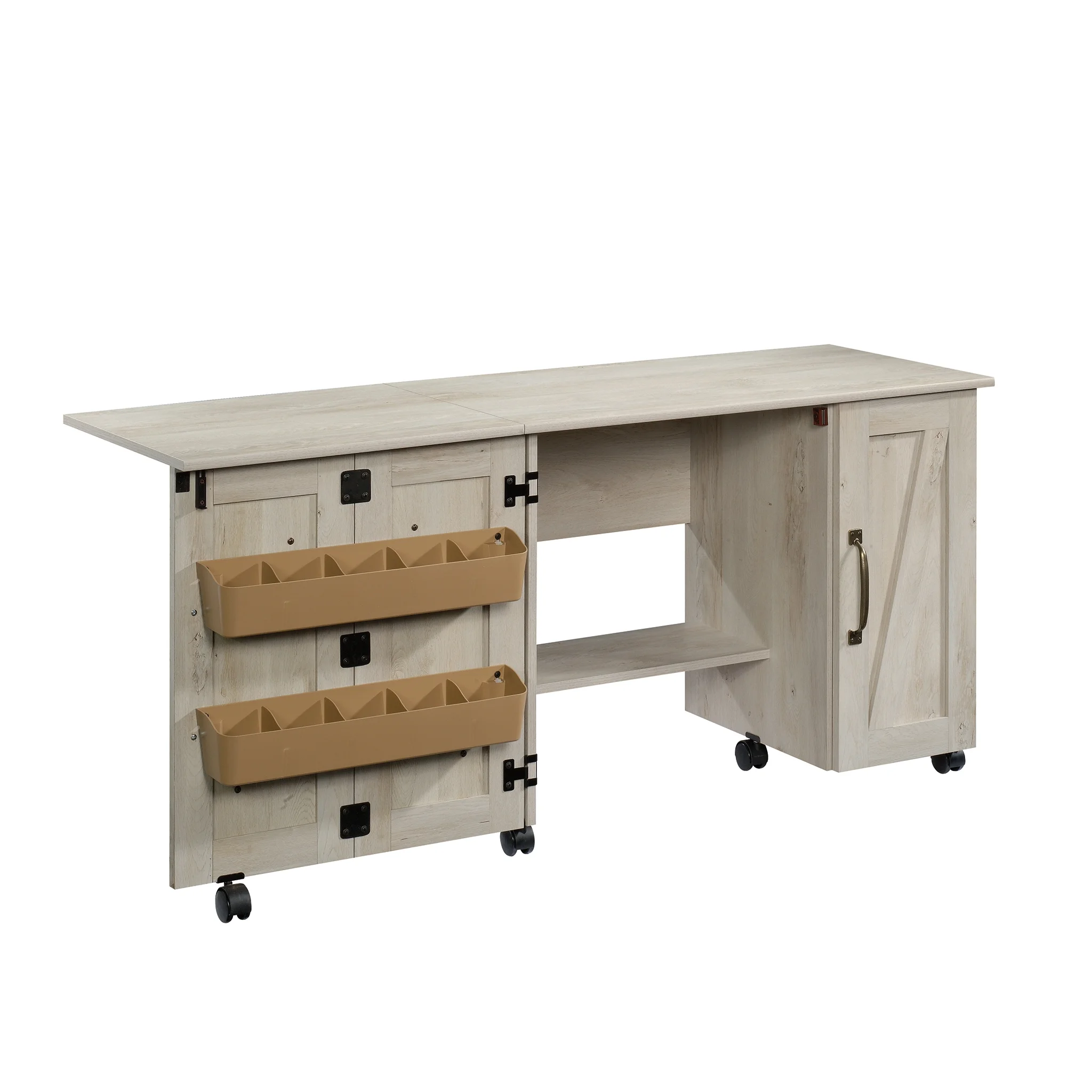 It’s a sewer’s dream come true! Create the space you need to work on all your big sewing and crafting projects with this sewing/craft cart from the Better Homes & Gardens collection. This sewing craft table offers a spacious top surface that provides you with the room you need for all your supplies like your sewing machine, scrapbooks, spools of thread, and organizing bins. The drop leaf tabletop provides you with the extra space you need for sewing and crafting. This craft cart features easy-access storage behind its roll-open doors that includes two storage bins and a hidden shelf for your sewing machine. Behind the door are two adjustable shelves that can move to different heights to create flexible storage for items of all shapes and sizes. This rolling sewing table includes easy-roll casters so it can easily move to wherever your projects take you. Finished in Rustic White, this sewing and craft table is everything you need and more!