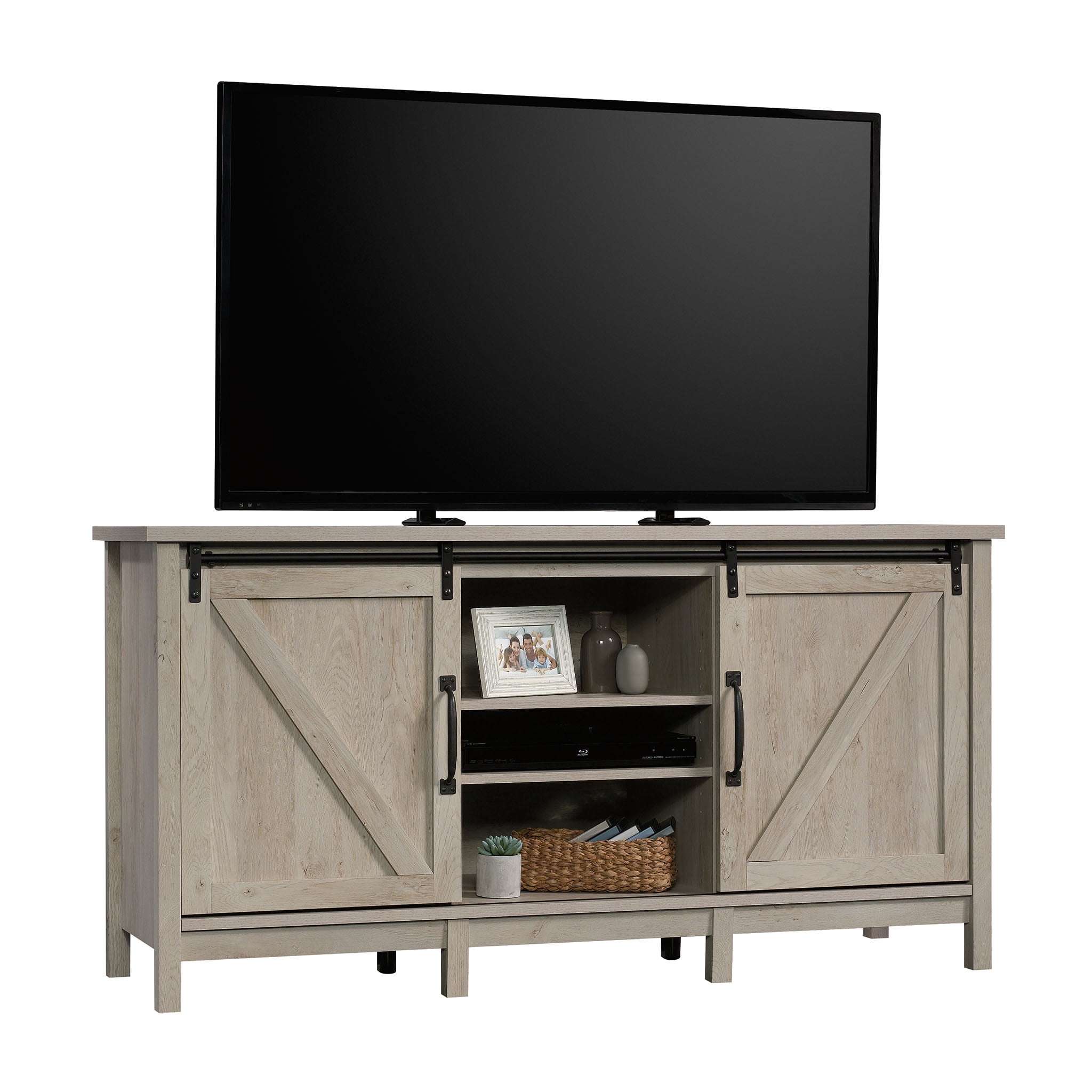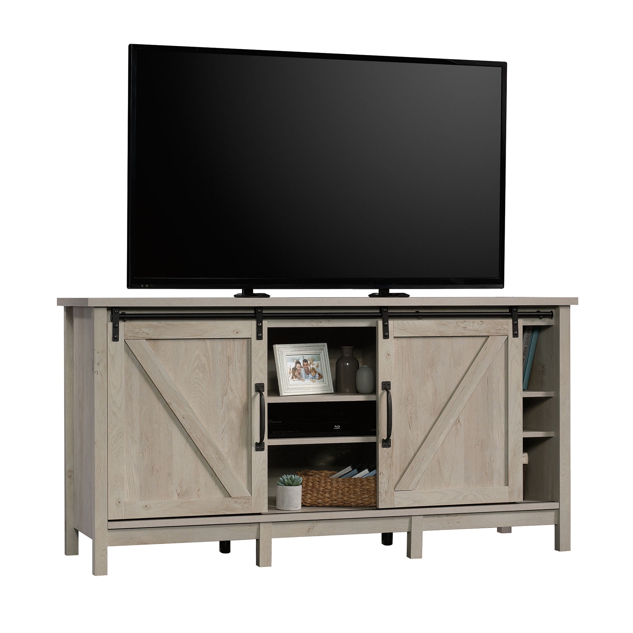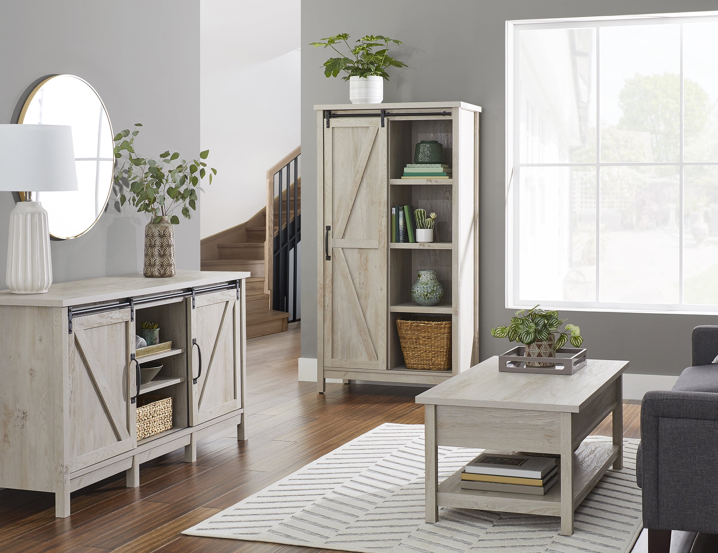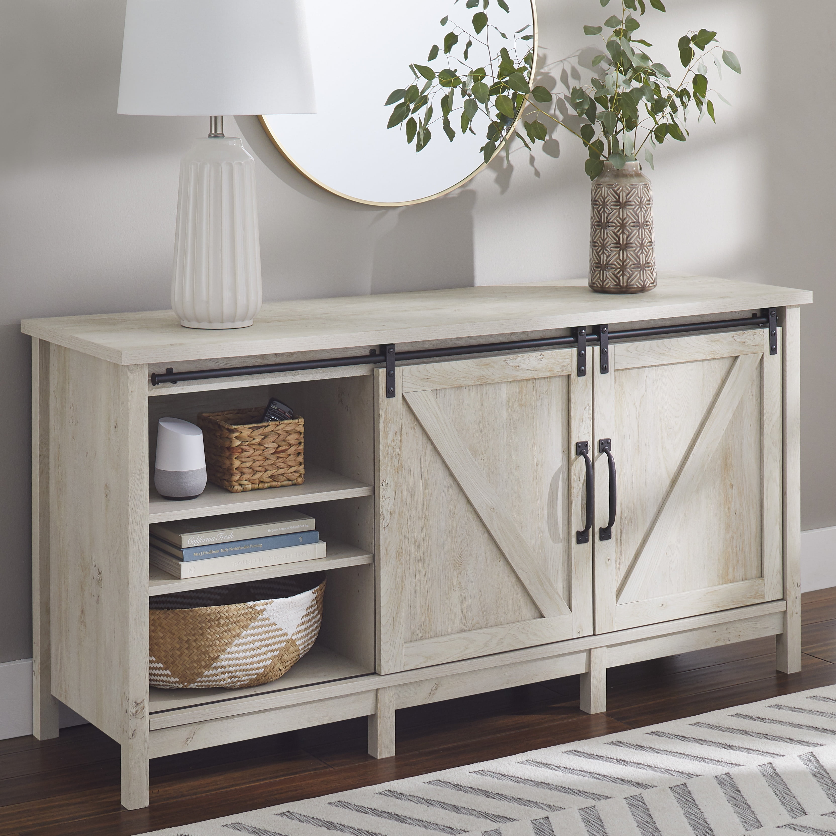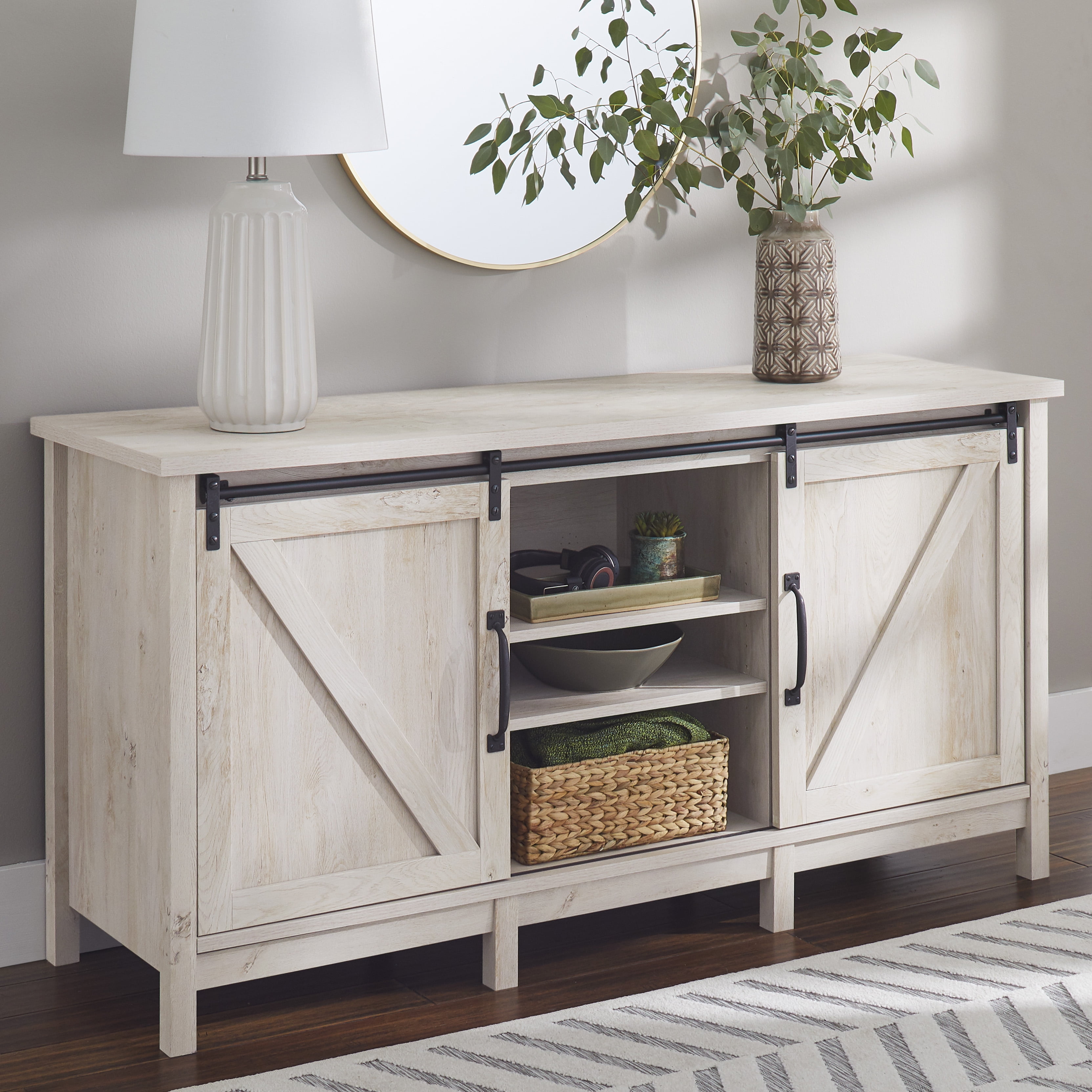 Add a touch of warmth, simplicity and style to your family movie nights. This modern farmhouse TV stand reenergizes your living room with rustic charm and unique design from the Better Homes and Garden& Modern Farmhouse collection. It accommodates up to a 60″ TV weighing up to 70 lbs., making it the perfect spot to cozy up around for all-day movie marathons with your family or endless hours of video games with your friends. Display the best, forget the rest just slide one of the two country-inspired barn doors over! This barn door TV stand allows you to conceal messy cords or living room accessories you may not want on display. The sliding barn door TV stand features six adjustable shelves that can move to different heights to create flexible storage and display options for items of all shapes and sizes. It also includes cord management through the enclosed back panel so you can keep all your wires neat and out of sight. Finished in Rustic White and detailed with beautiful hardware, this rustic tv stand with barn doors will be the simple but stunning centerpiece of your living room.