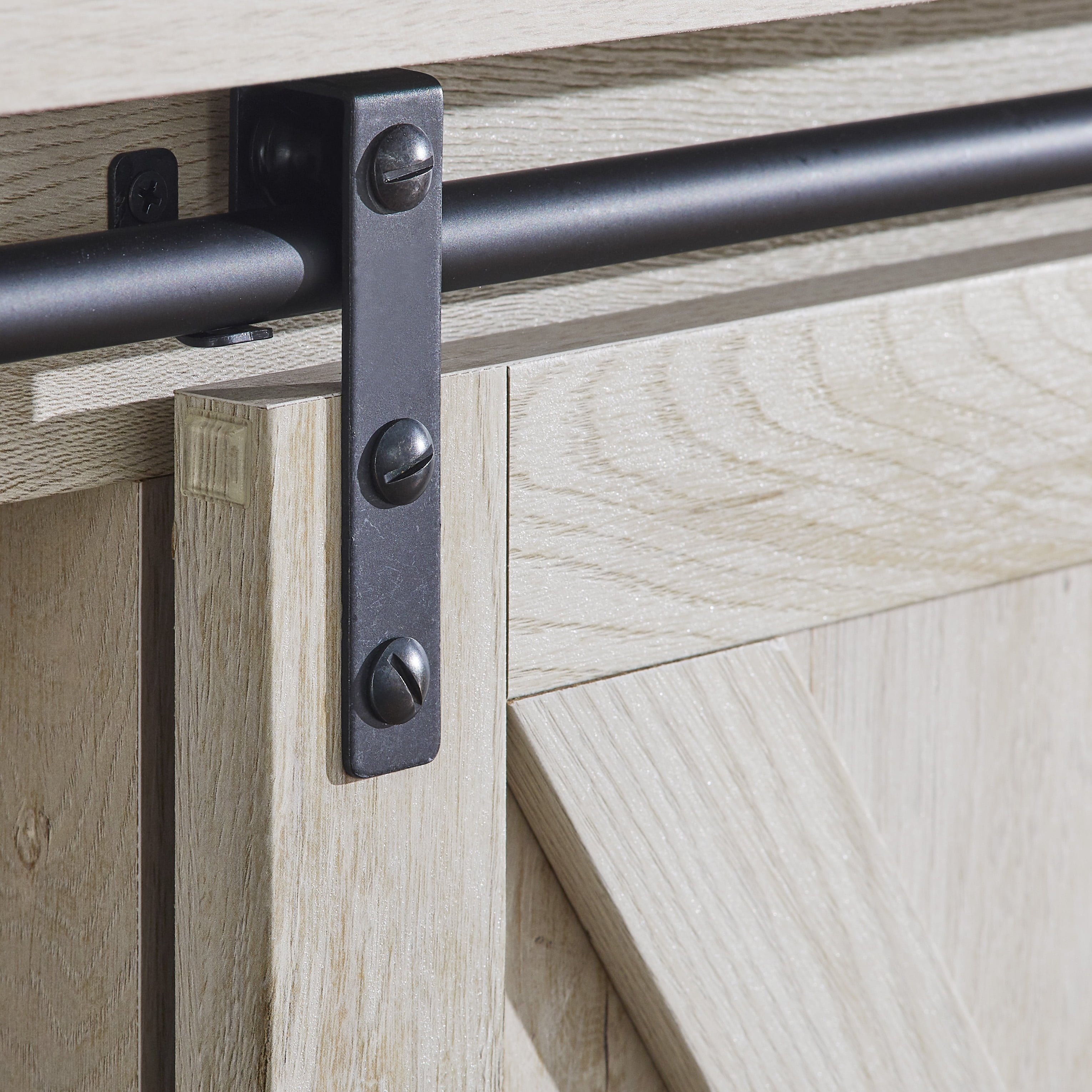 Assembled Dimensions: 62.01″ L x 19.13″ W x 31.77″ H Holds most 60” flat panel TVs up to 70 lbs. Six adjustable shelves Two sliding barn doors Cable management in back panel to avoid clutter Rustic White finish Model #: 427465 Box Dimensions: 68.50″ L x 19.81″ W x 6.13″ H For additional questions or any issues, please contact the manufacturer at 1-800-523-3987. Be sure to check out the Modern Farmhouse collection for more great items!