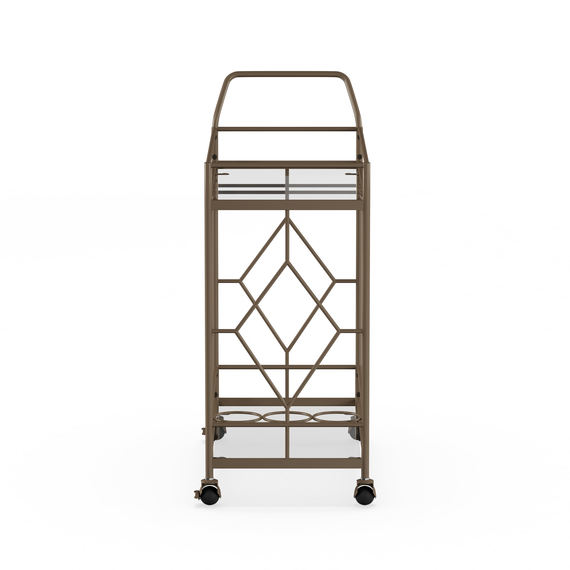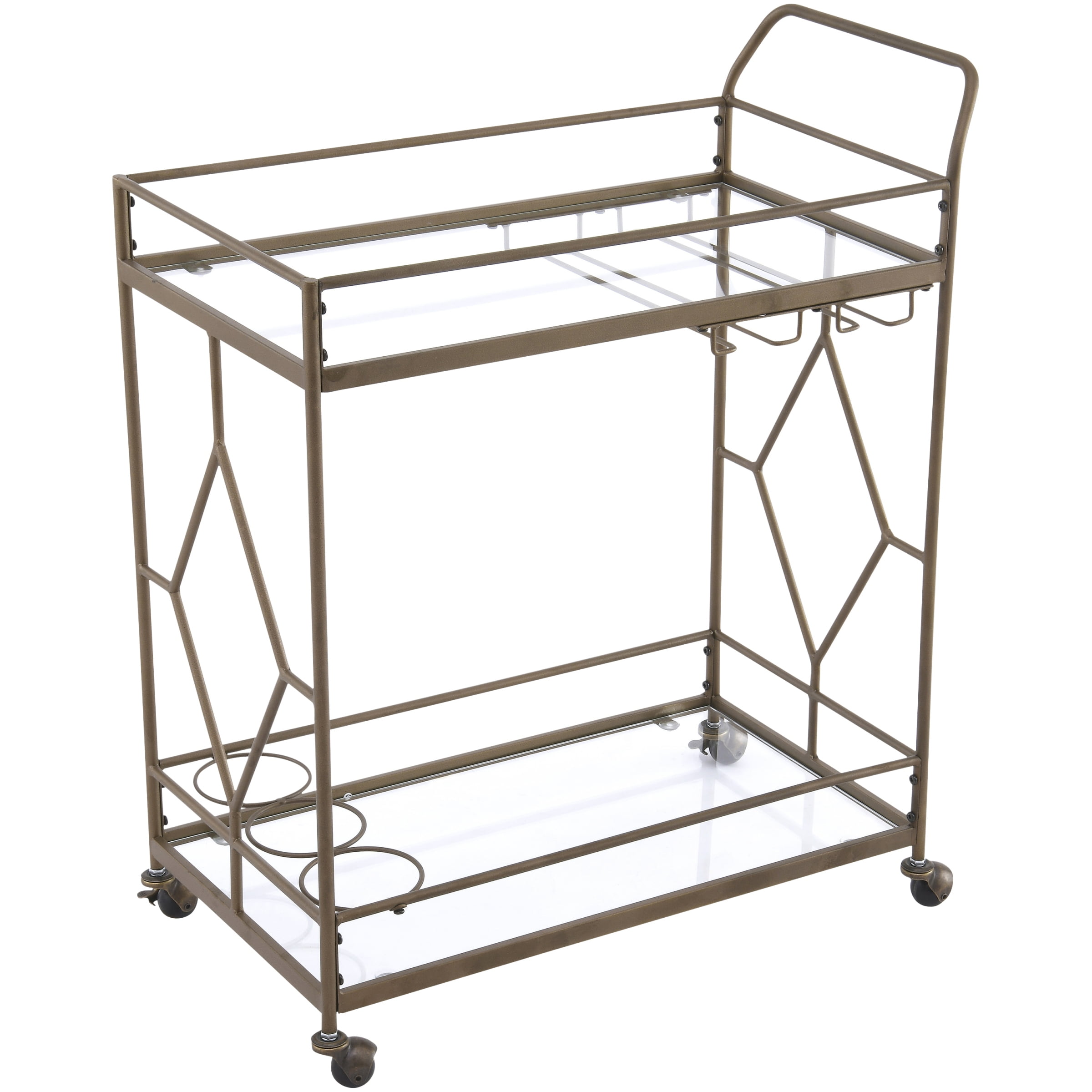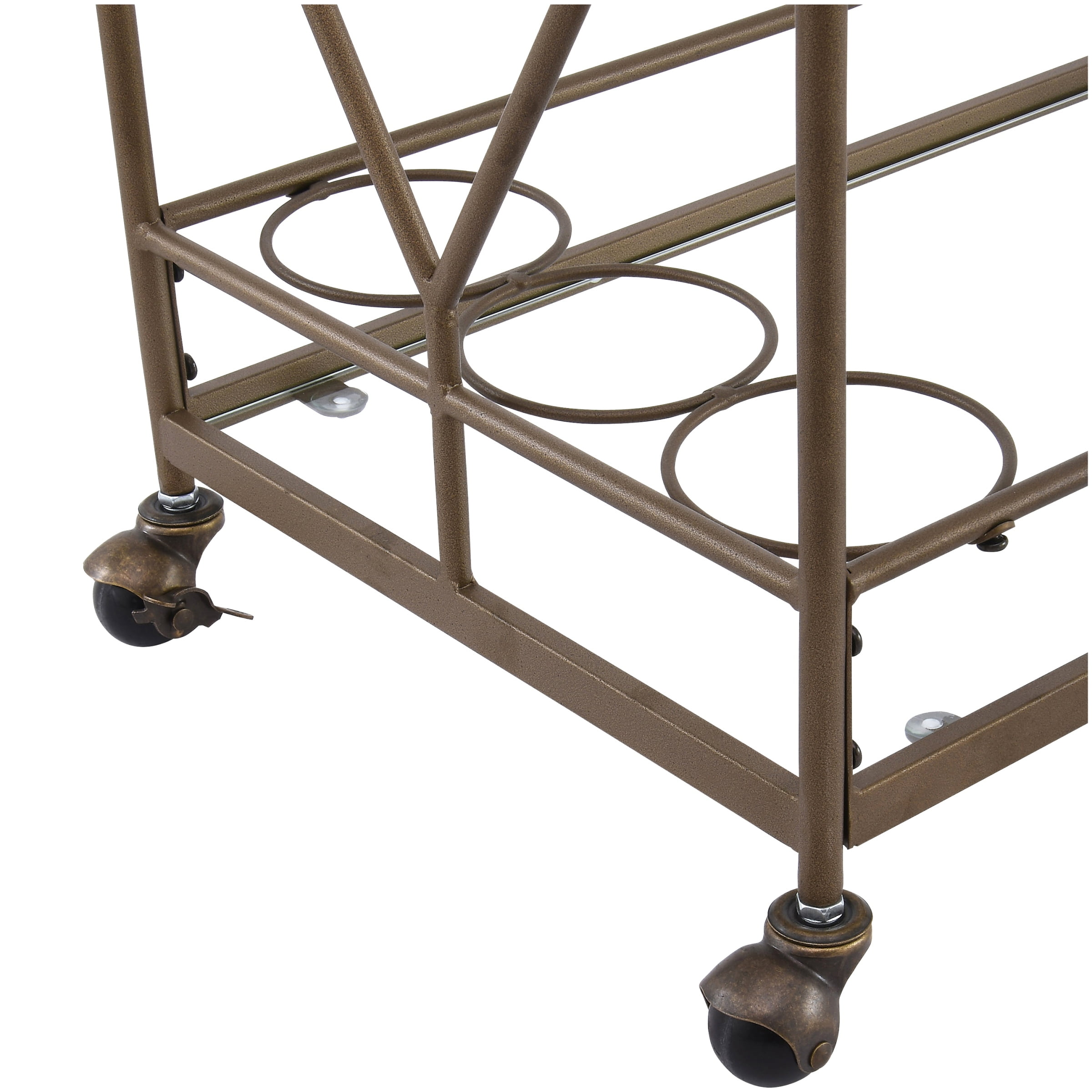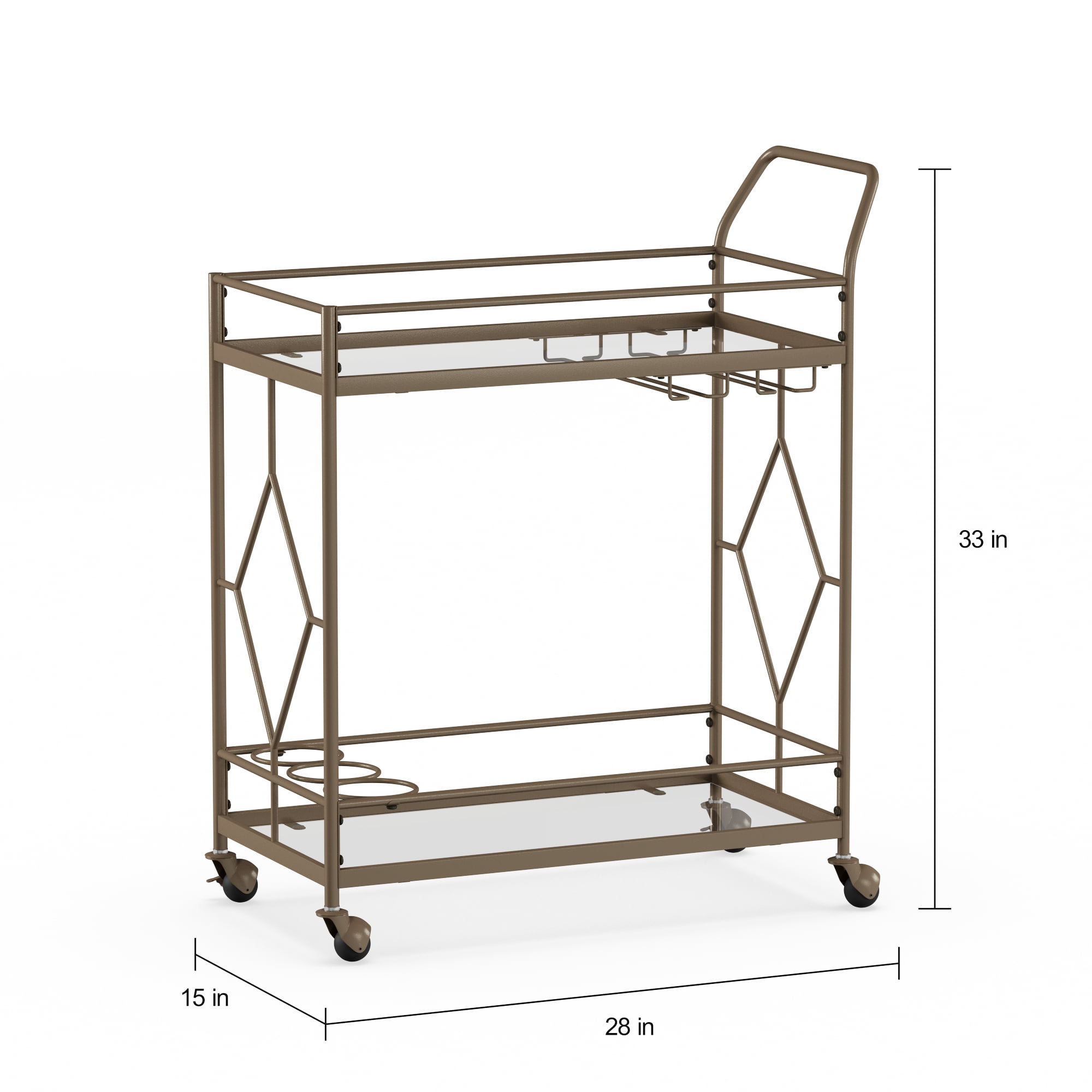 Golden bronze metal frame Dimensions: 27.68″ W x 14.57″ D x 32.76″ H 2 Levels of shelf space Rolling and locking casters 3 Bottle holders