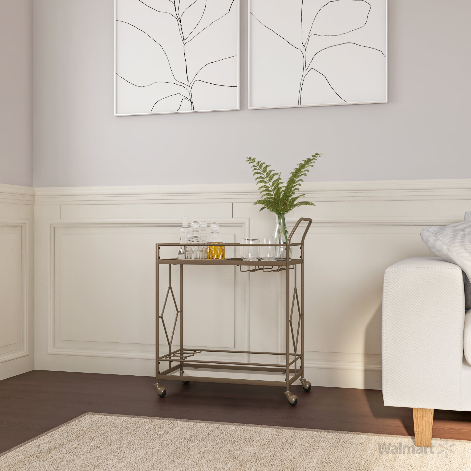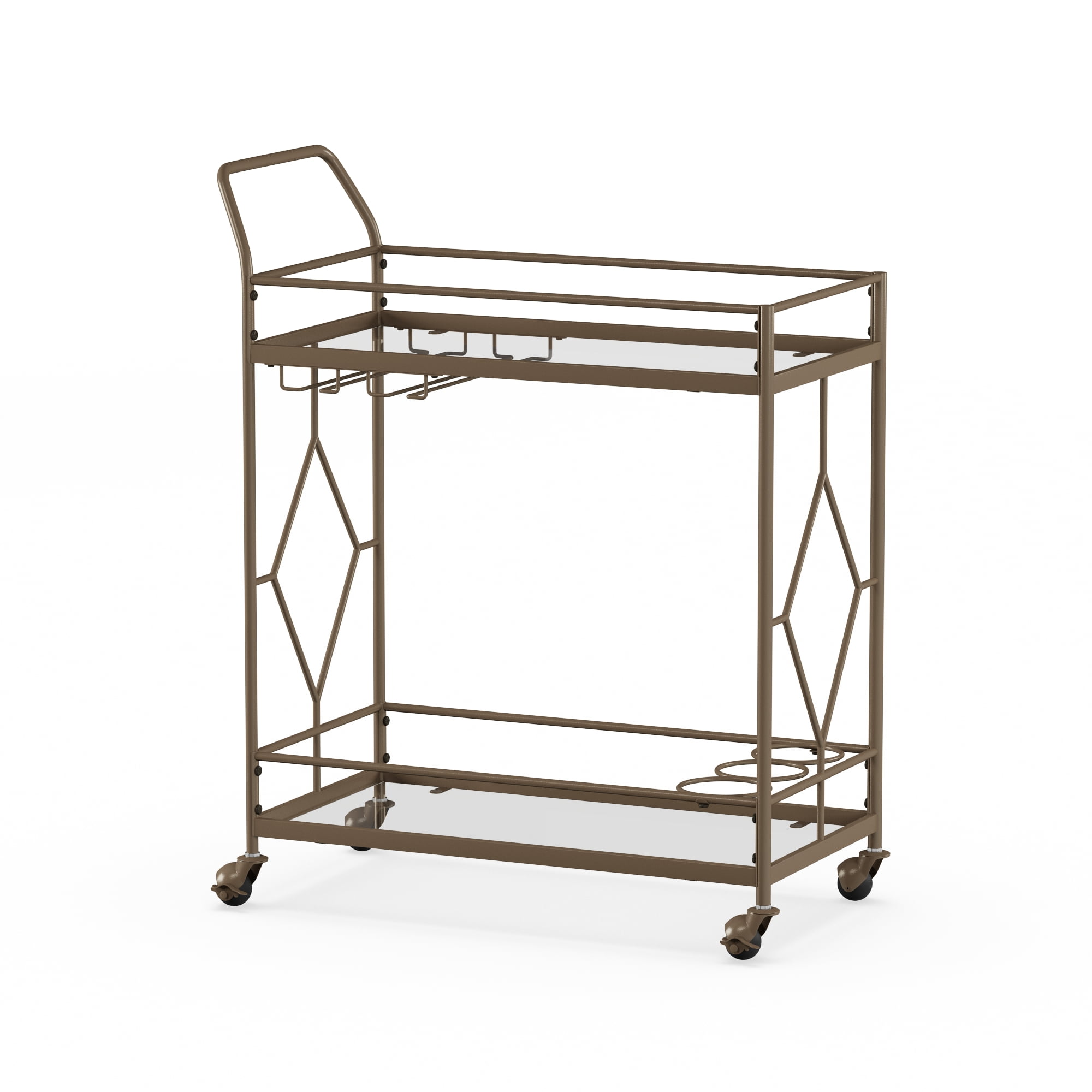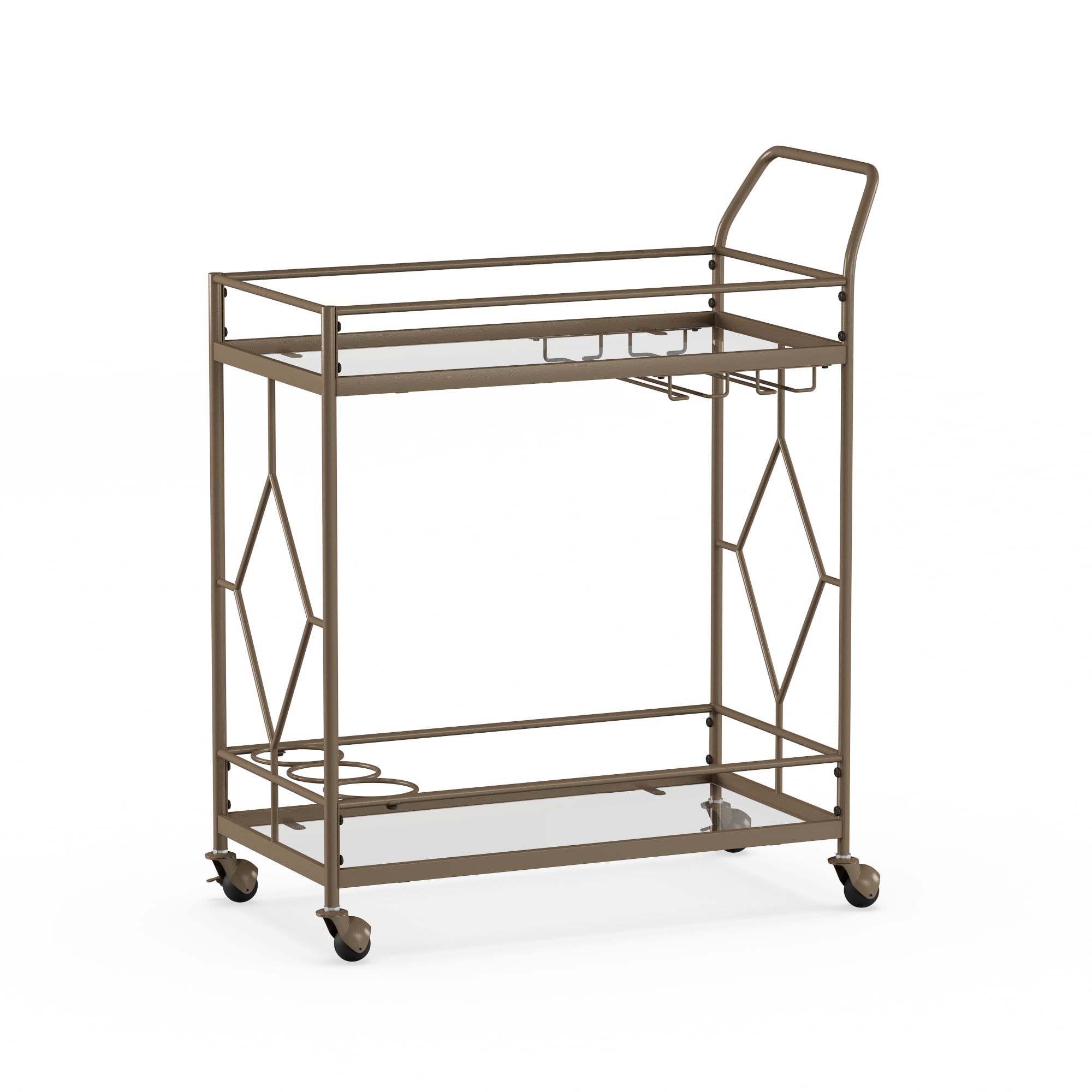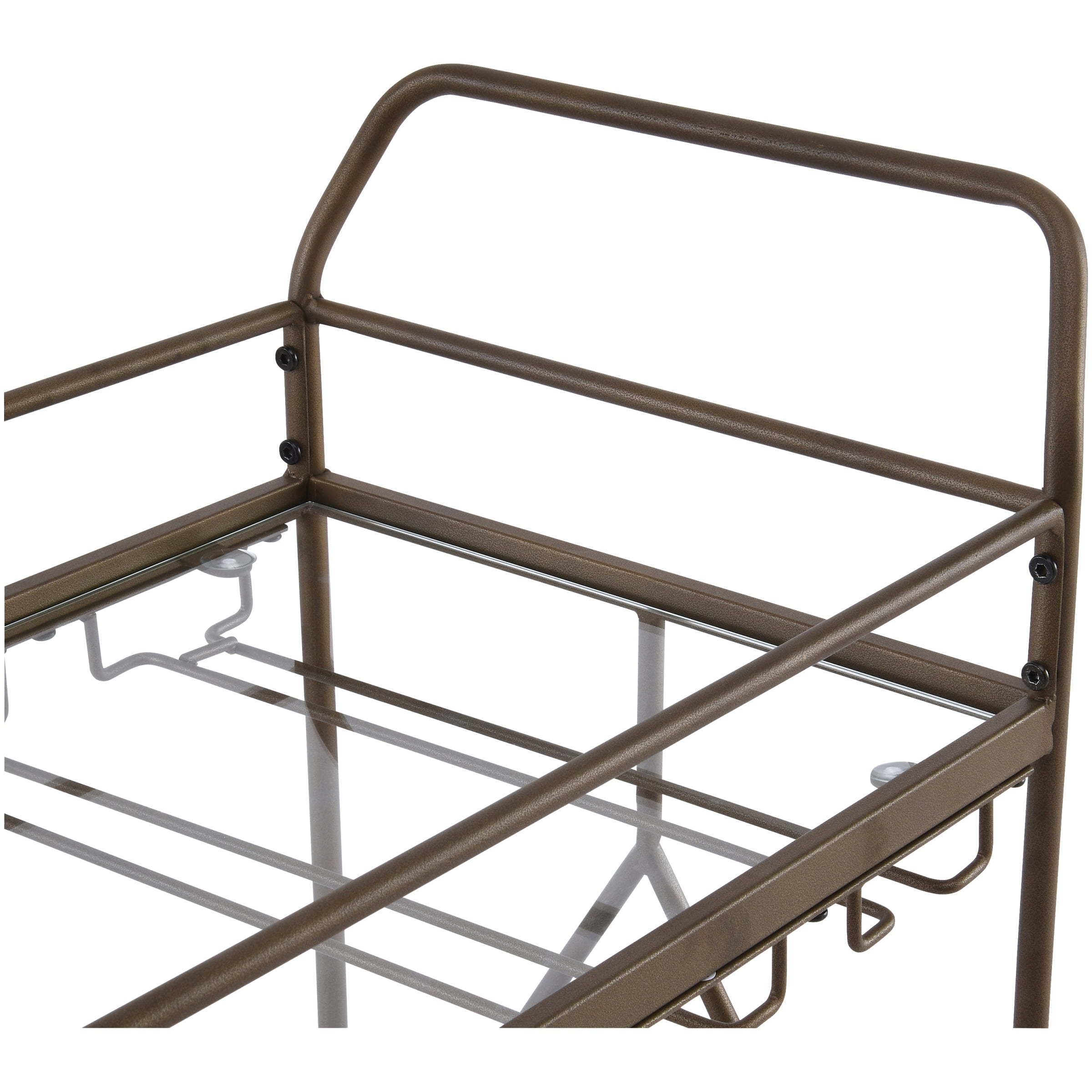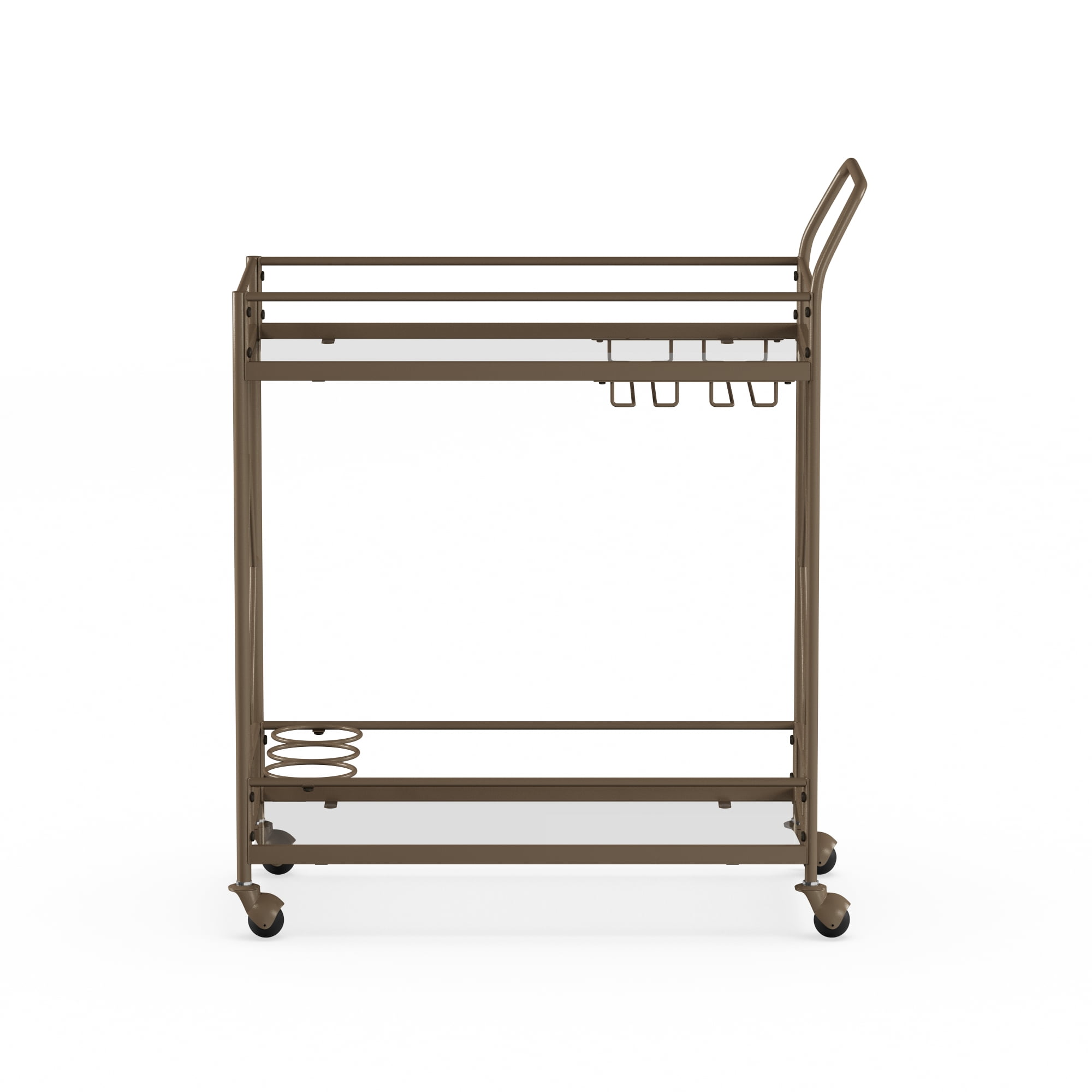 Golden bronze metal frame Dimensions: 27.68″ W x 14.57″ D x 32.76″ H 2 Levels of shelf space Rolling and locking casters 3 Bottle holders